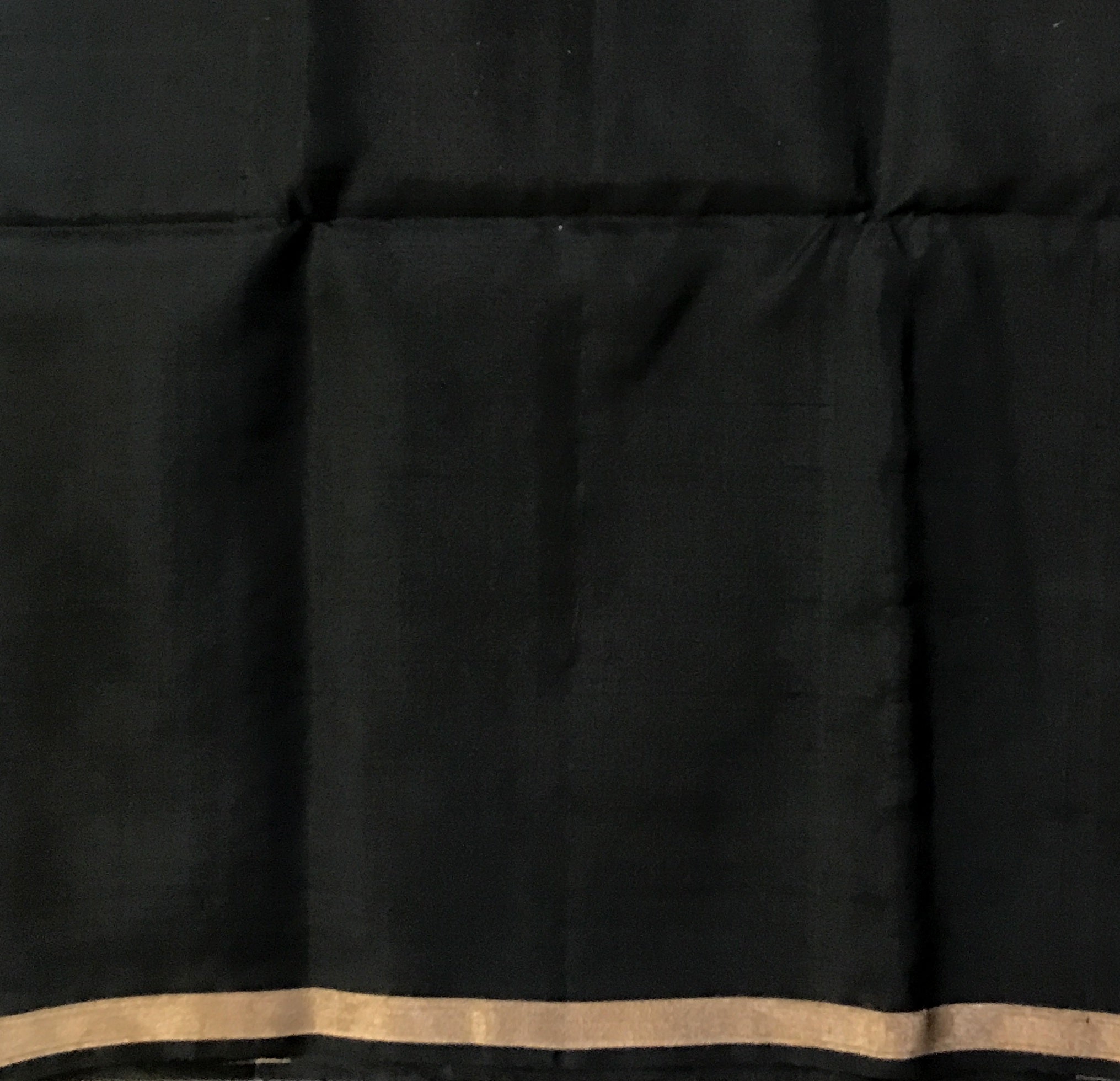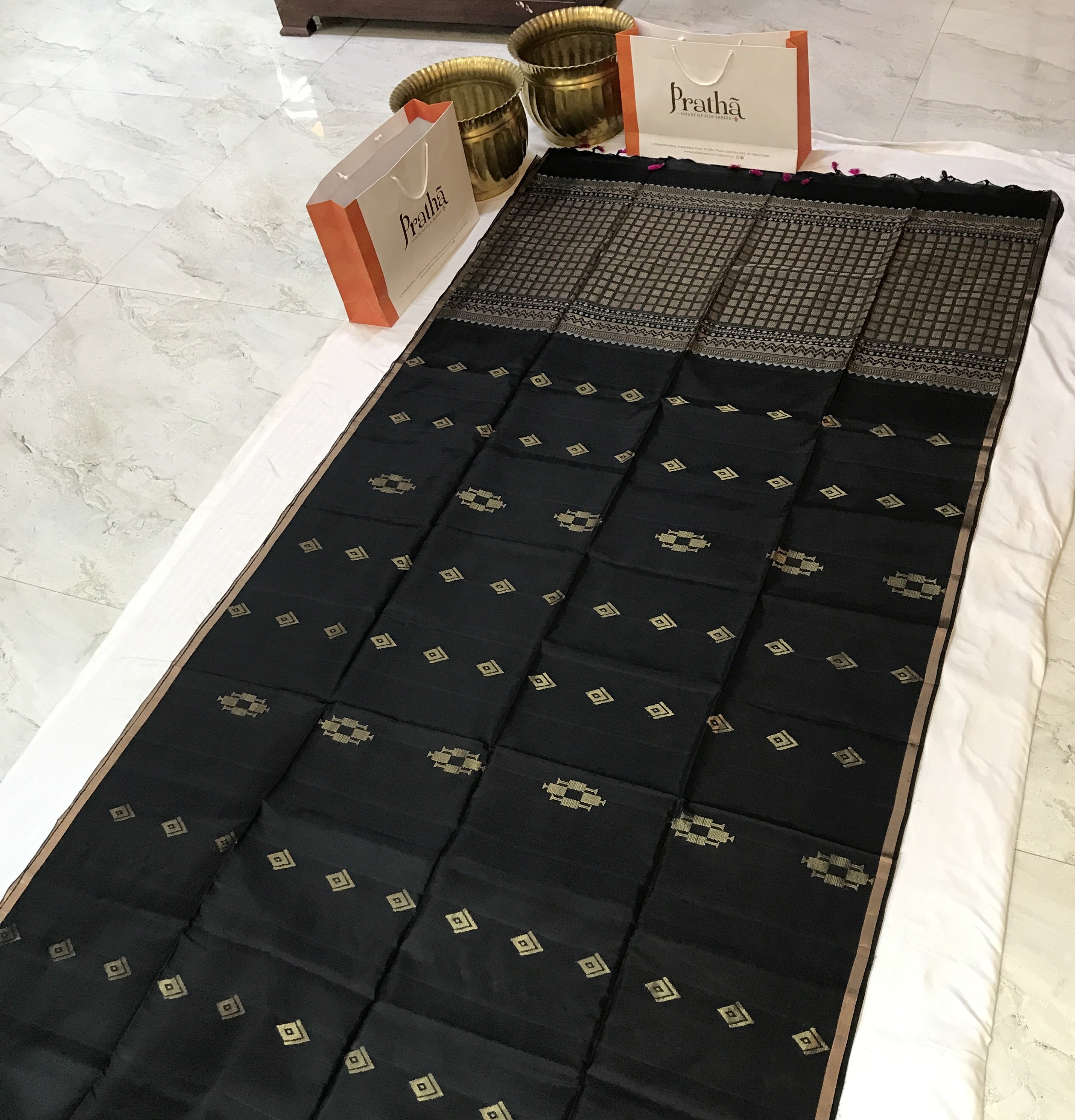 A lovely shade of black Soft Silk always wins hearts, especially when it teams up with a golden zari at its pallu looks fantastic can be worn during the day as well as at night! Do not miss this saree has a very beautiful small-big butti design woven in golden zari and charming zari pallu looks beautiful.