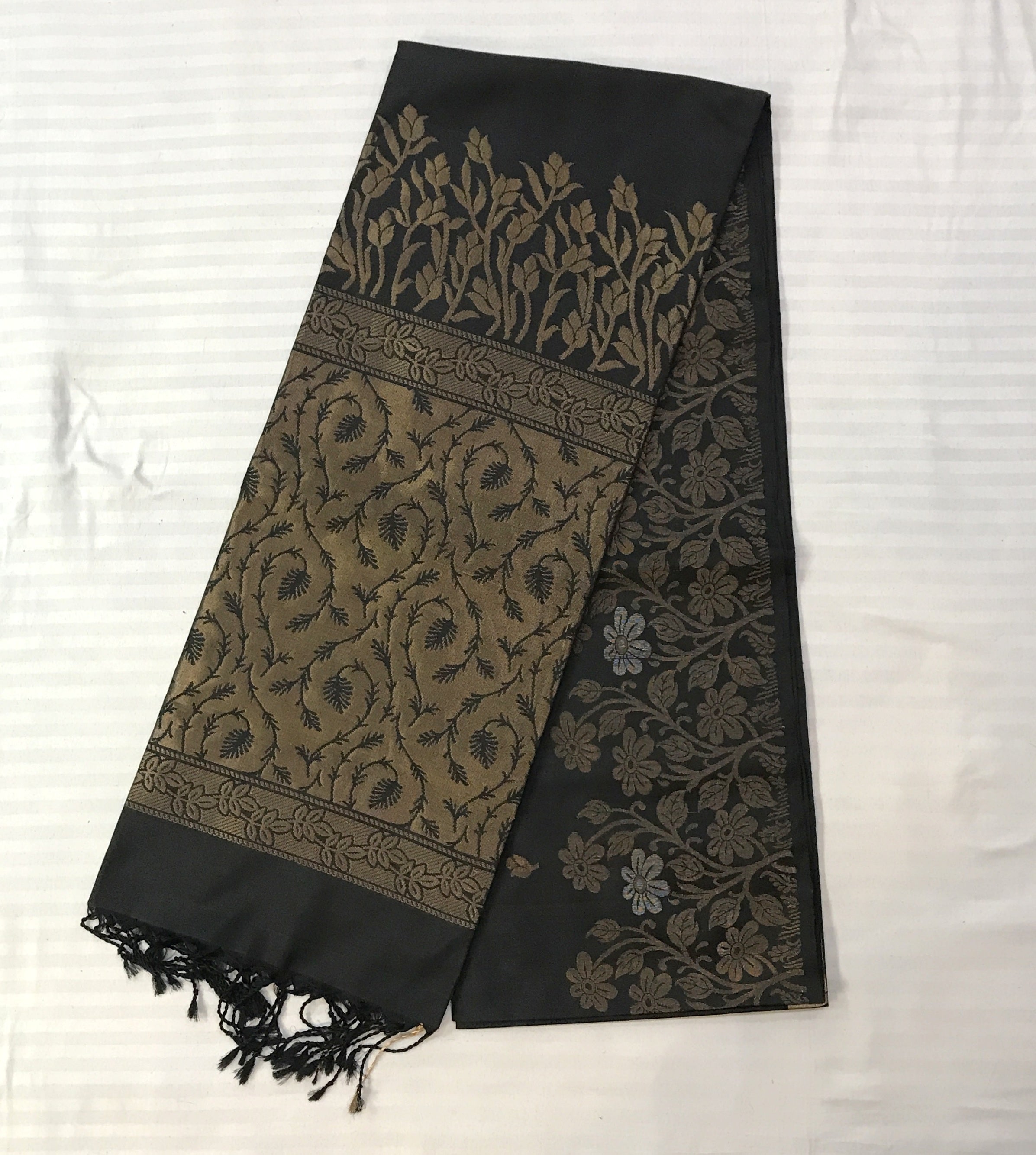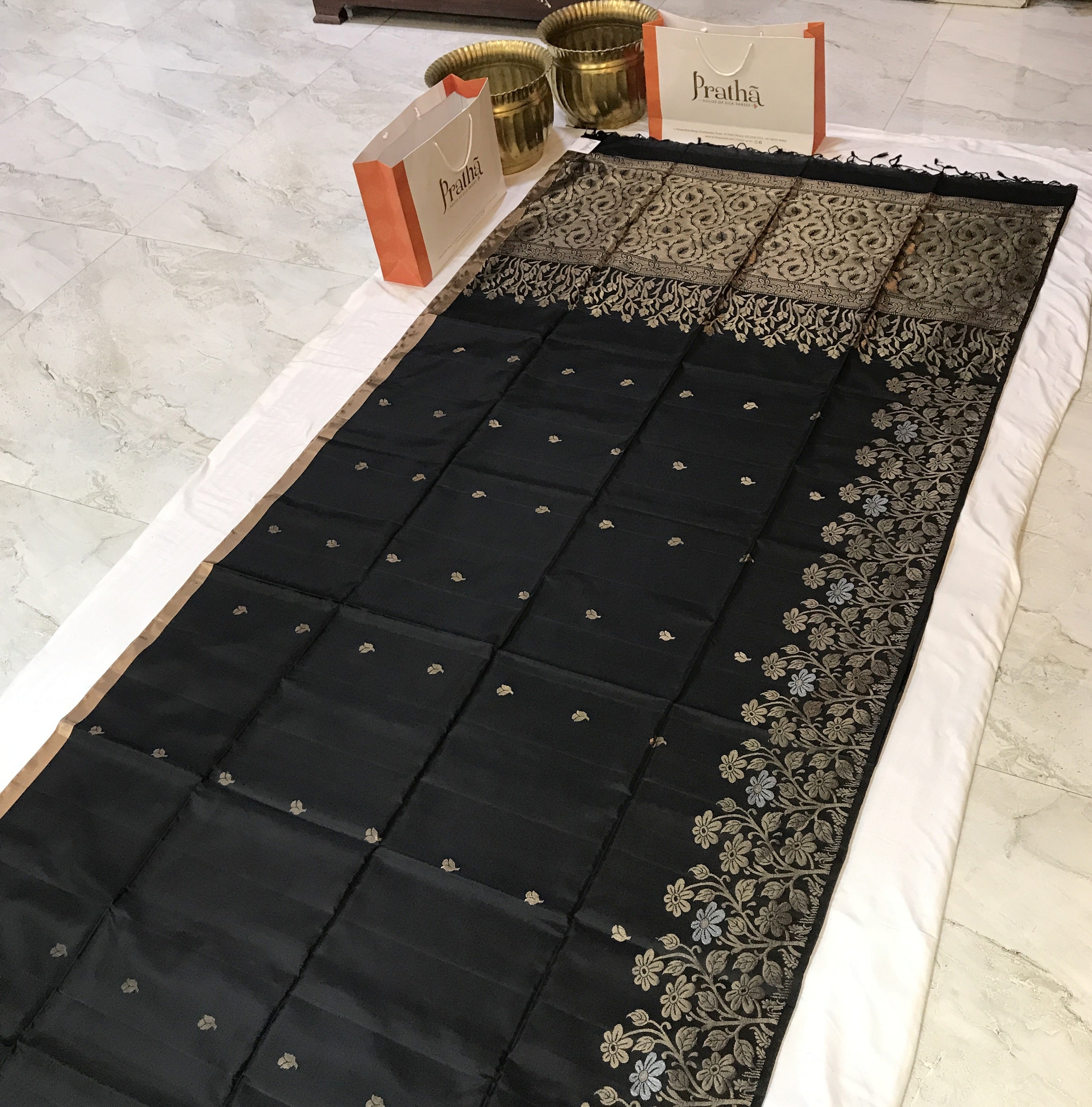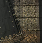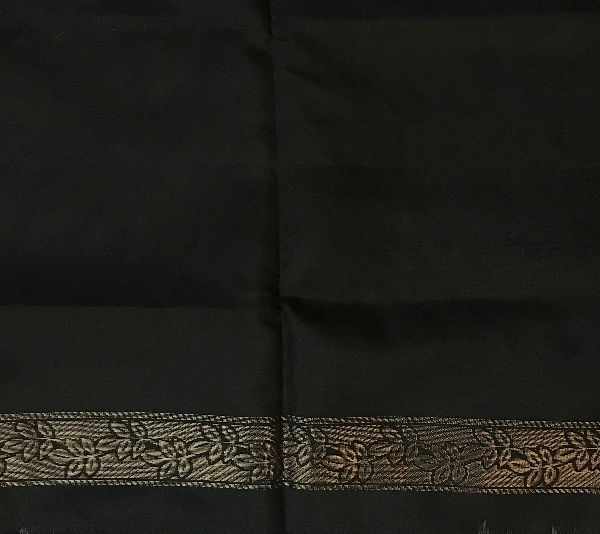 This black colour saree has a small floral shape butta along with a beautiful intricate design golden zari border. This Soft Silk saree flaunts beautiful brocaded design pallu in self color this weave a classy feel. Comfortable to wear and easy to drape this saree is look special. This black color makes this saree a prefect casual or party wear.