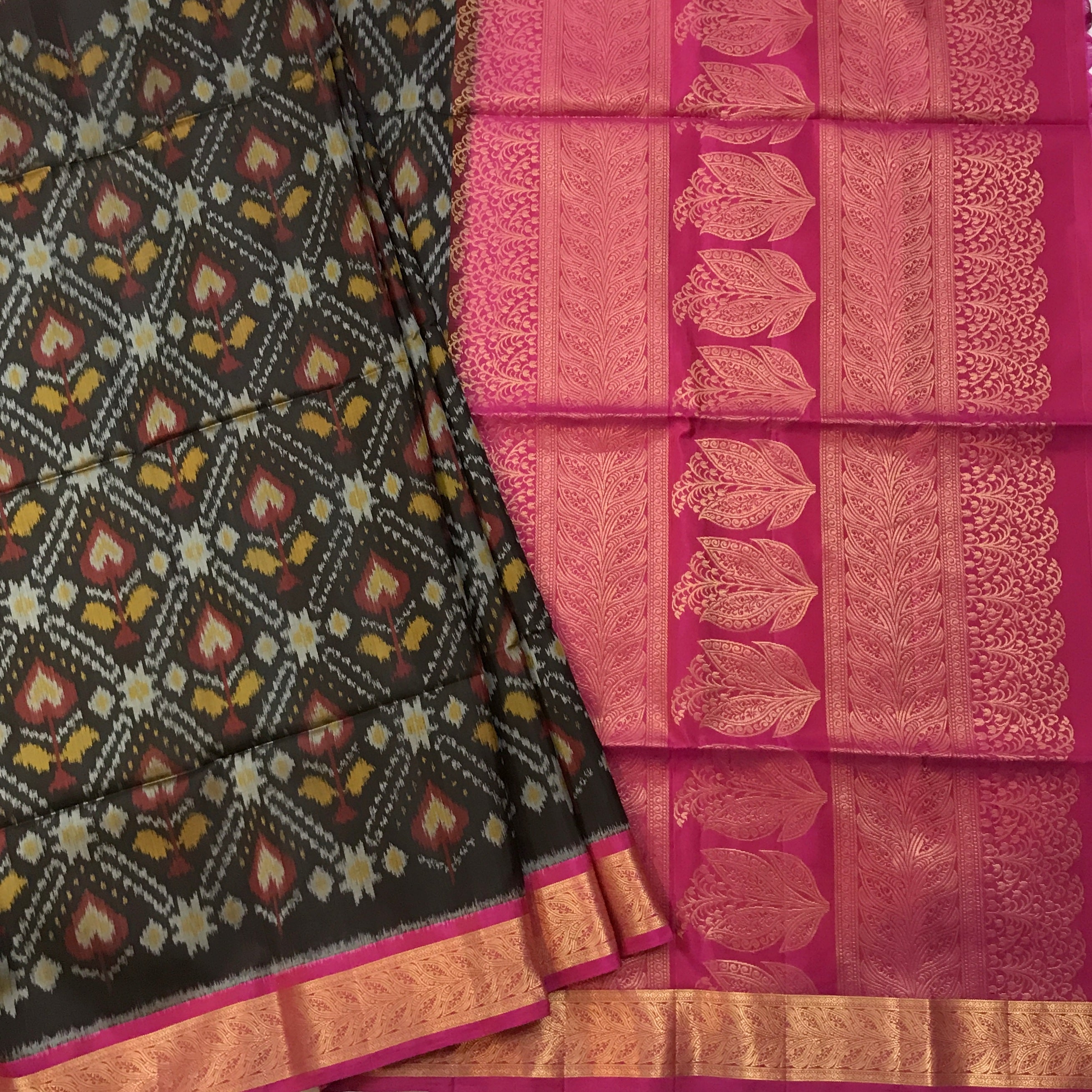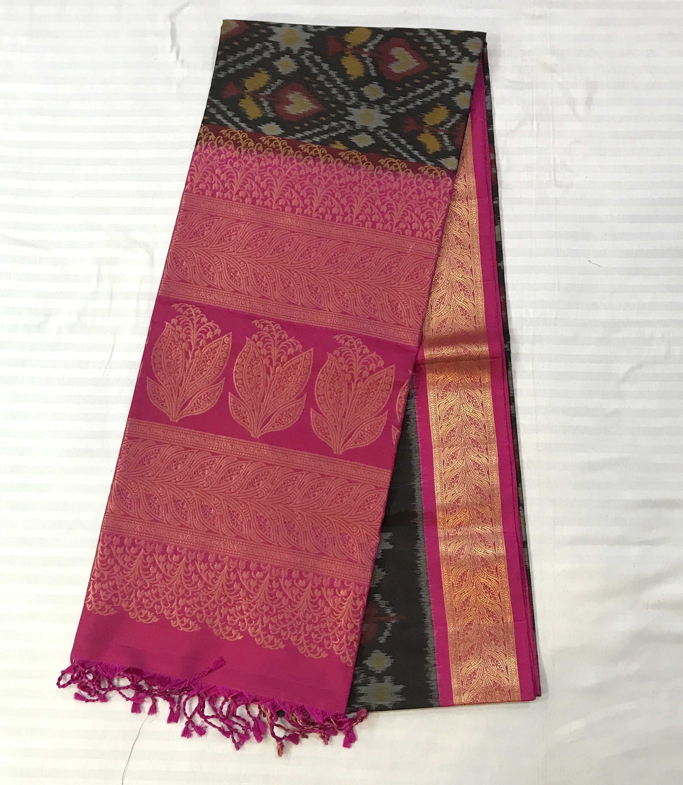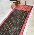 A very pretty shade of black Soft Silk Ikat saree with its Ikkat design all over the saree , perfect saree for summers! Don't miss the pink coloured golden zari design traditional border is looks very beautiful with charming design golden zari pallu. Light in weight and easy to drape.