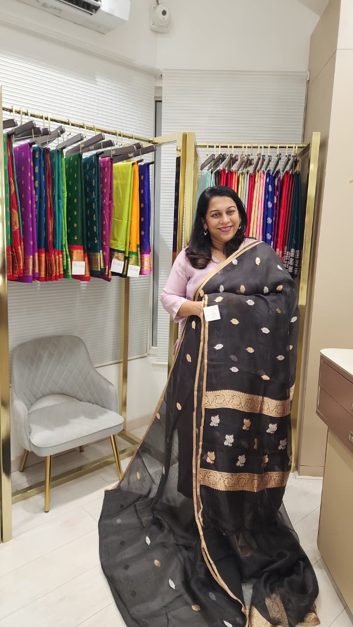 A stunning black tissue Banarasi saree featuring delicate gold and silver zari buttas and an elegant woven border. Its sheer, lightweight texture paired with rich Banarasi detailing creates the perfect blend of subtle shine and timeless grace.