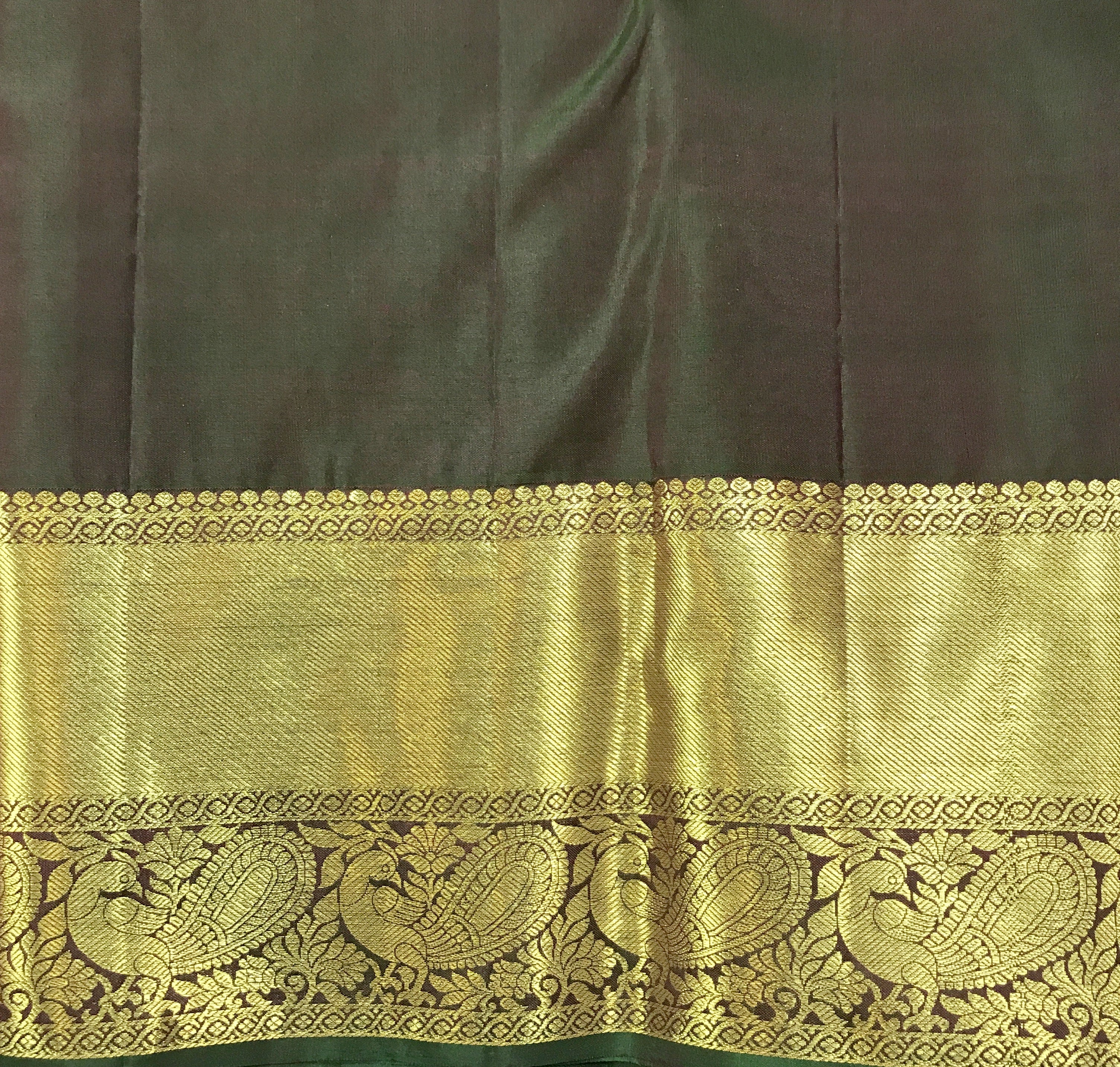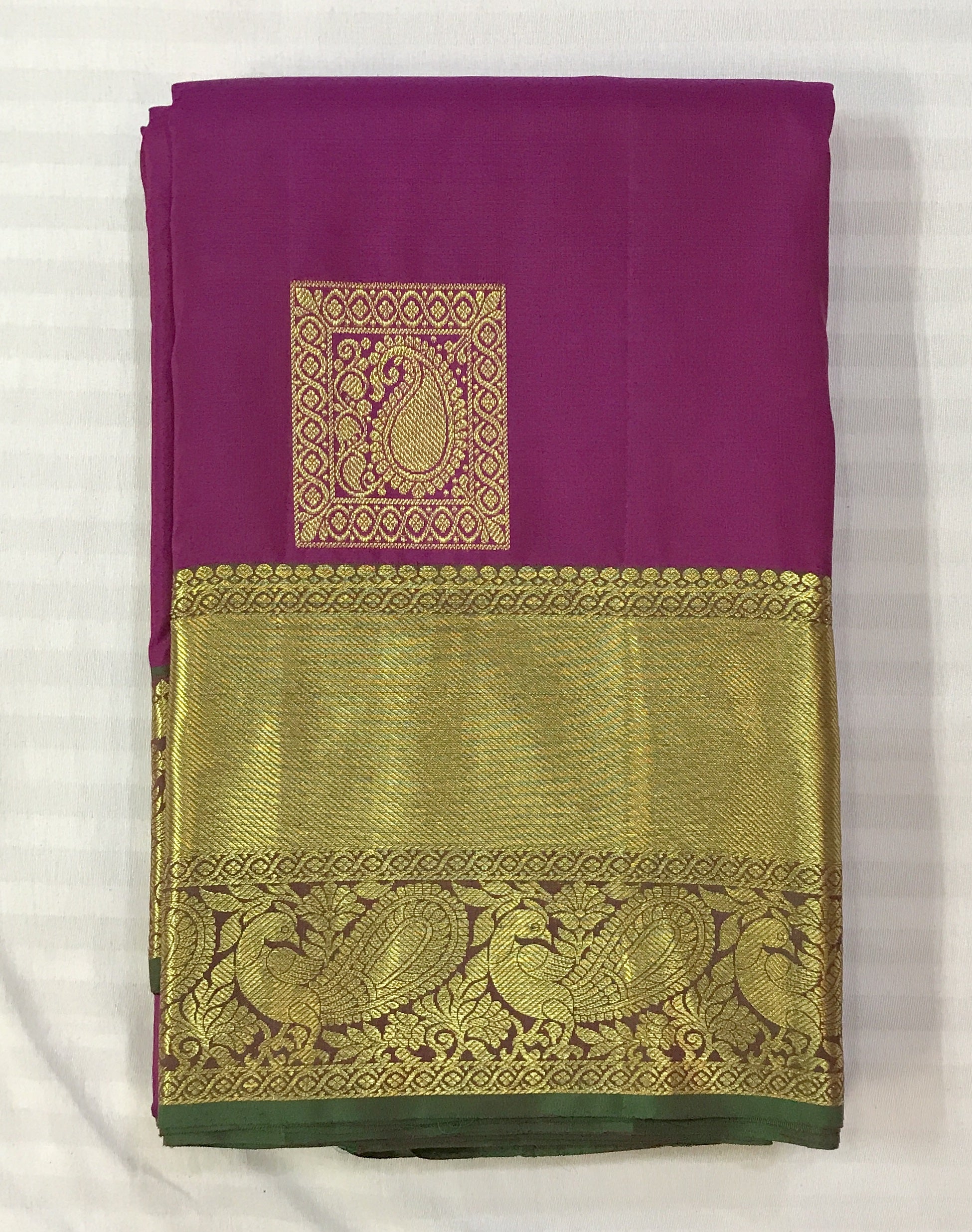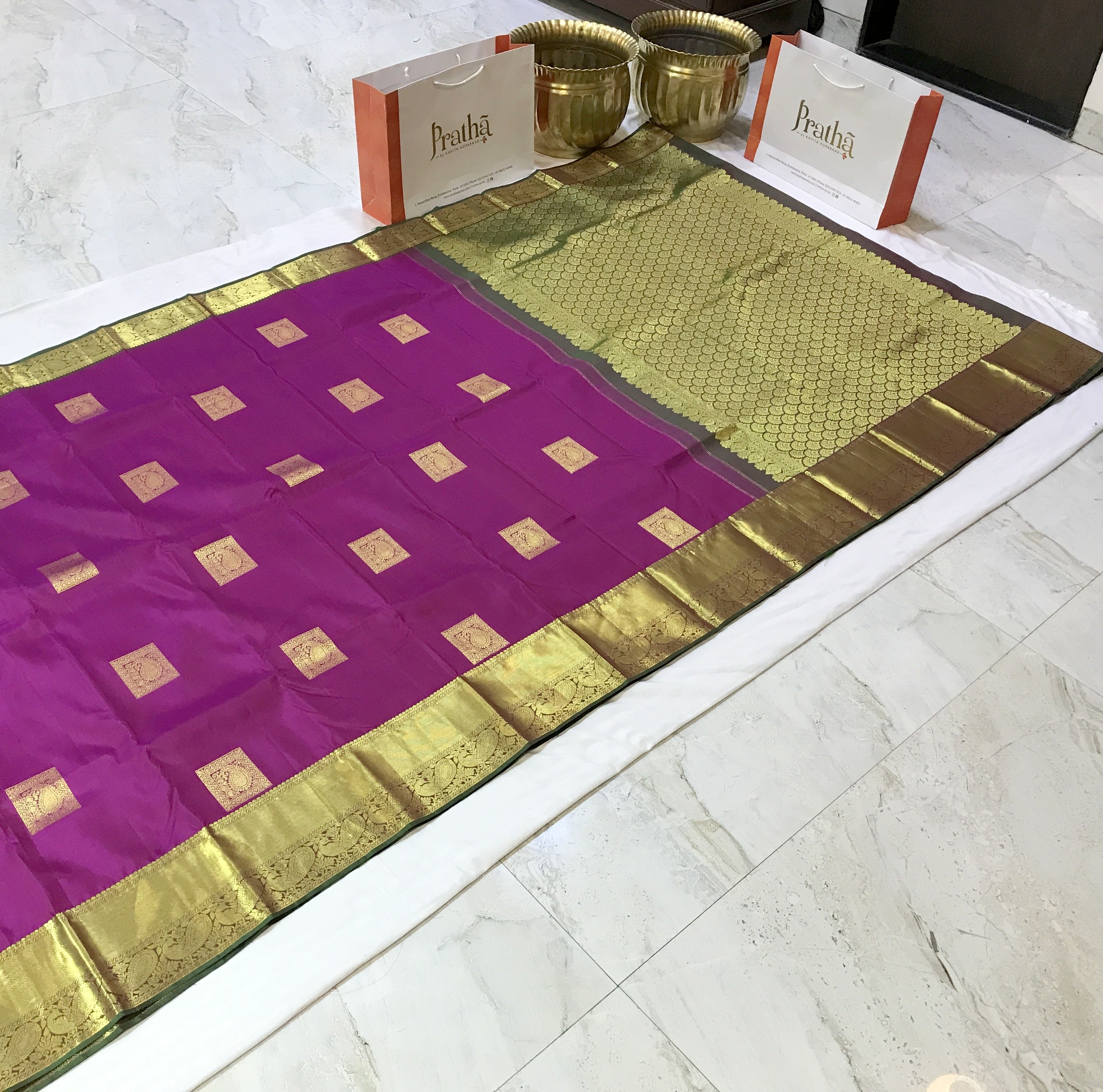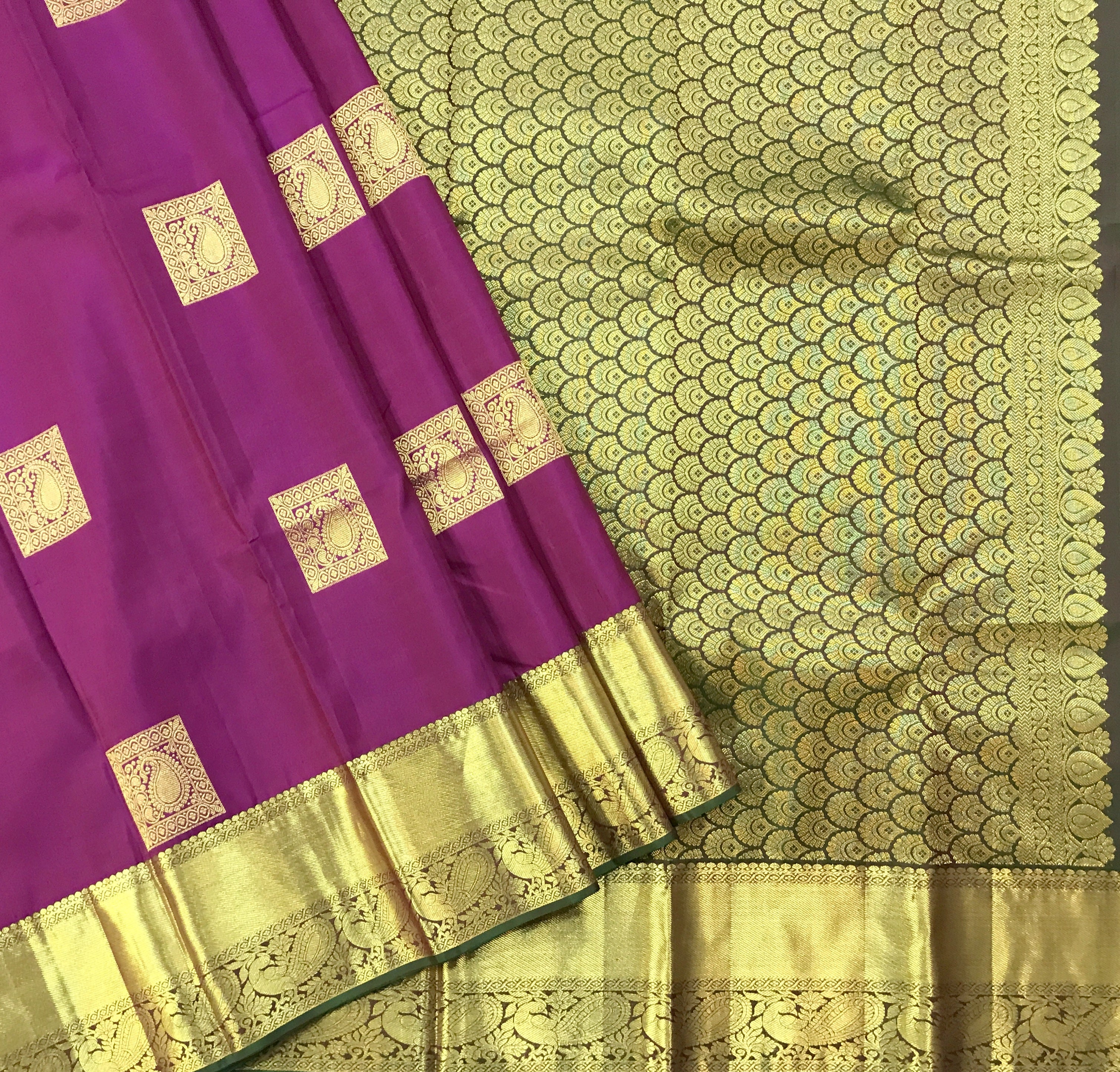 A intresting shade of pink-magenta Kanjeevaram with broad golden zari border, both vibrant, complement each other beautifully in this saree. This lovely colour combination always looks great! The intricate big square shaped butti woven in copperish zari, with winebroad border and richly woven Pallu make this weave a classic! Thanks to its beautiful colour with the combination of pink, this Kanjeevaram will look great in the day as well as at night!
