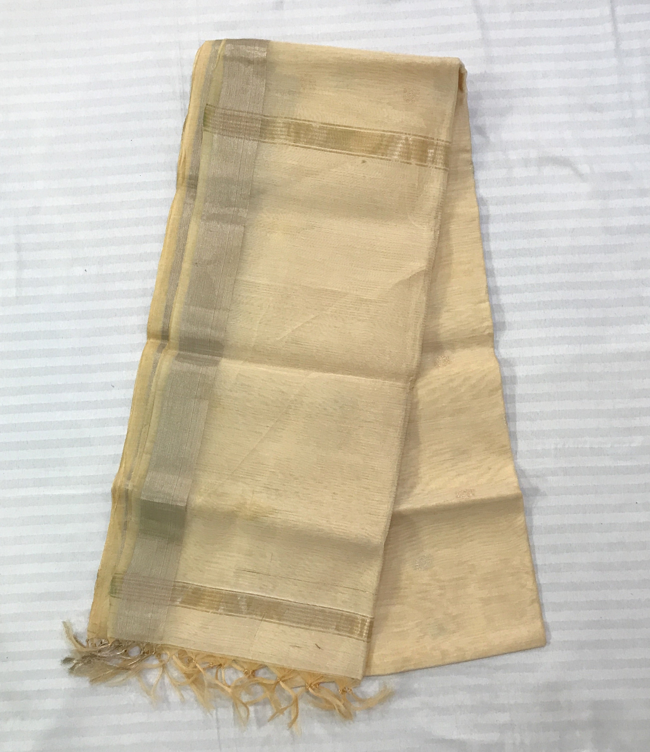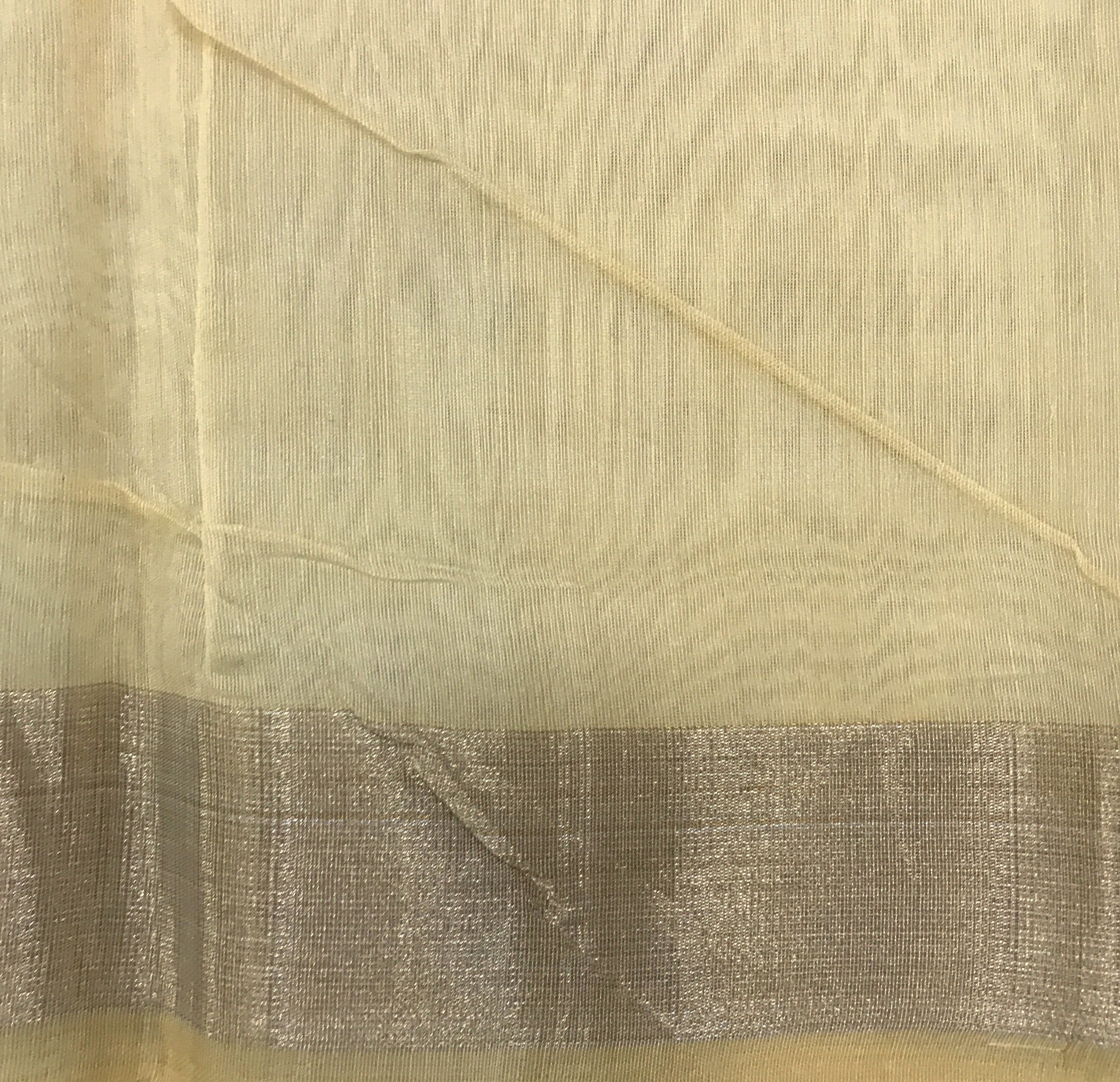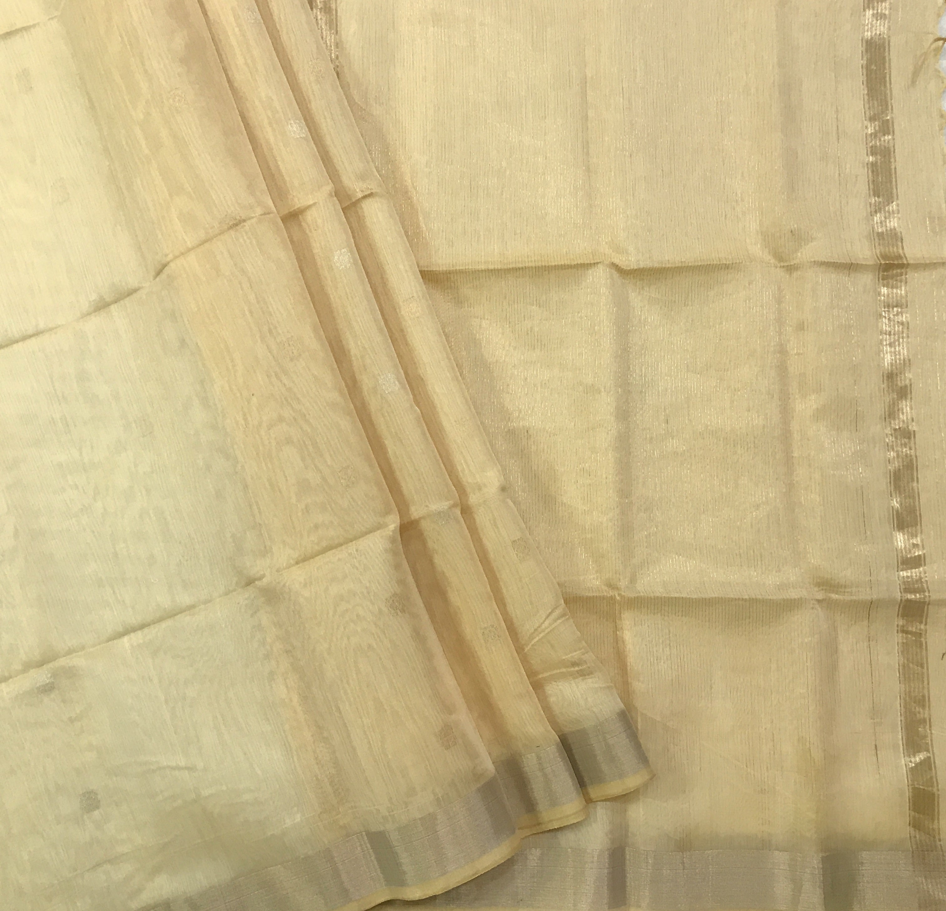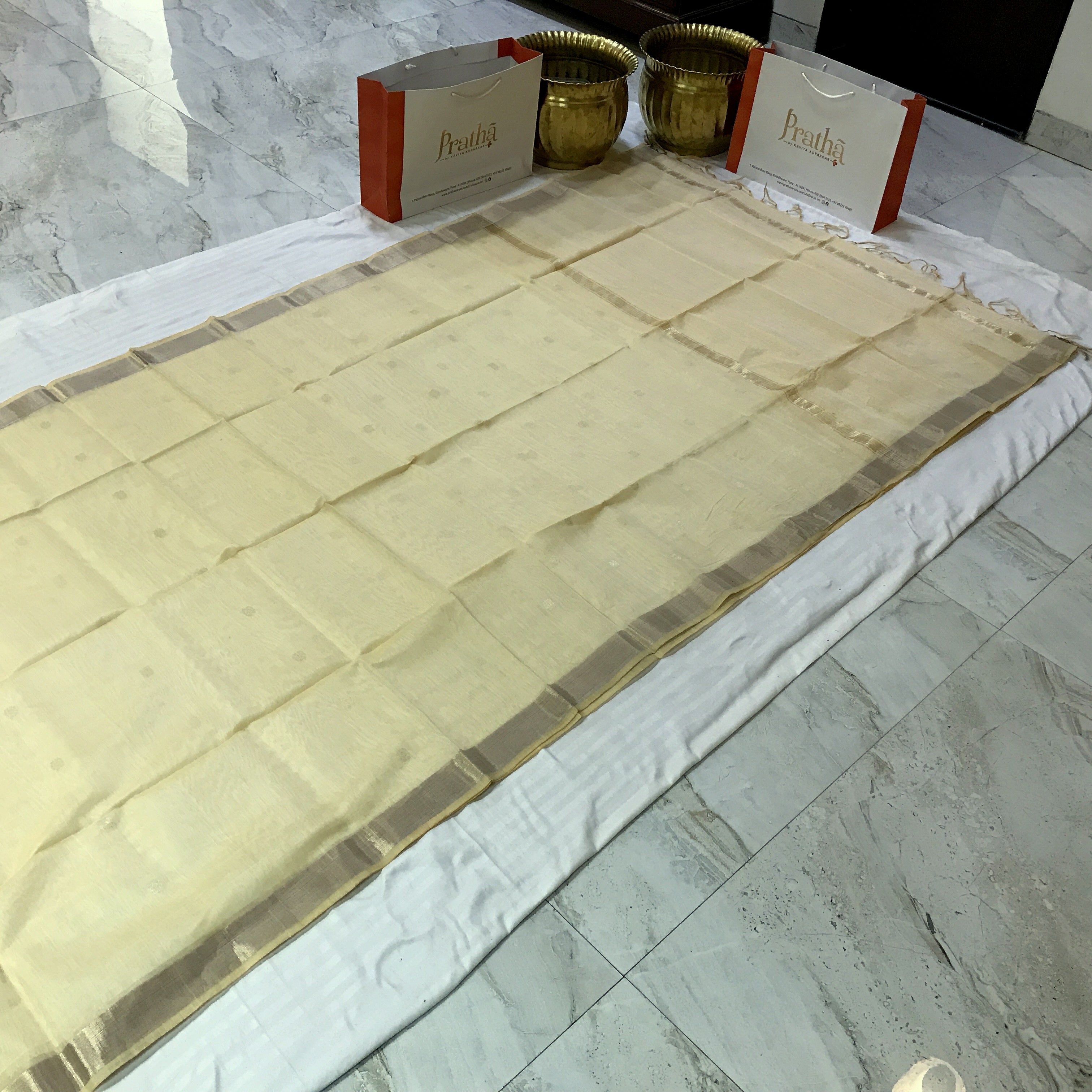 The perfect saree of those who love combination which are off beat! A stunning shade of shining off-white Silk Cotton Traditional with a beautiful floral butti woven in golden-silver zari with zari border looks very outstanding with self coloured pallu. Light in weight and easy to drape. perfect saree for summers!