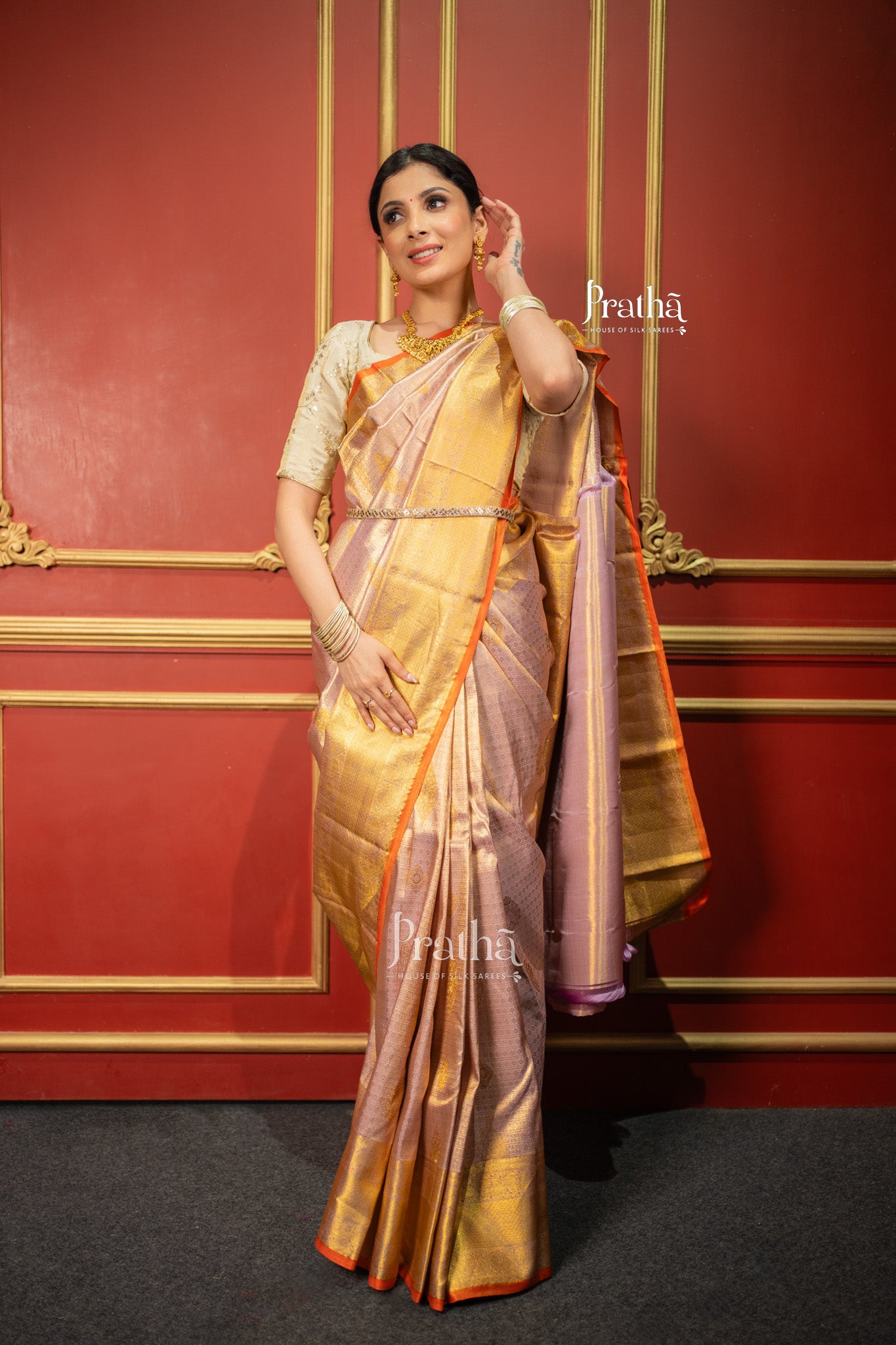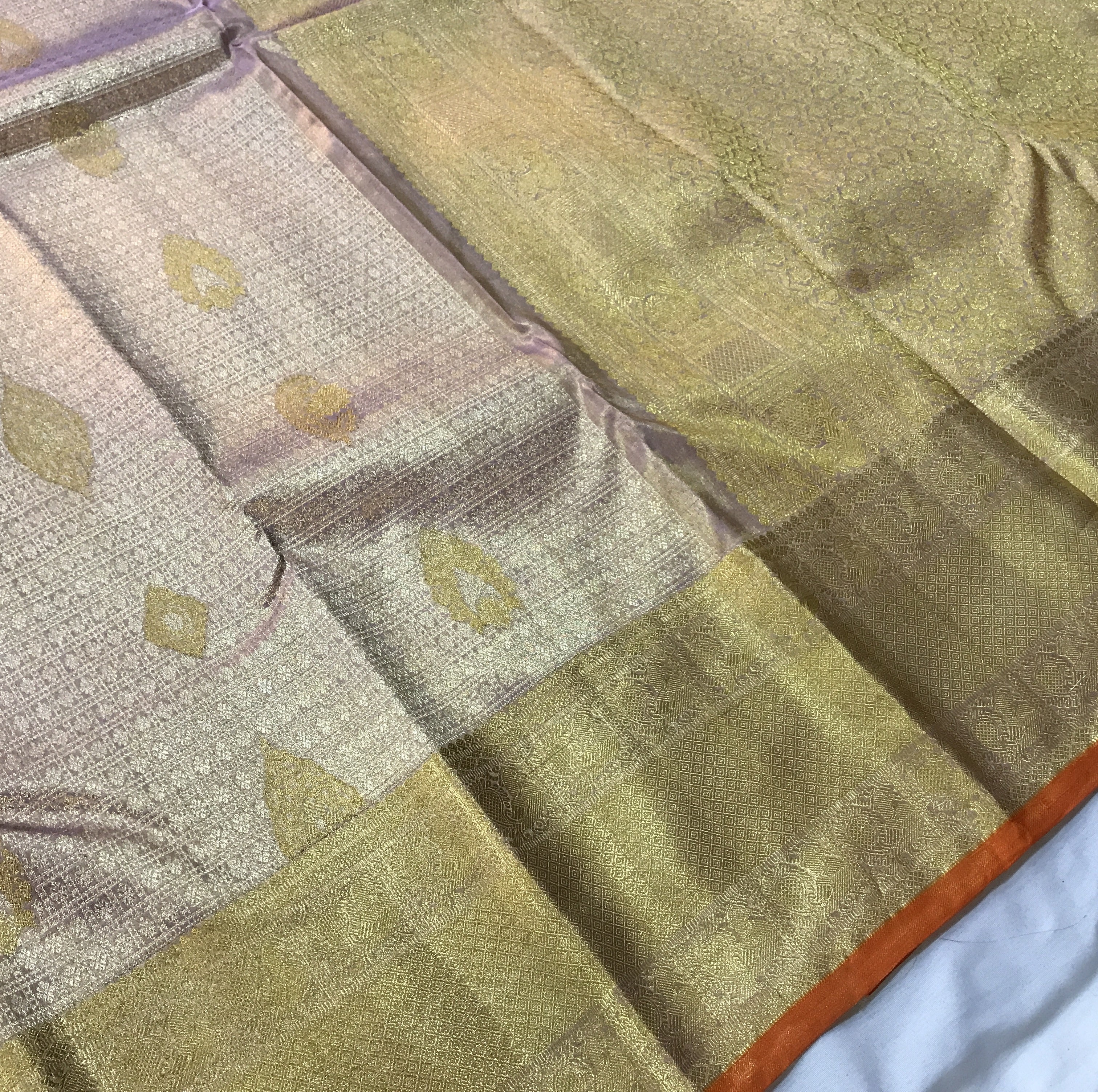 This exquisite Kanjeevaram saree radiates a lustrous golden glow, woven to perfection in pure zari on both the warp and weft. The uniform golden sheen is both soothing and luxurious, making it a true masterpiece. The subtle plain golden zari border and pallu add an element of divinity, enhancing its elegance. What truly sets this saree apart are the delicate butti motifs, intricately woven in contrasting pinkish reshim thread, adding a touch of timeless beauty to this golden treasure. Perfect for any occasion, this Kanjeevaram is a symbol of grace and sophistication.