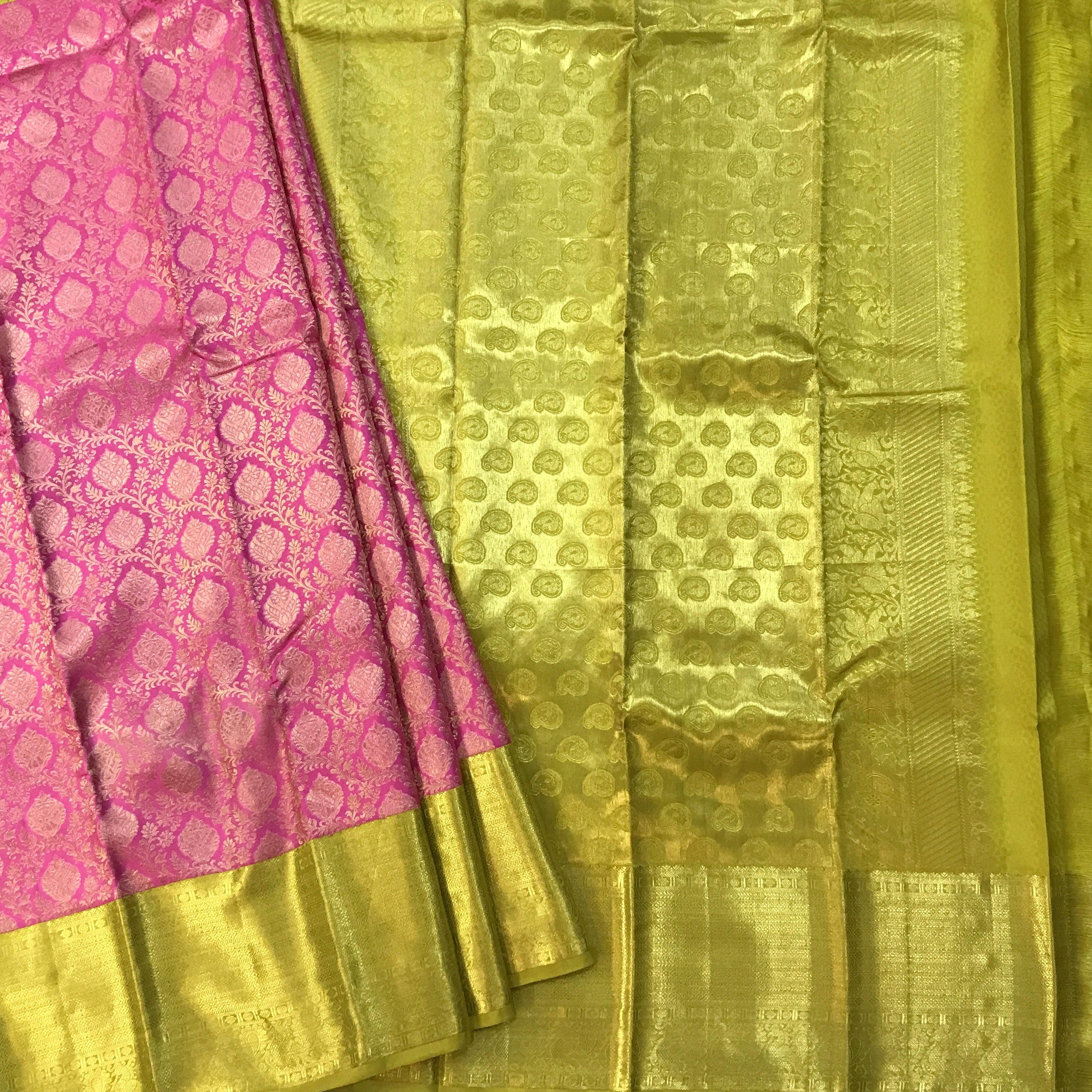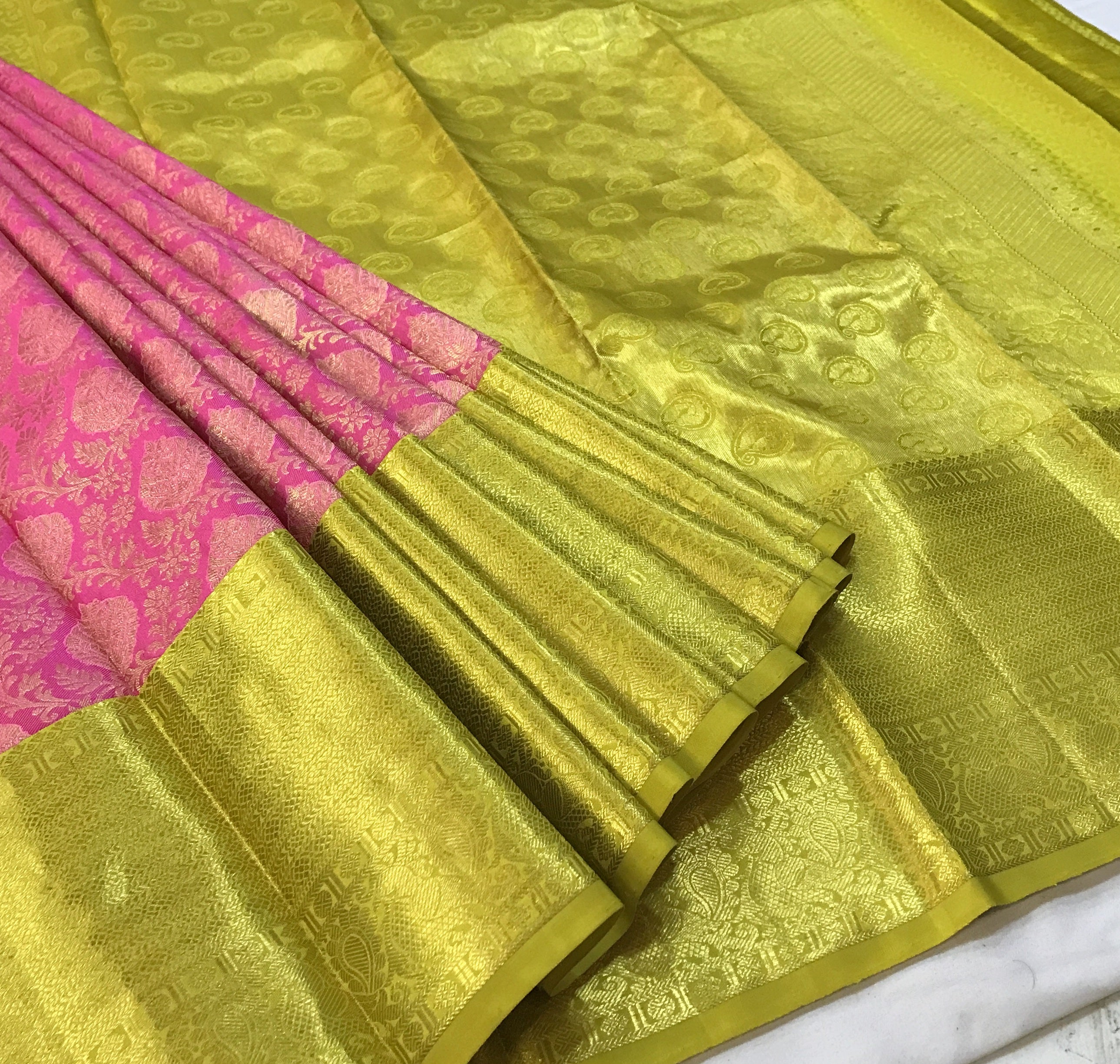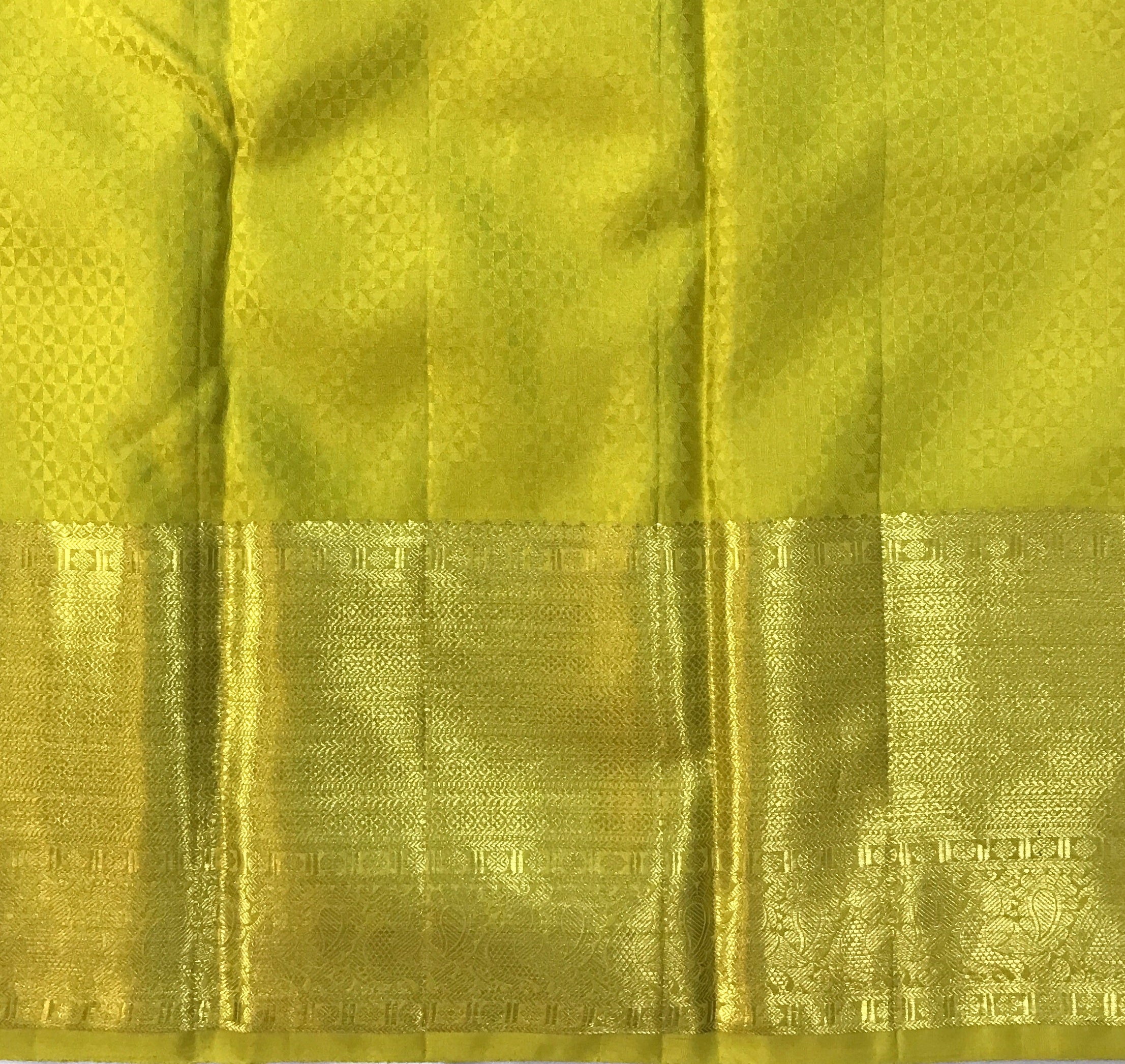 Blouse Colour: Contrast( Plain yellow-green with golden zari border )