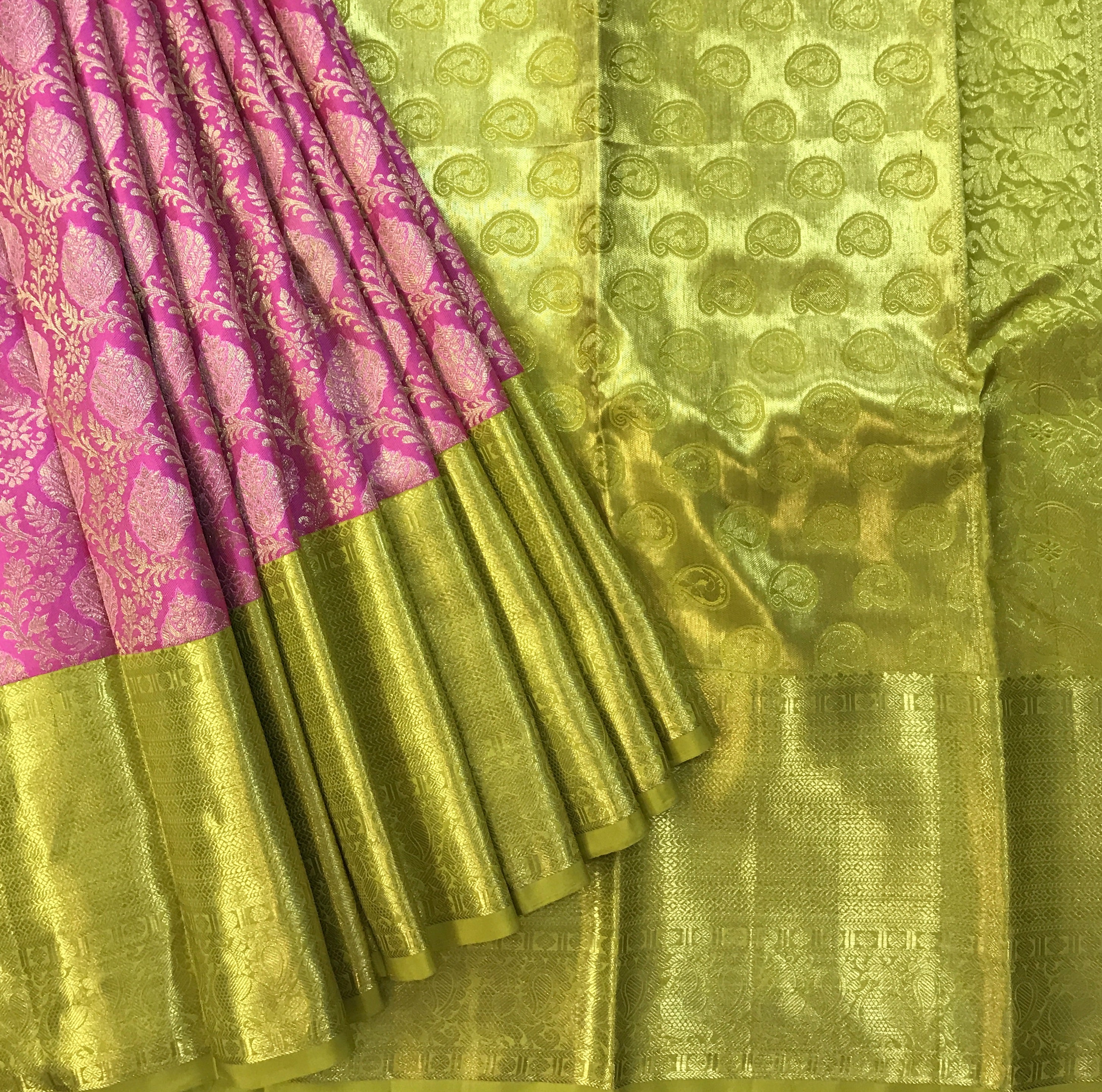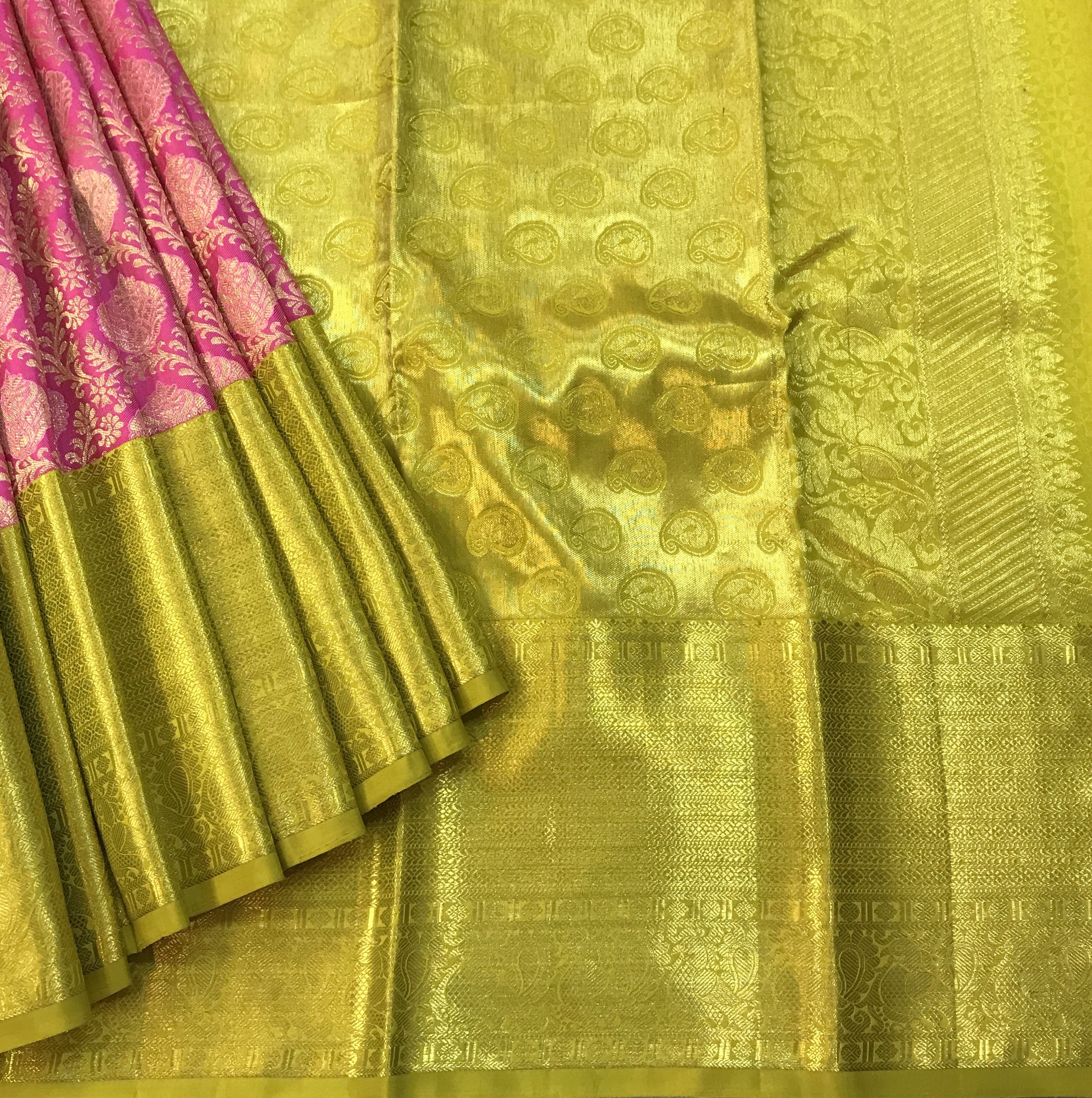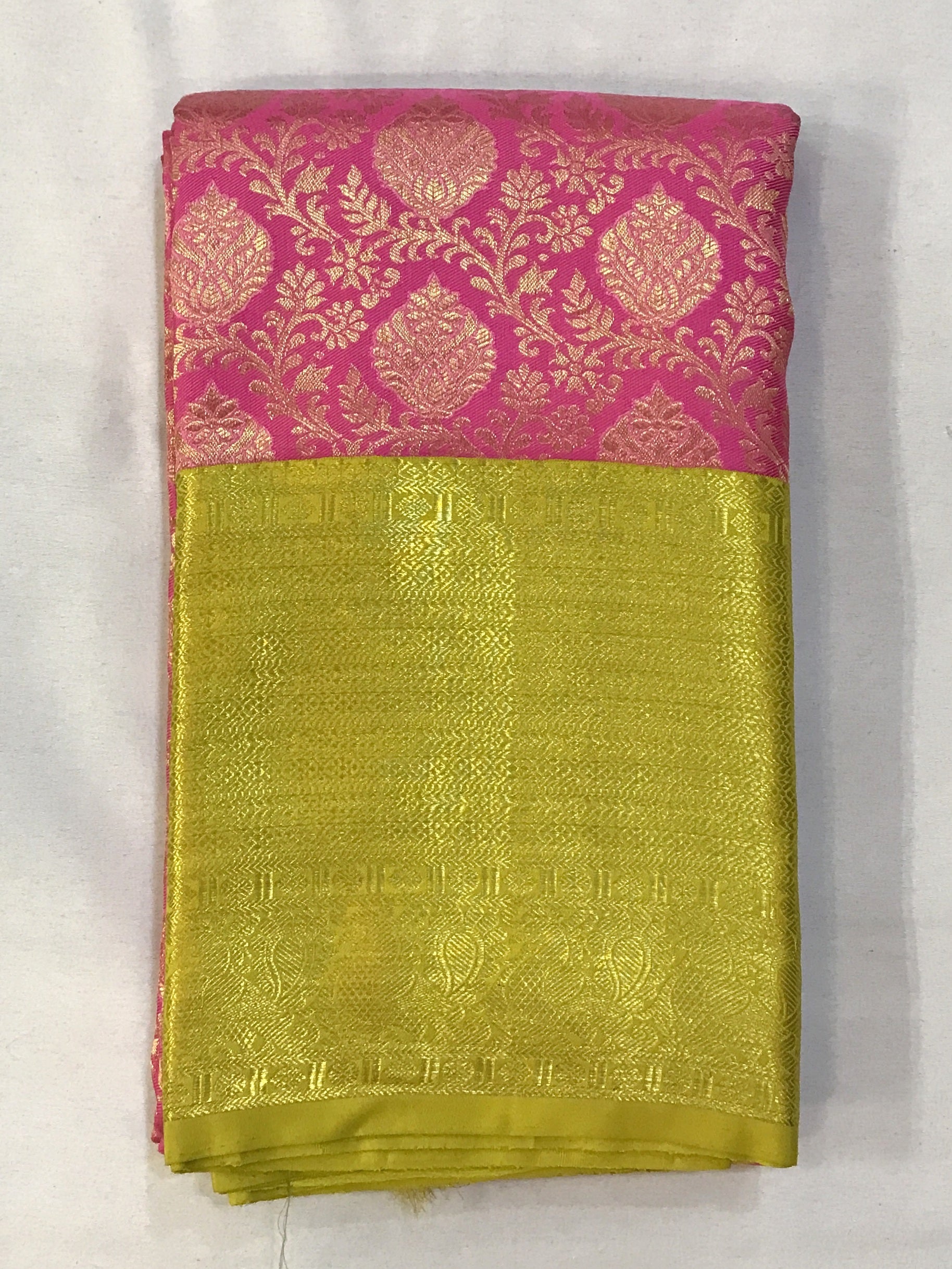 Blouse Colour: Contrast( Plain yellow-green with golden zari border )