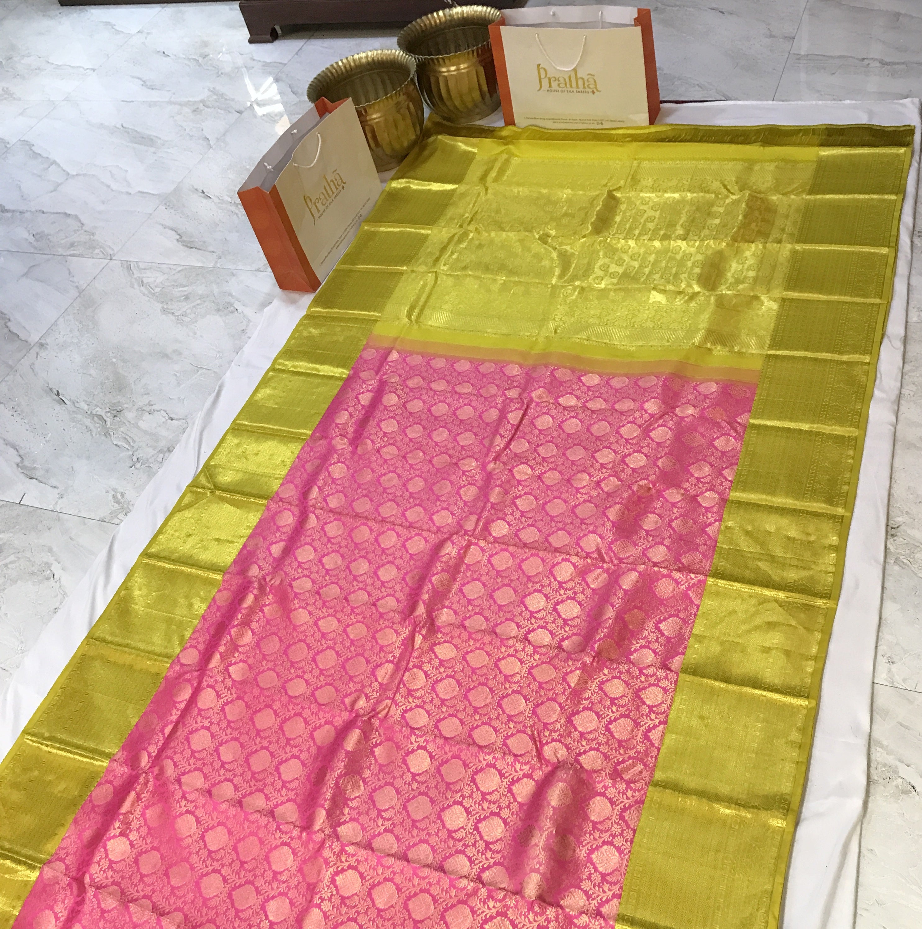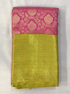 This saree truly embodies elegance and splendor! With its rich shade of bright pink intricate brocade patterns, and the exquisite yellow-green zari adorning the border, it’s a masterpiece meant to be treasured across generations. The yellow-green zari pallu adds a vibrant touch, enhancing its timeless appeal. This pure zari Kanjeevaram is undoubtedly a jewel in Pratha's collection.