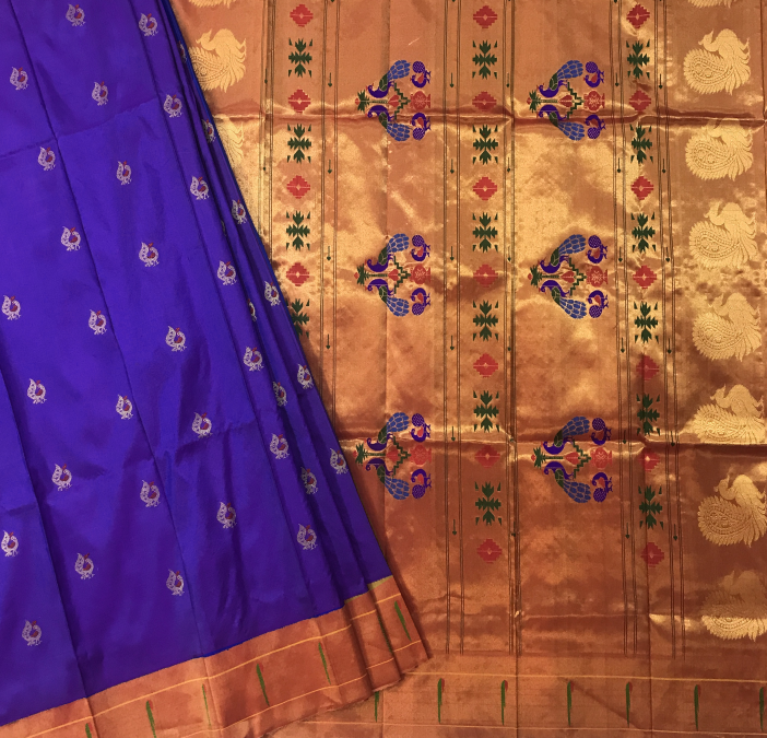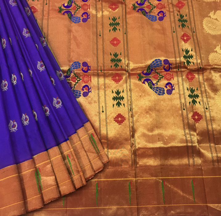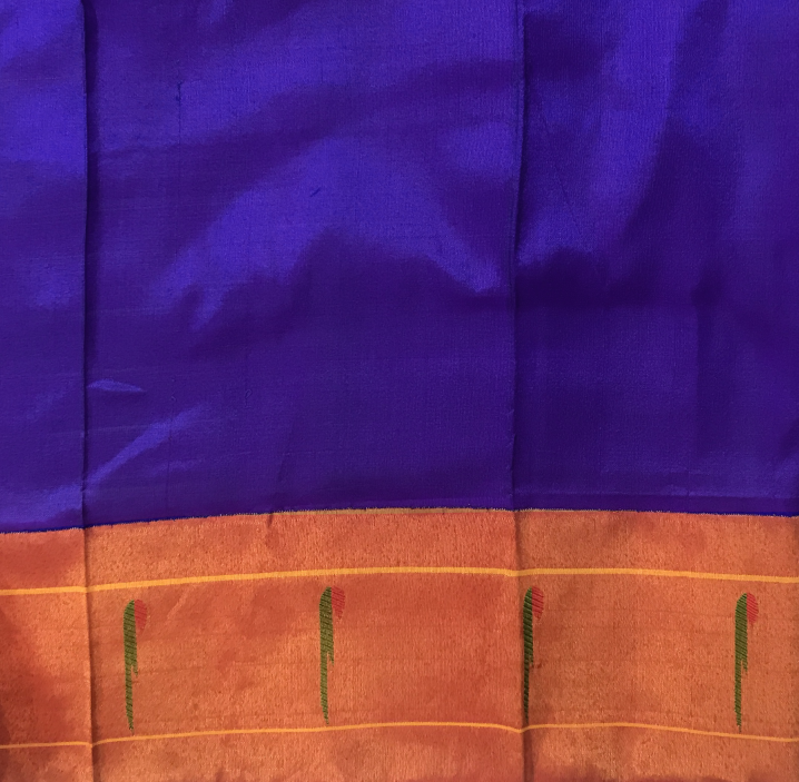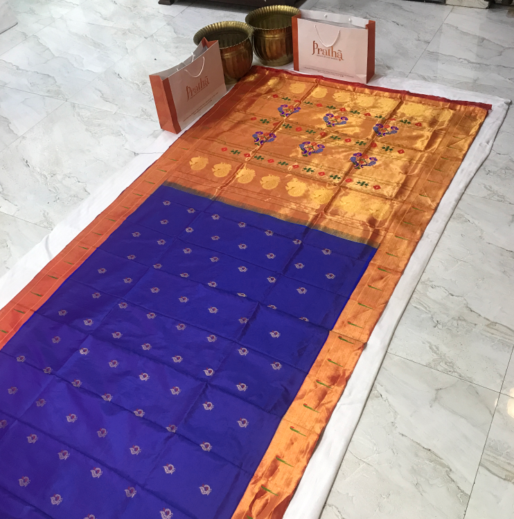 This Royal Paithani is the epitome of elegance, weaved with care and love for special days. The intricate weaving, the delicate meenakari peacock motifs in red thread and the clean workmanship brings magic and soul to this Blue Paithani. The muniya zari border with beautiful floral and peacock motifs running through it, makes this Signature Paithani an unique weave.