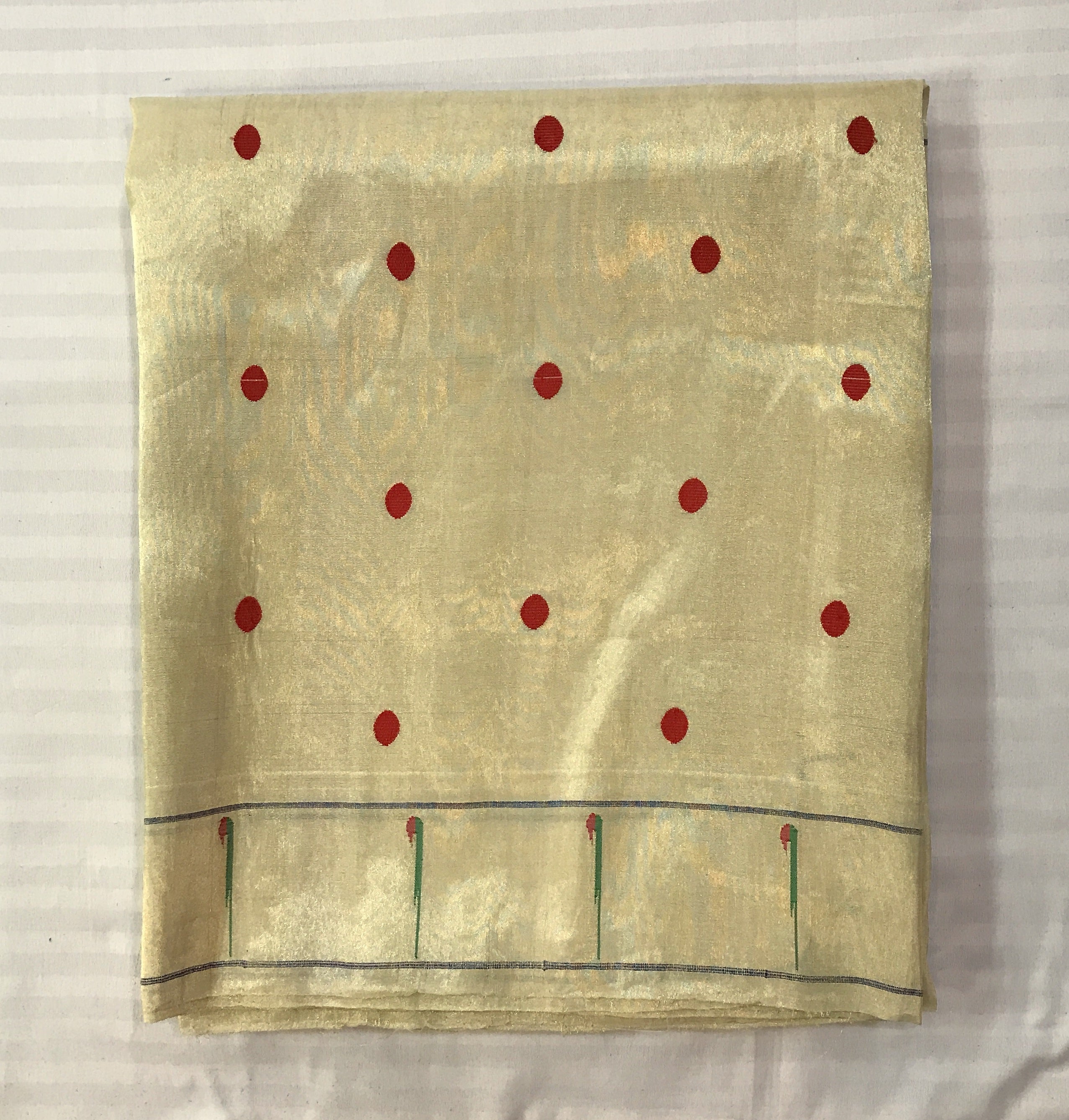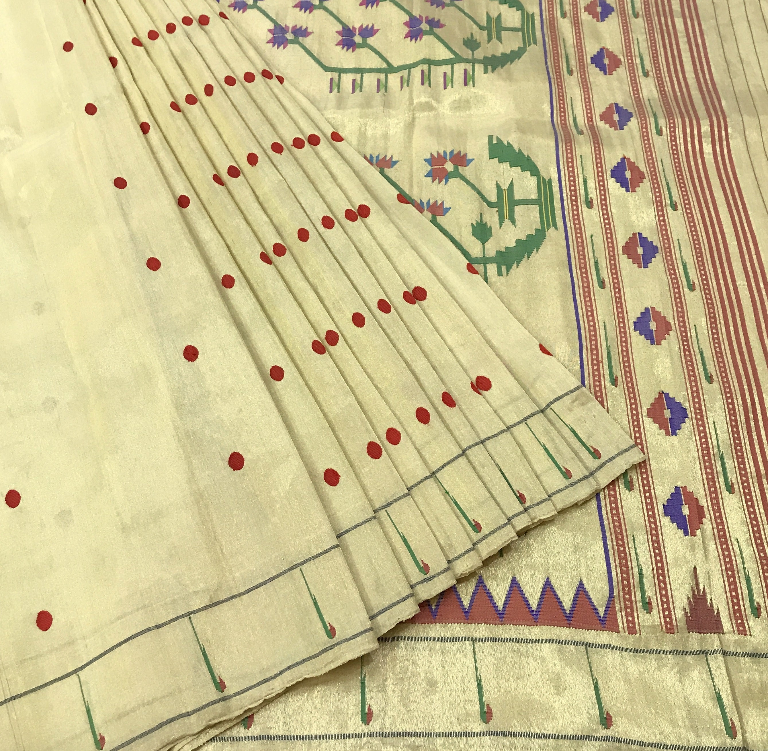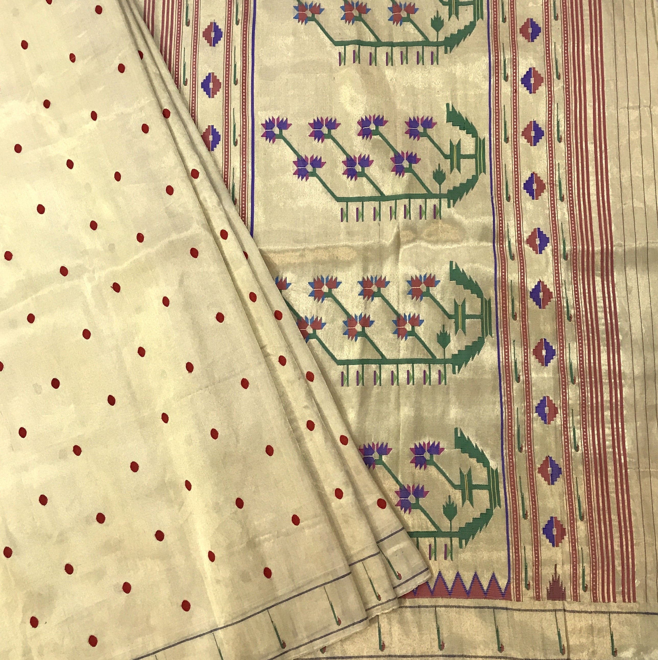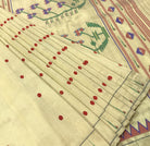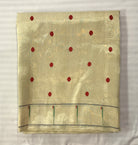This elegant saree comes in a soft cream base adorned with delicate red polka dot buttis scattered across the body, creating a subtle yet charming appeal. The highlight lies in its richly woven border and pallu, featuring intricate floral and geometric motifs in hues of green, purple, blue, and maroon, beautifully balanced with fine striped detailing. The understated sheen of the fabric enhances its graceful drape, making this saree a perfect blend of simplicity and traditional artistry, ideal for festive gatherings, temple wear, or refined daytime occasions.