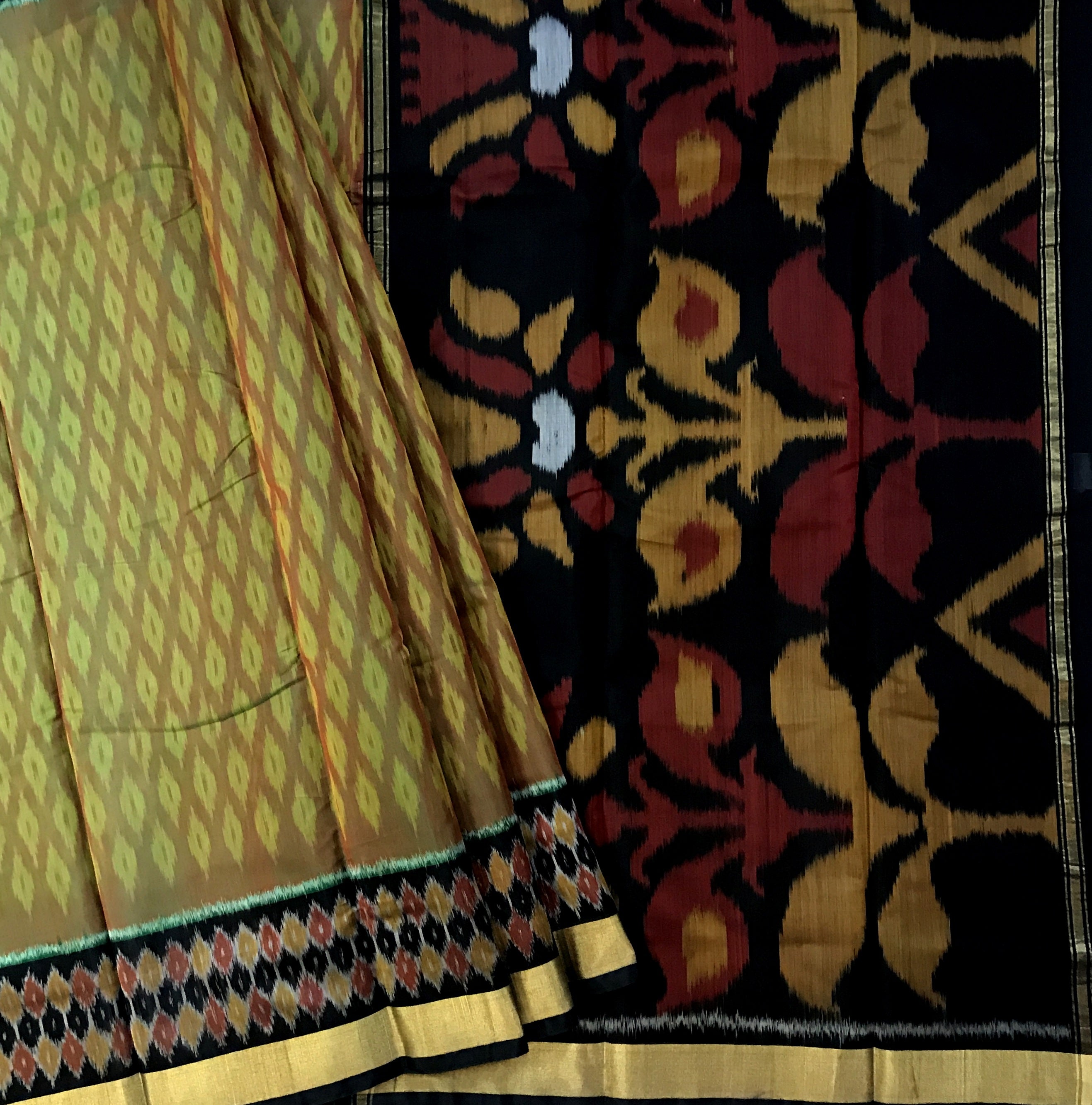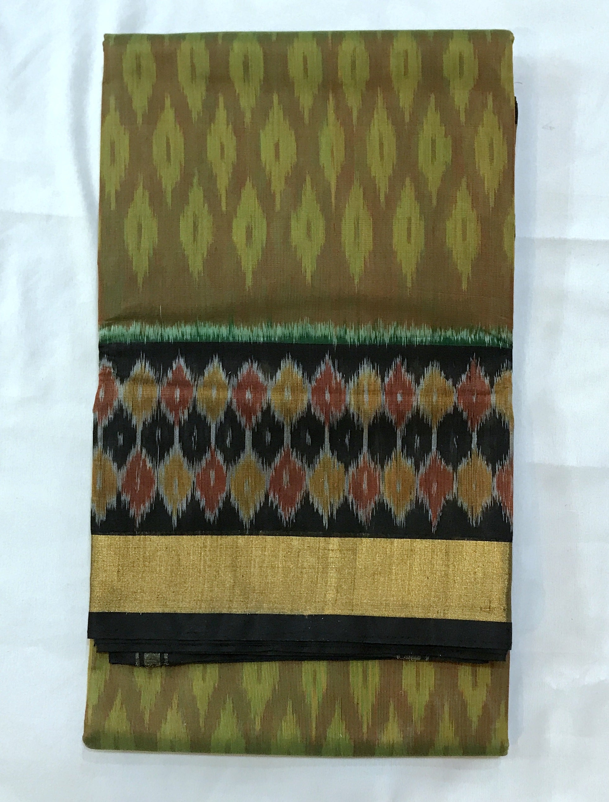 A very beautiful green coloured Silk Cotton Ikkat saree with ikkat design golden zari border, perfect saree for summers! Don't miss the unique printed design all over the saree and golden zari on its border looks very beautiful with black ikkat design pallu. Light in weight and easy to drape.