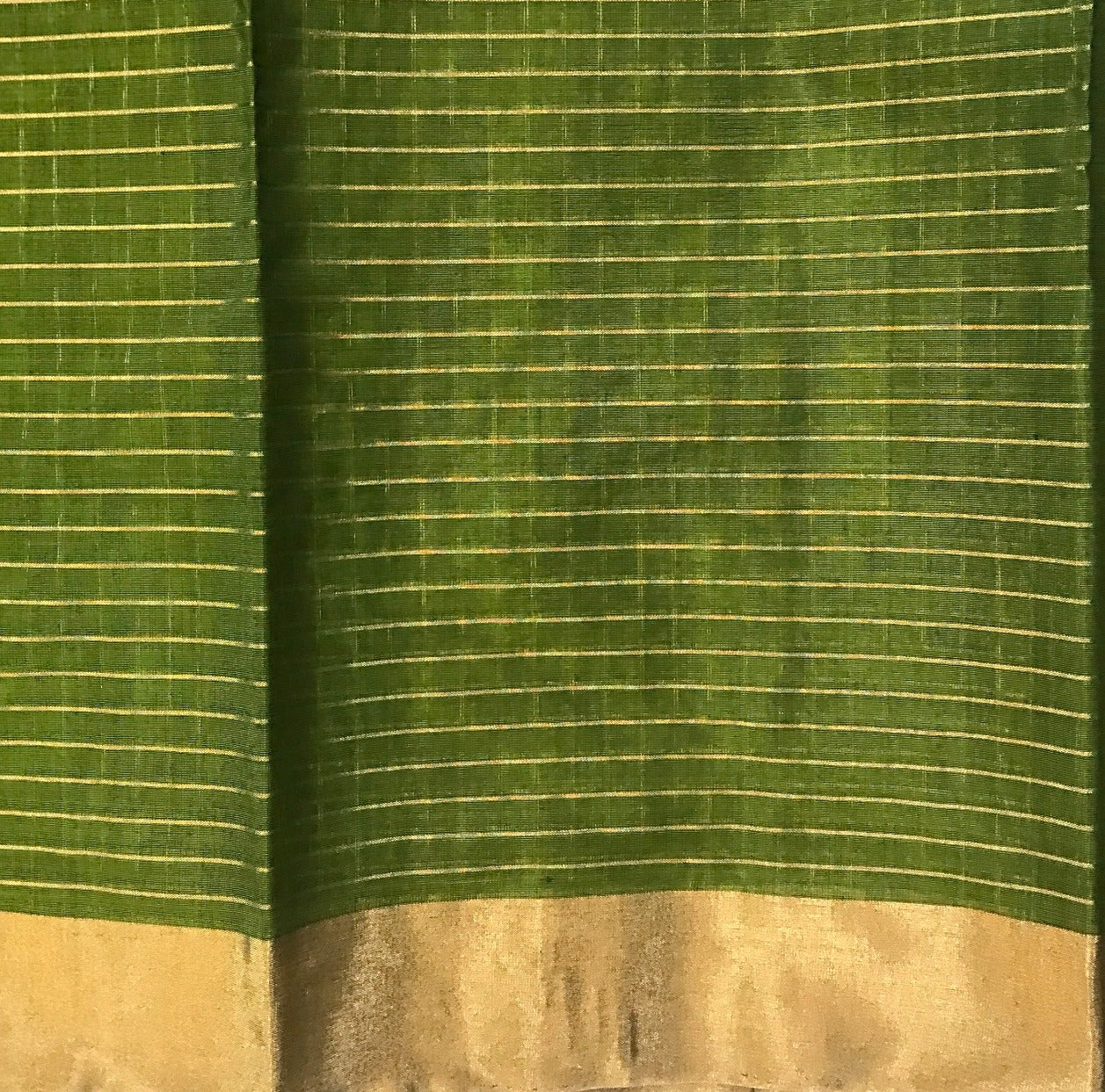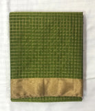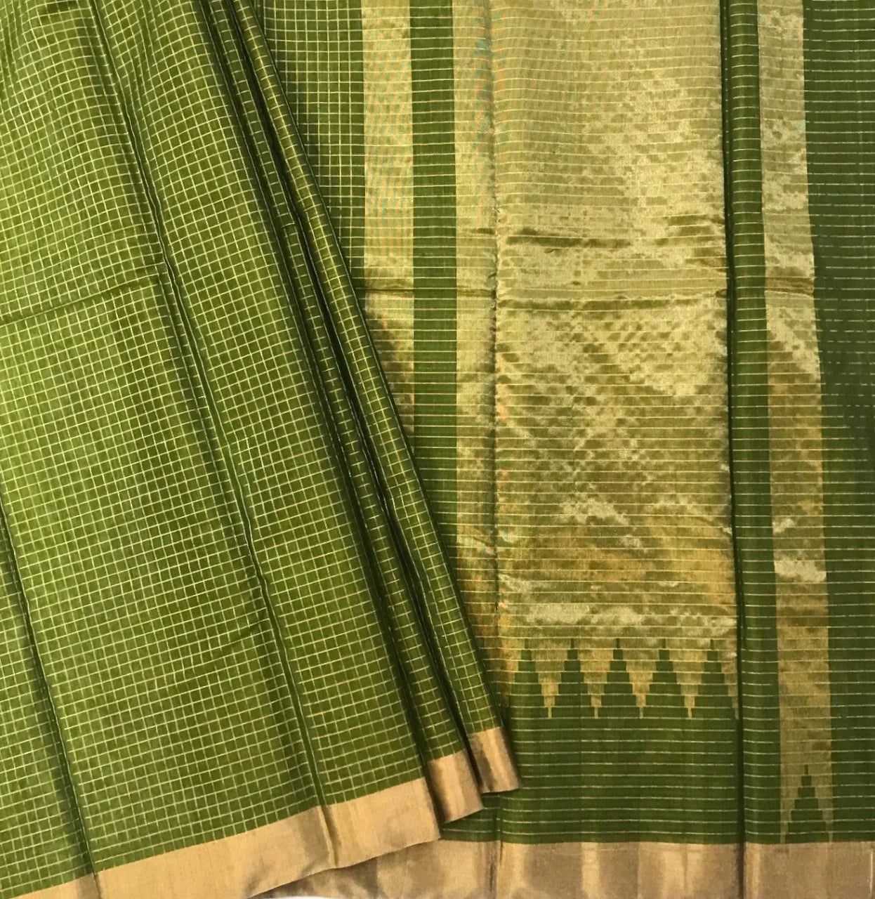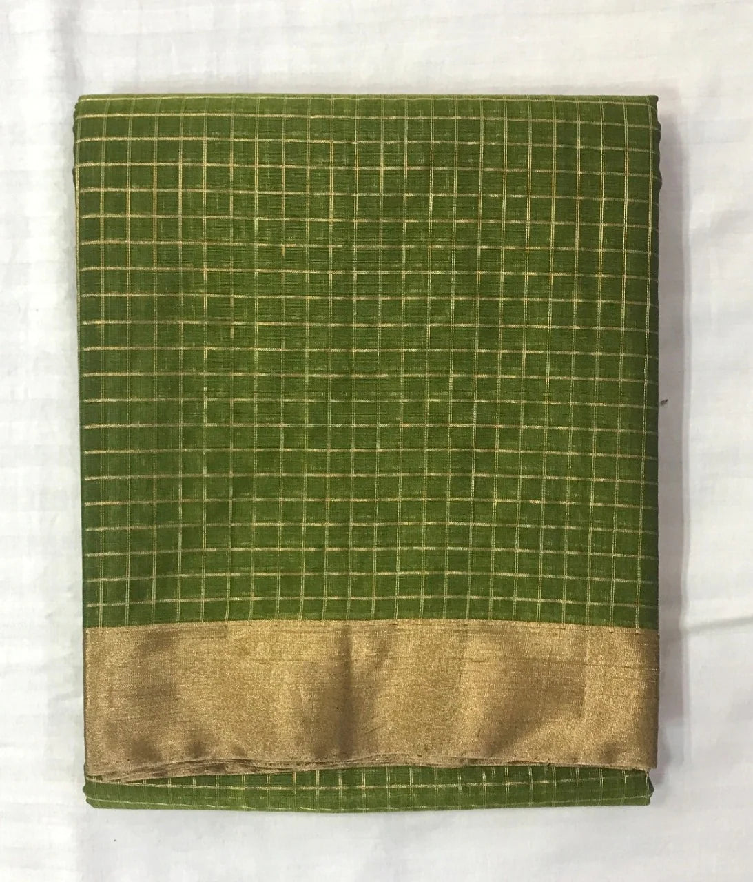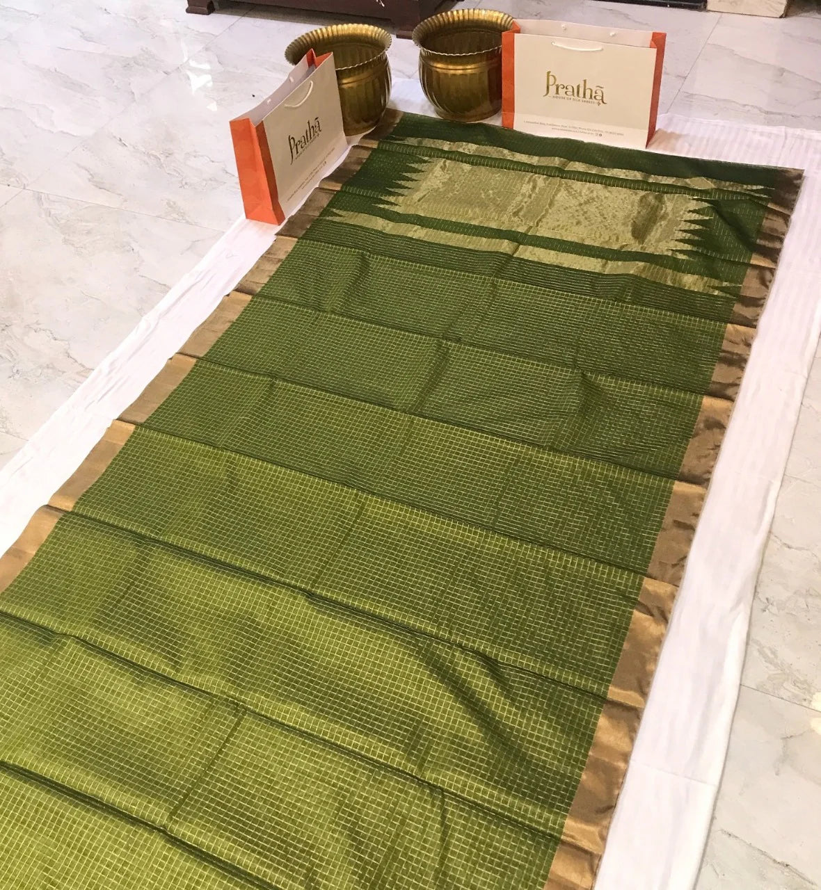 A different type and attractive shade of shining mehandi-green zari checks Silk Cotton traditional saree in a outstanding colour combination with golden ting, a perfect saree for summers! The small zari border looks very beautiful with zari pallu. Light in weight and easy to drape.