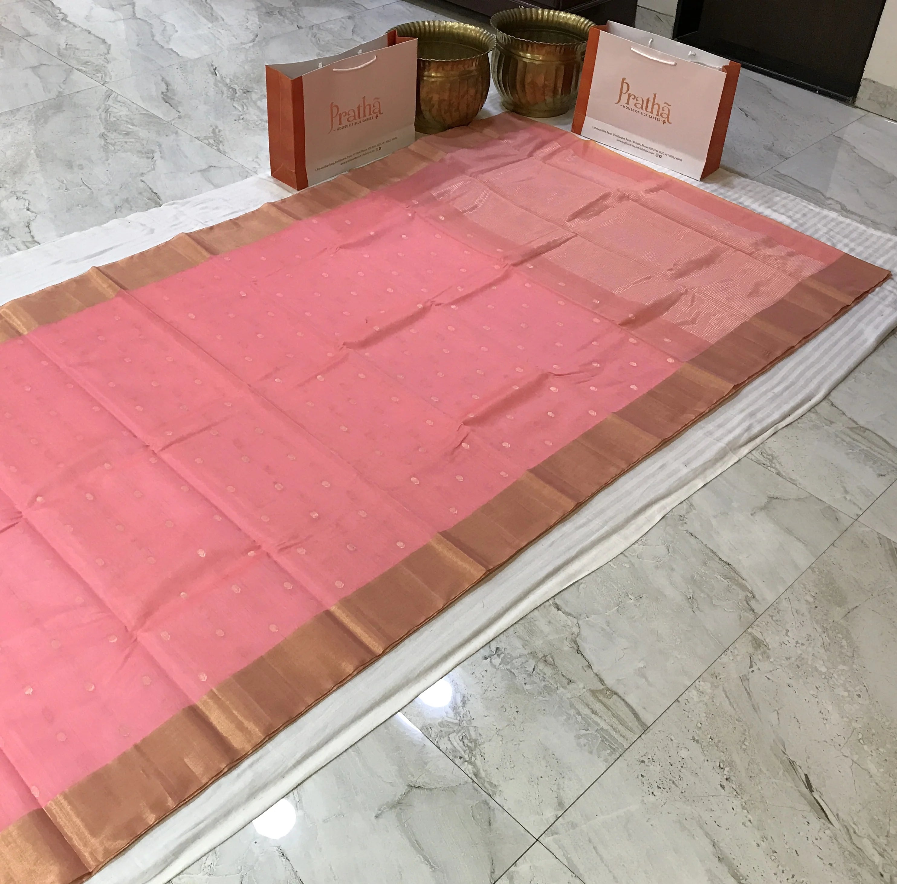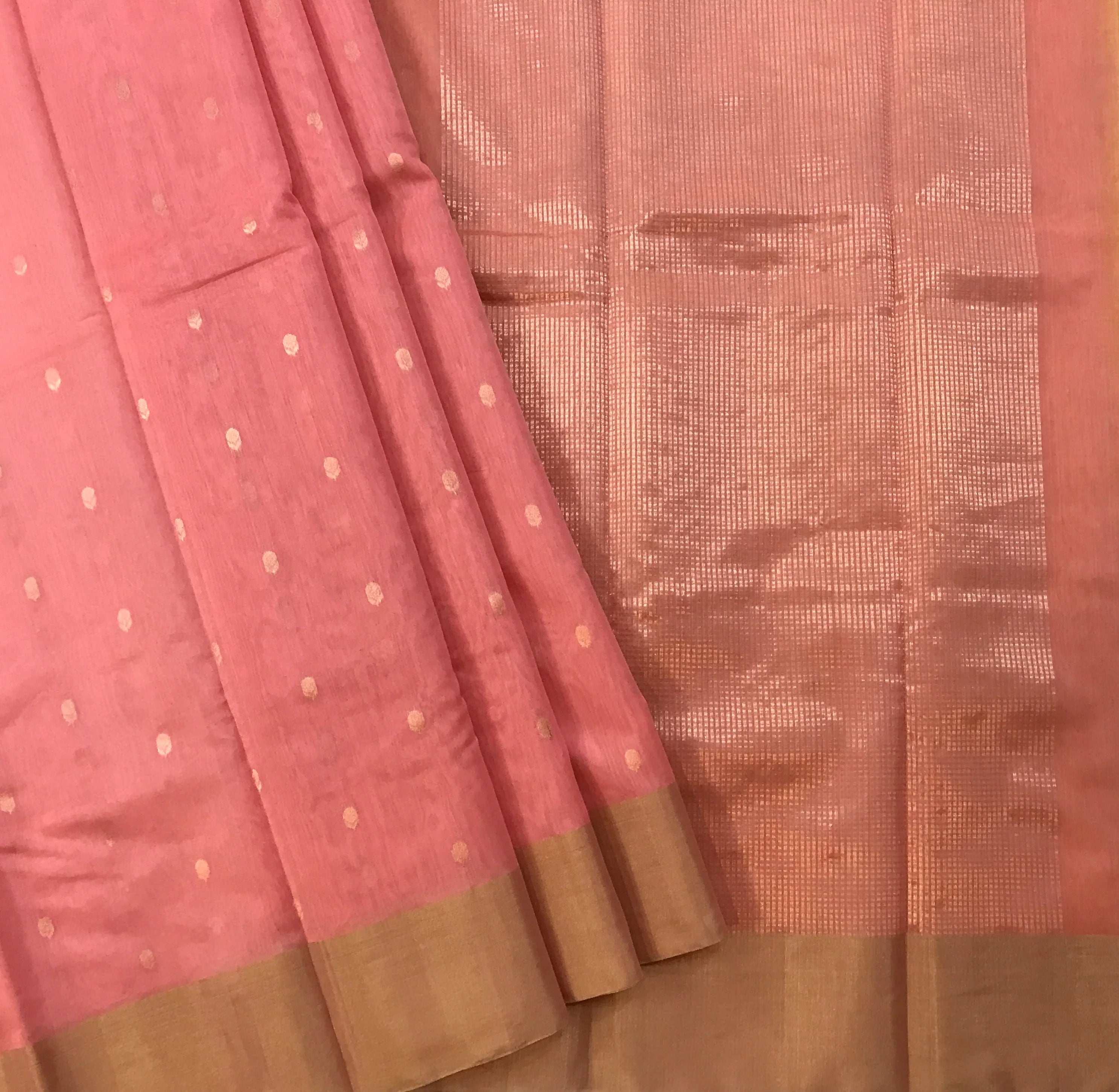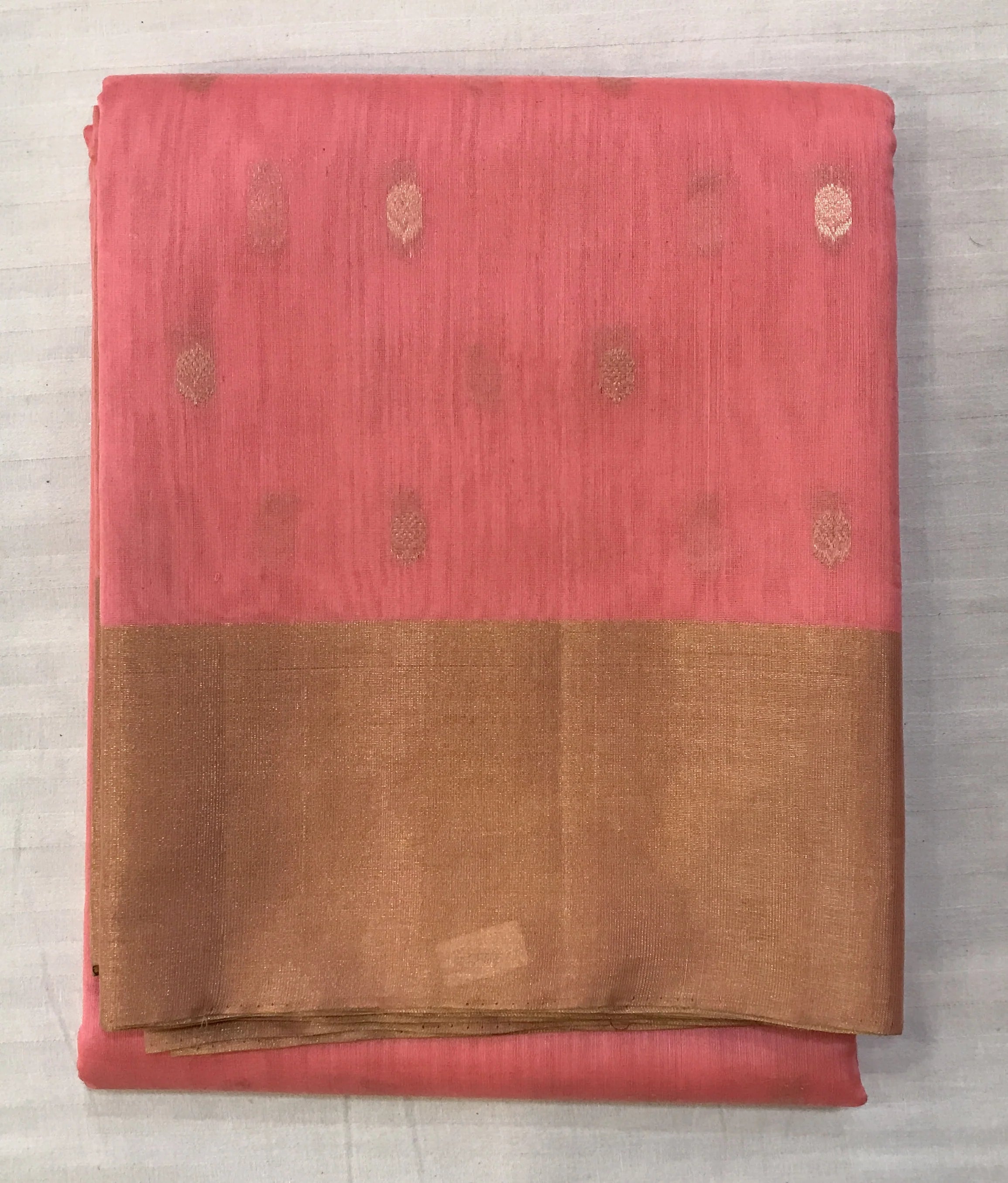 A very pretty shade of peach Silk Cotton Traditional with a delicate butti woven in golden zari with plain golden zari border looks very outstanding with golden zari pallu. Light in weight and easy to drape. perfect saree for summers!