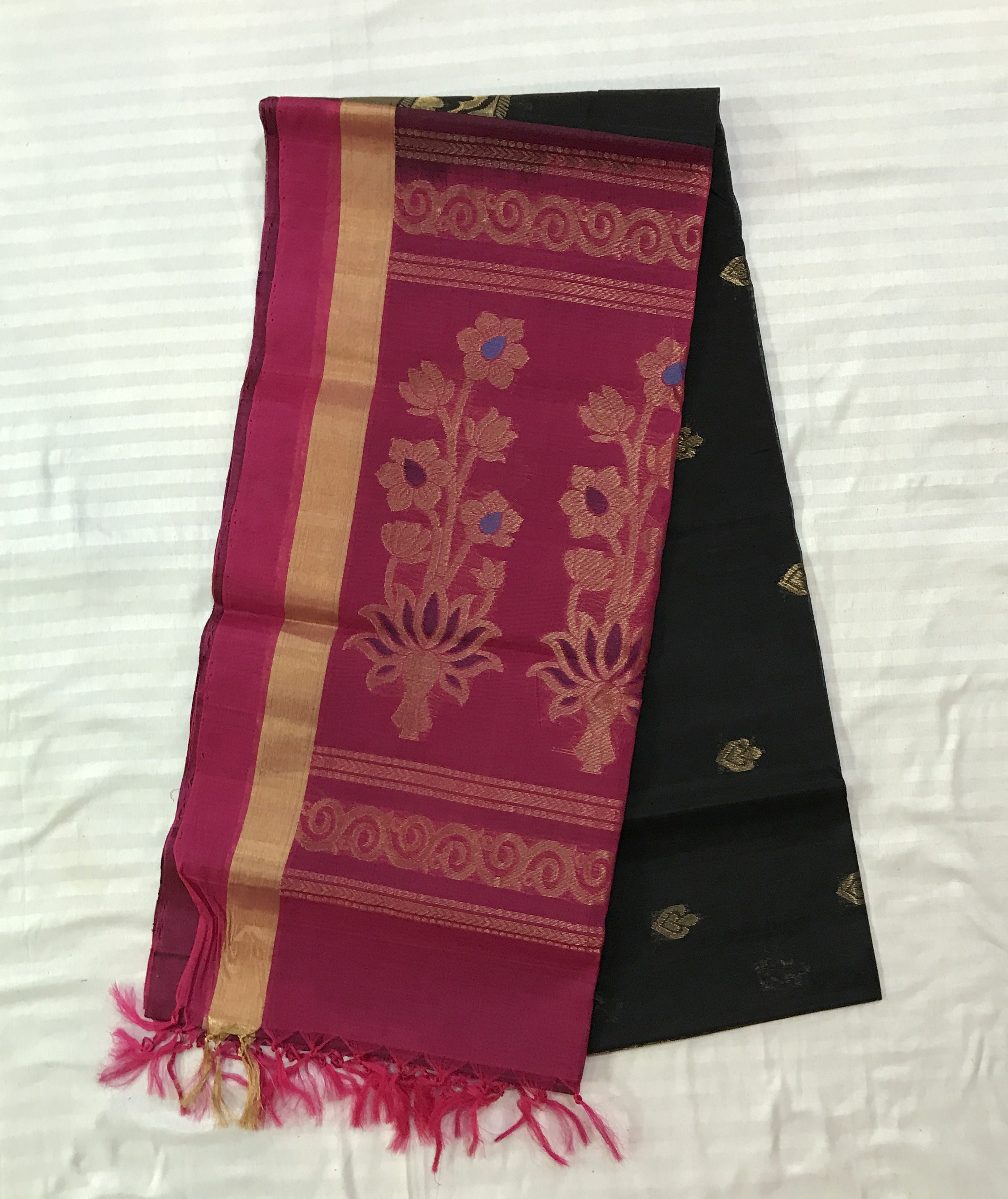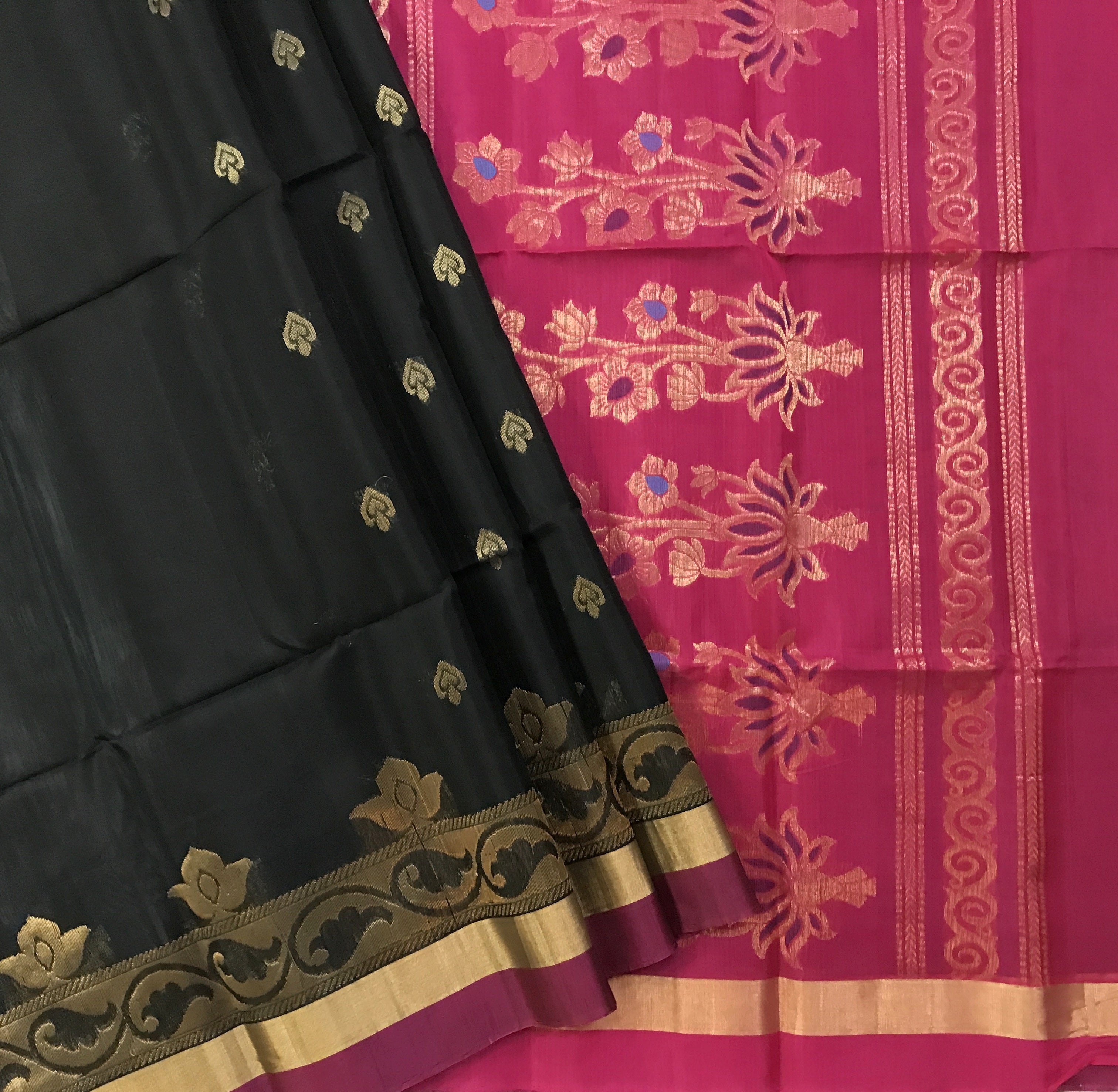 This black coloured Silk Cotton Traditional saree , perfect saree for summers! Don't miss the delicate unique shaped butti woven in golden zari with broad intricate design zari border is looks very outstanding with pink golden zari pallu. Light in weight and easy to drape.