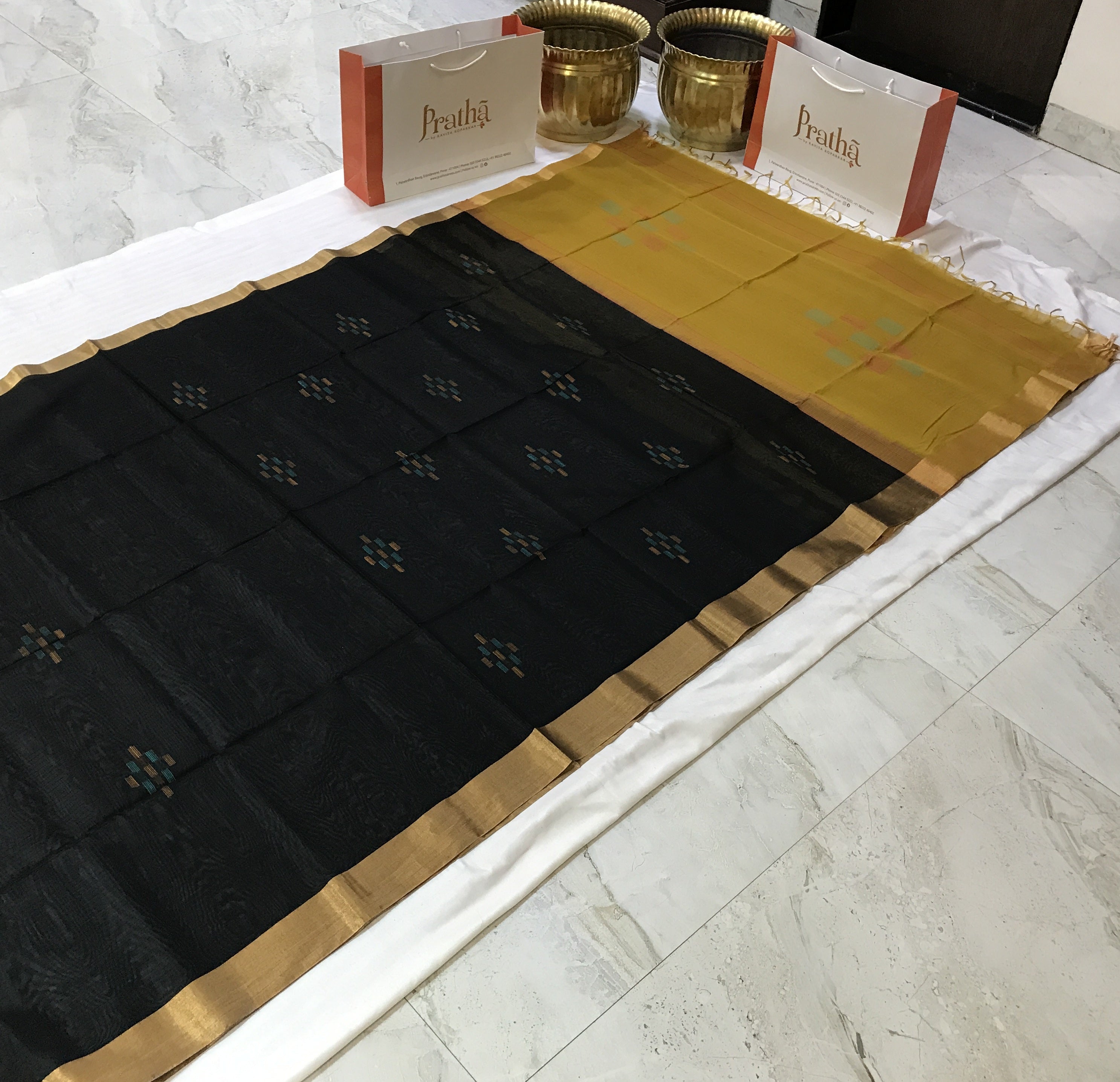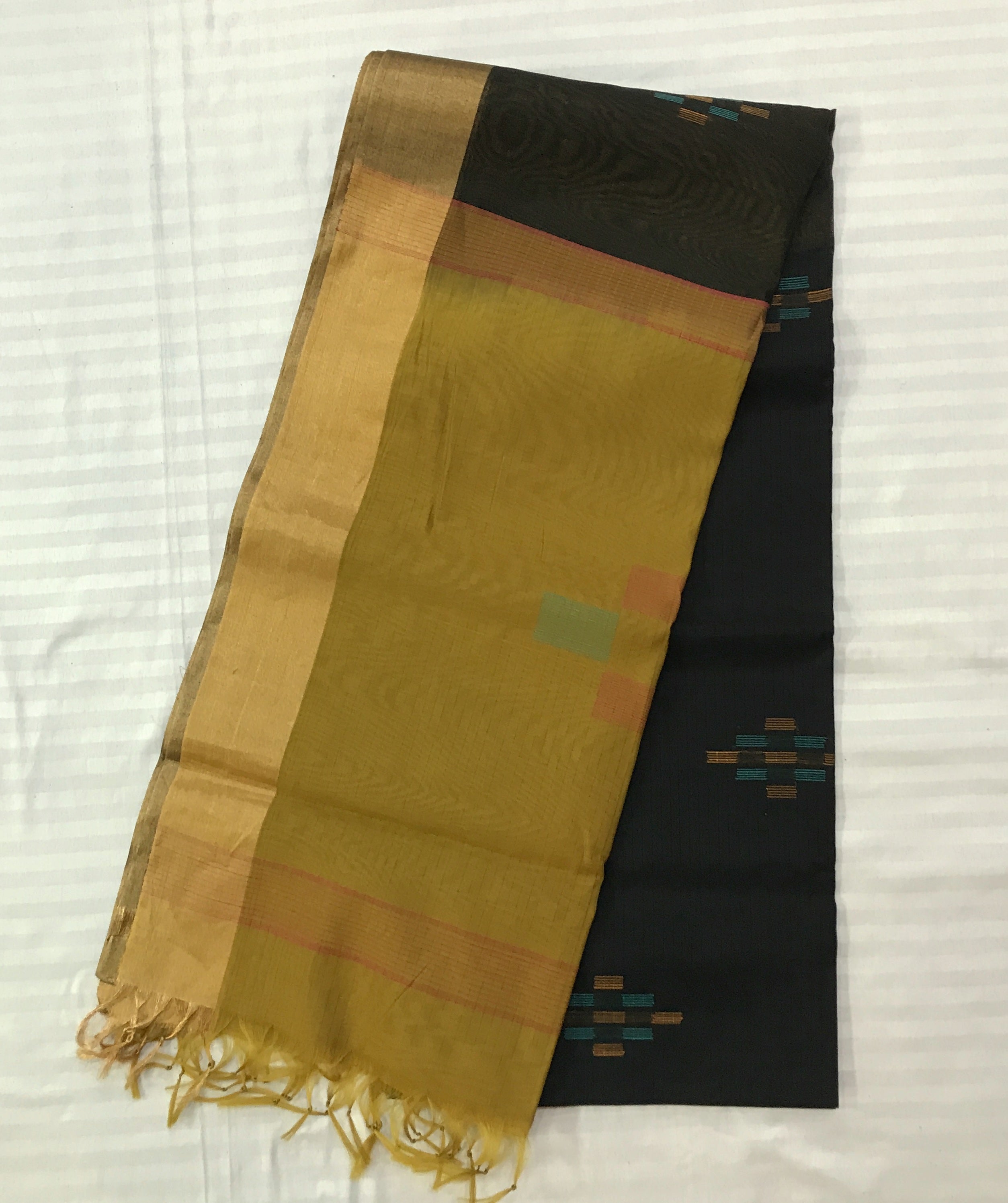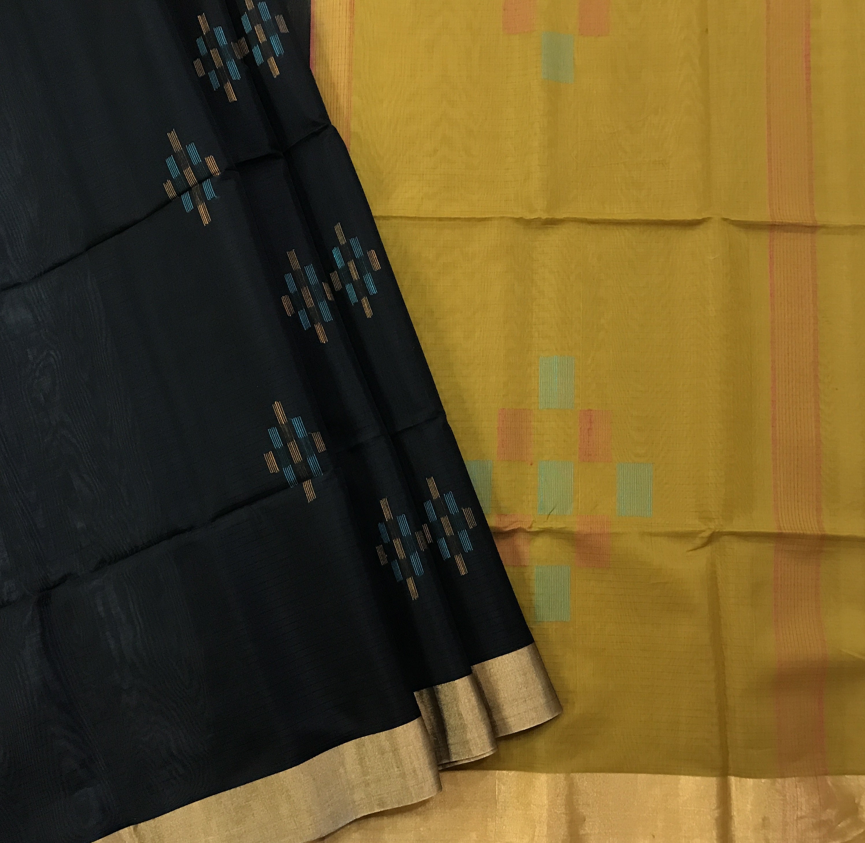 A very pretty shade of black Silk Cotton Traditional with a unique shape butta woven in silk thread with small plain golden zari border looks very outstanding with contrast mustard zari designer pallu. Light in weight and easy to drape. perfect saree for summers!
