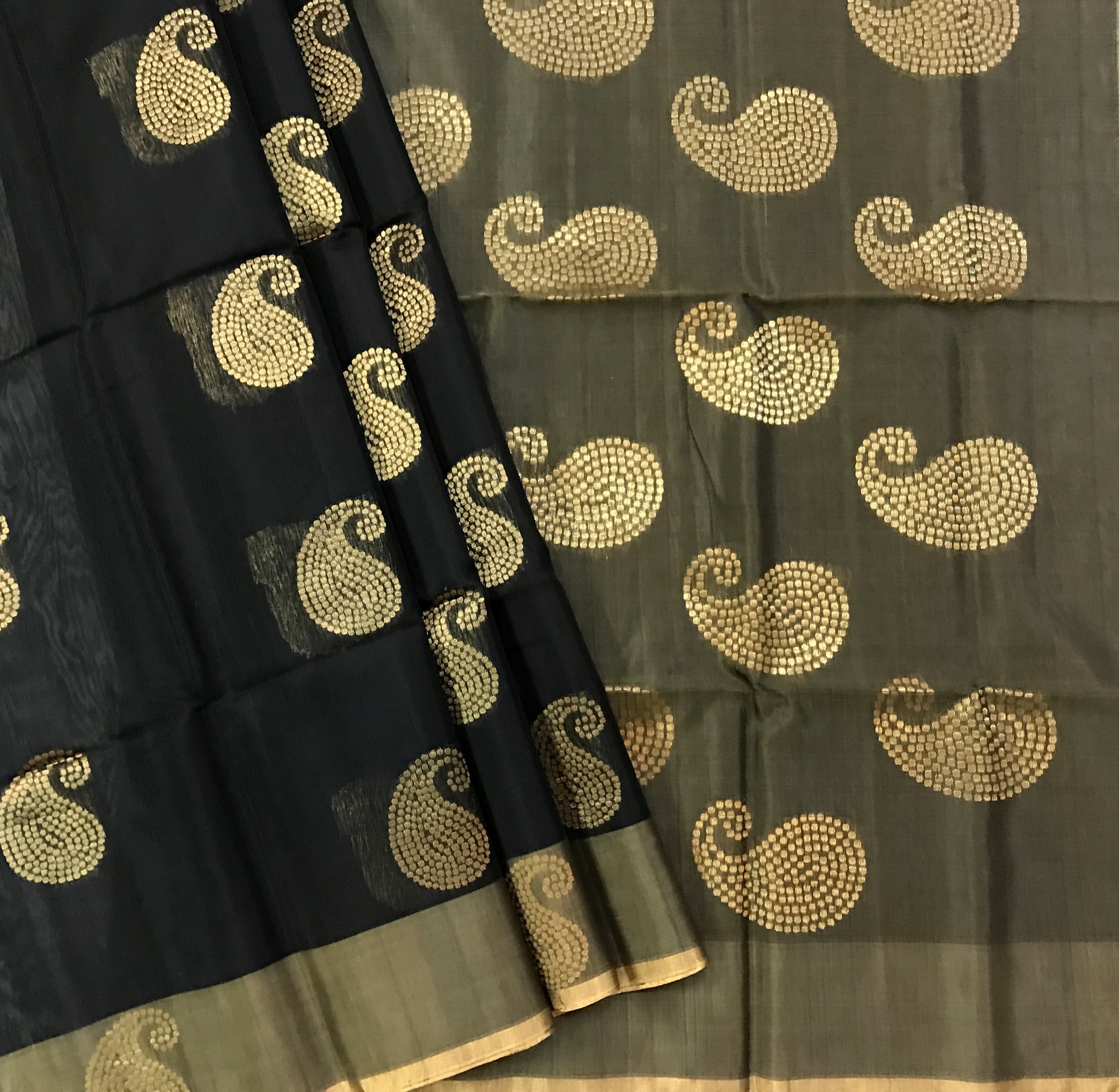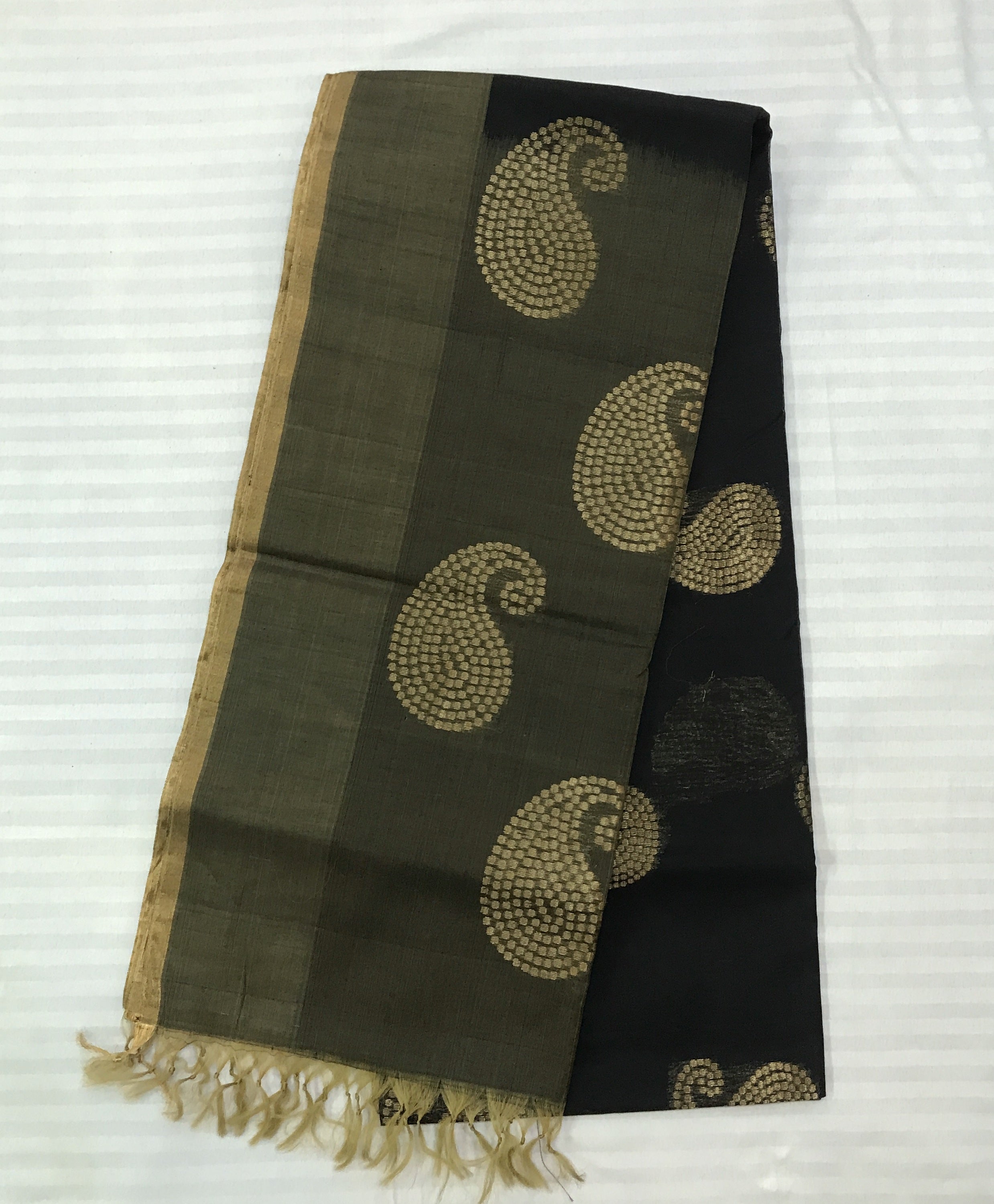 A very beautiful shade of black Silk Cotton Traditional with a big circle shape butta woven in golden zari with designer silk border looks very outstanding with contrast golden zari designer pallu. Light in weight and easy to drape. perfect saree for summers!