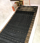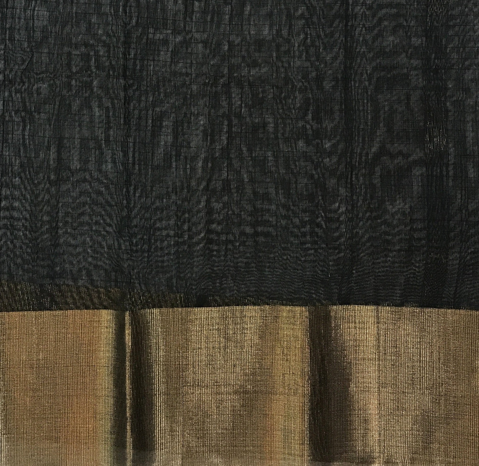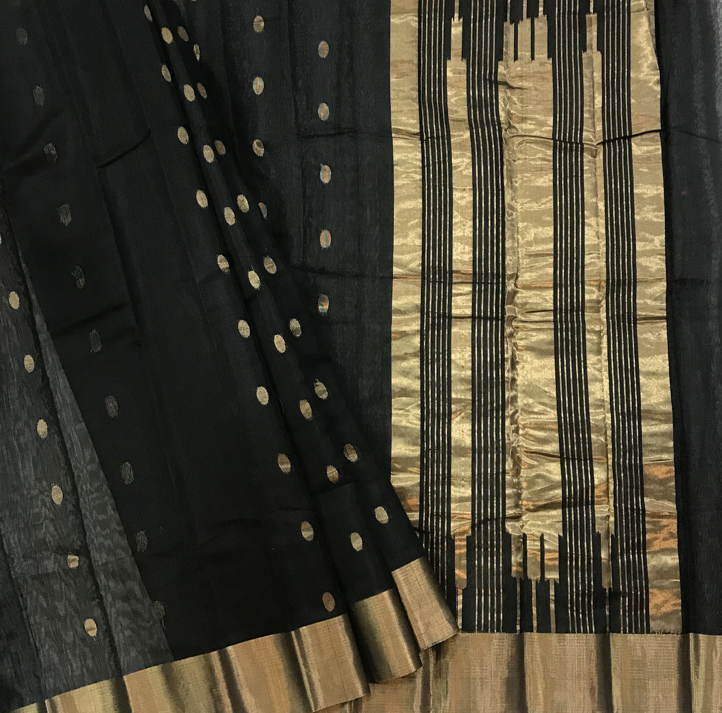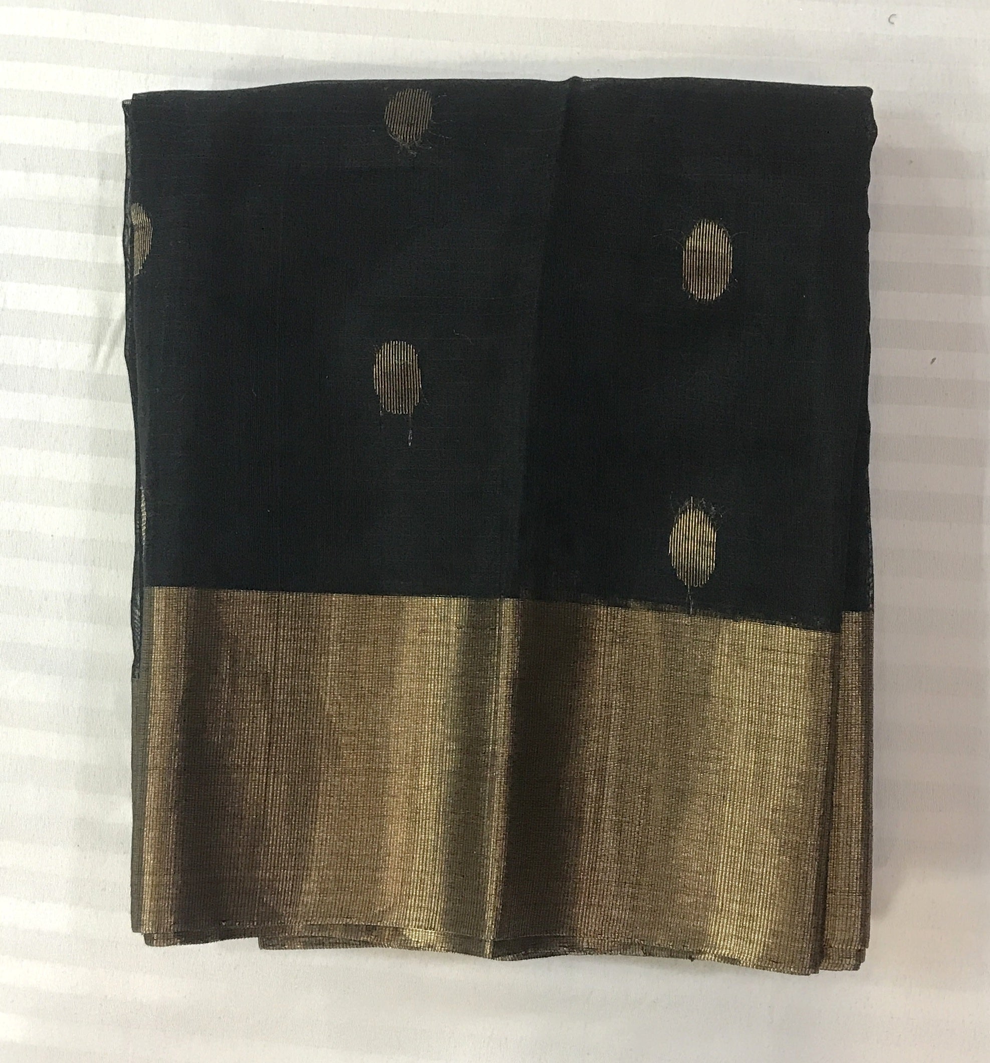 A shade of black colour with round golden big zari butta this Silk Cotton Traditional saree is perfect for summers!  The butti design and golden zari border looks very outstanding with golden zari pallu. Light in weight and easy to drape.
