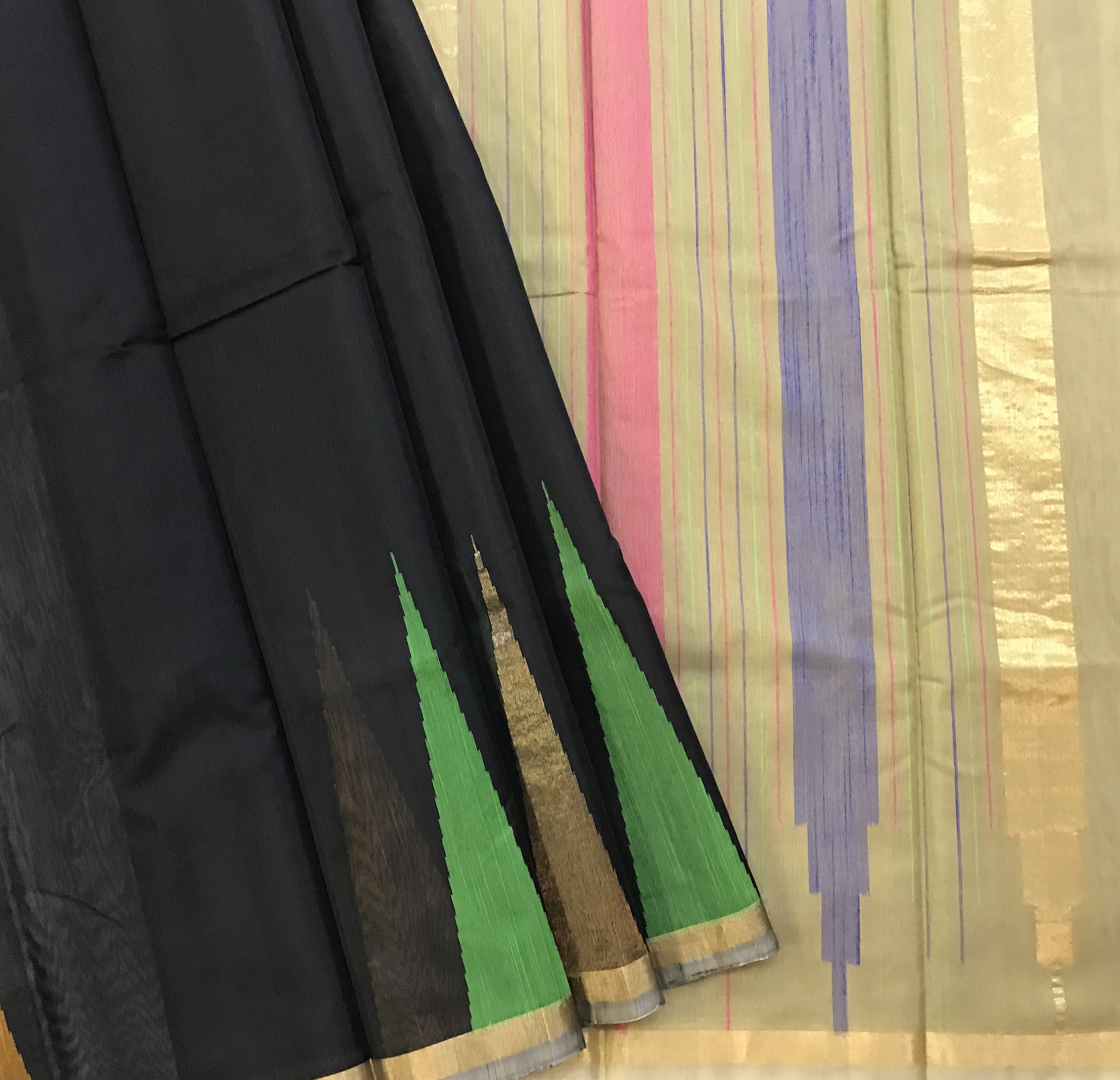 A very different type and nice combination of black coloured Silk Cotton Traditional saree , perfect saree for summers! Don't miss the self texture design without motifs with long temple border and golden zari border is looks very outstanding and pallu. Light in weight and easy to drape.