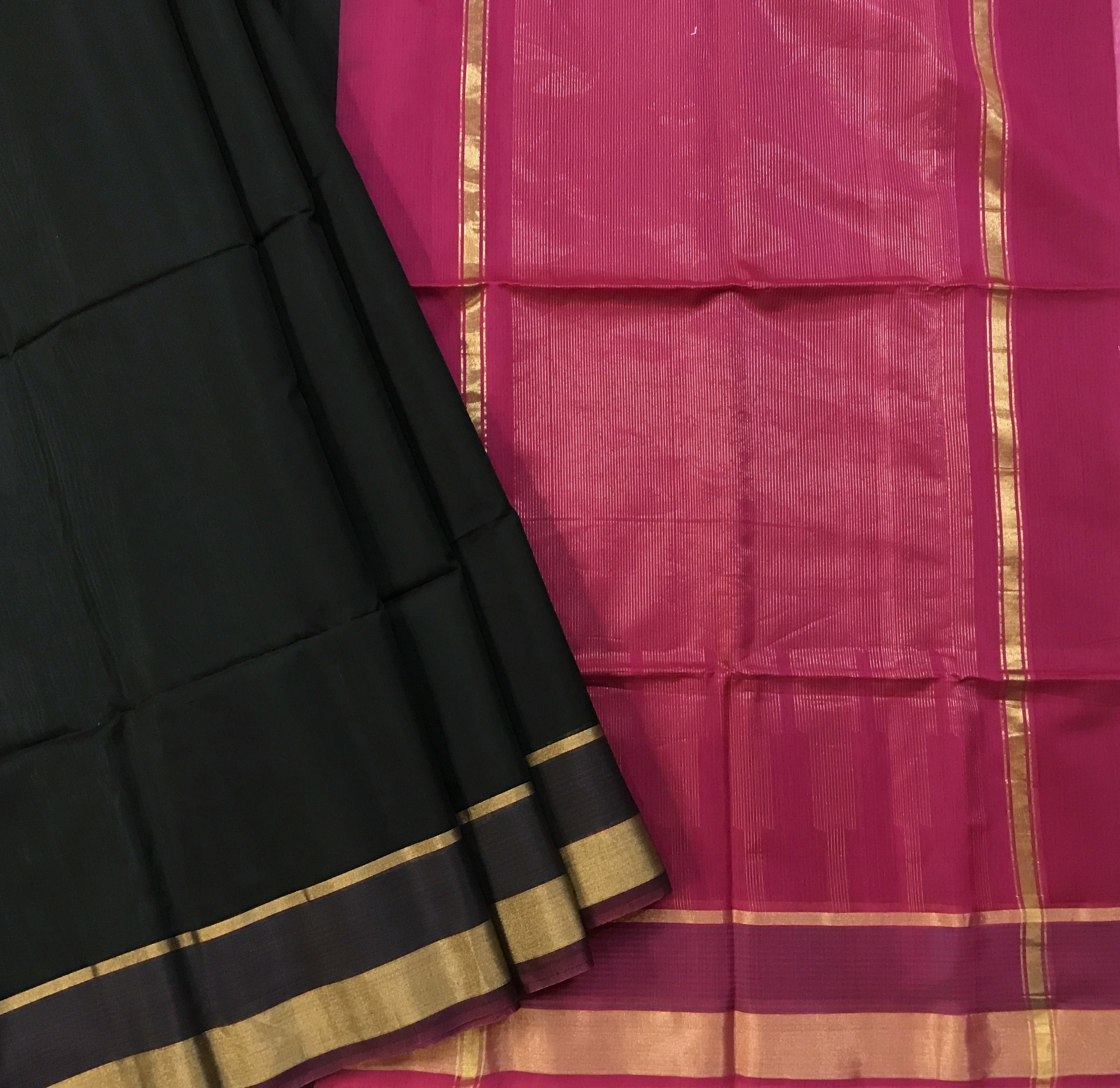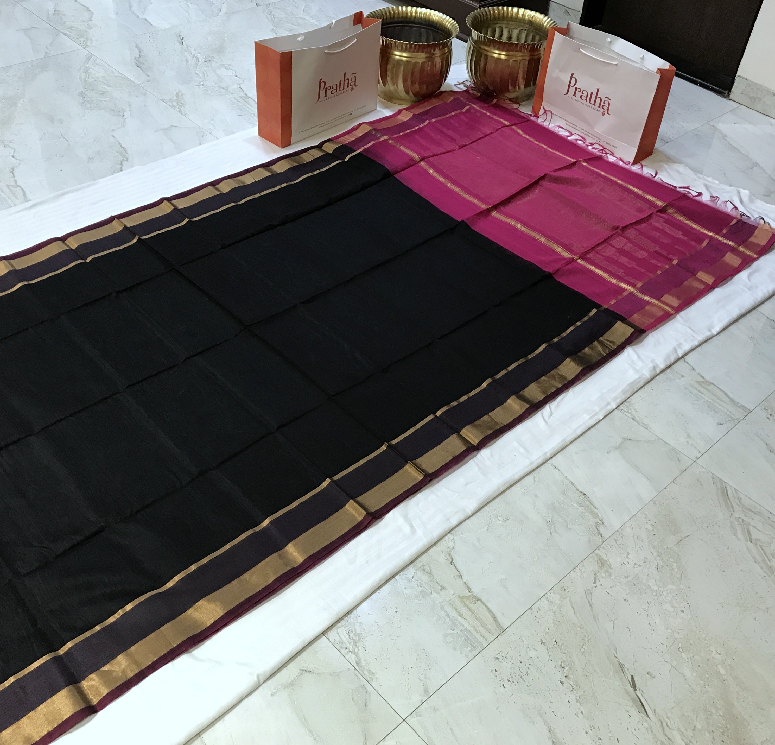 A very different type and beautiful combination of black coloured Silk Cotton Traditional saree , perfect saree for summers! Don't miss the plain black coloured saree without motifs with plain golden zari border and contrast pink pallu is very outstanding. Light in weight and easy to drape.