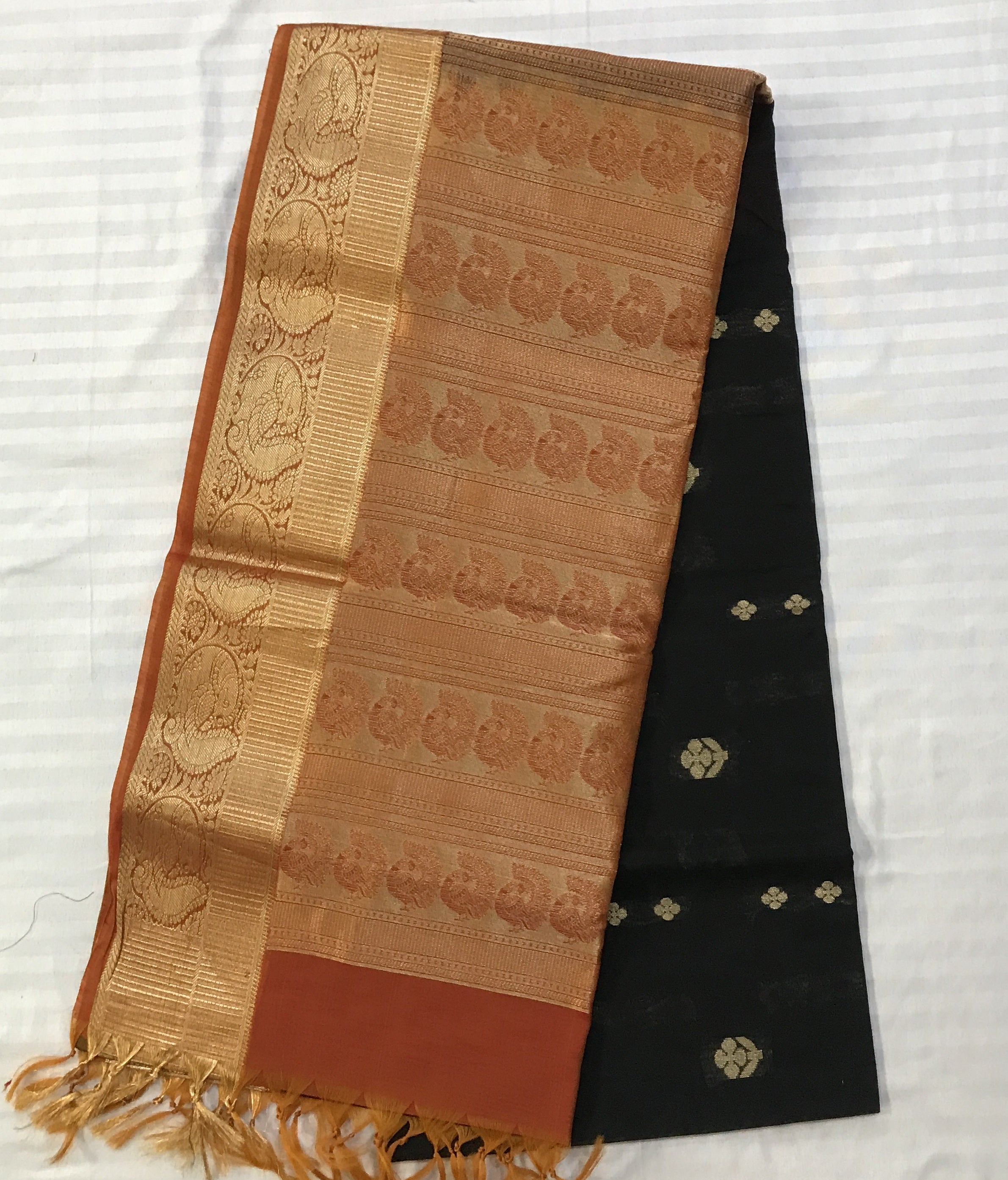 The classic combination of Black coloured and orange pallu Silk Cotton Traditional saree, perfect saree for summers! Don't miss the unique alternate small and big shaped butti woven in copperish zari with intricate design golden zari border is looks very outstanding with orange coloured golden zari pallu. Light in weight and easy to drape.