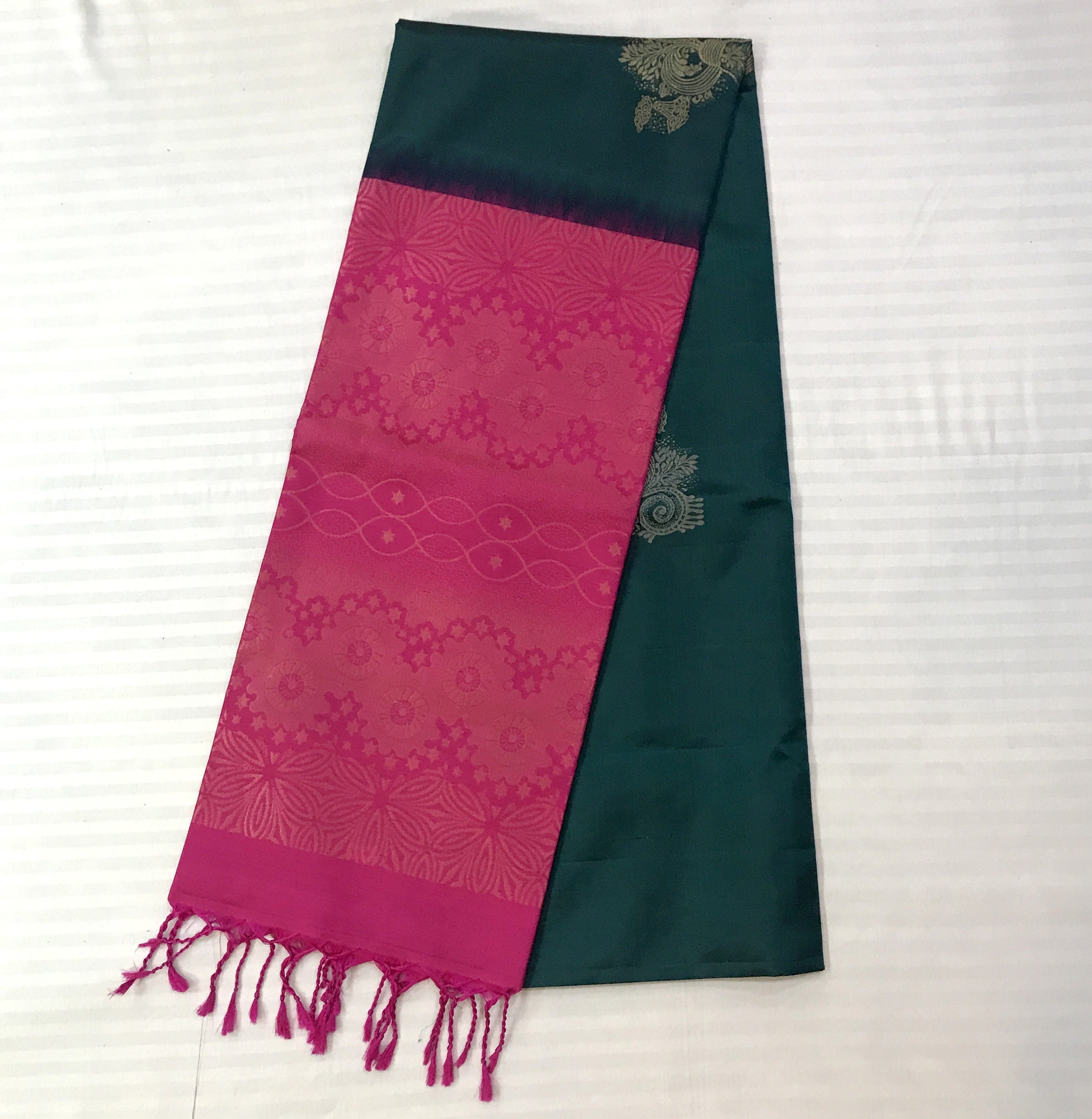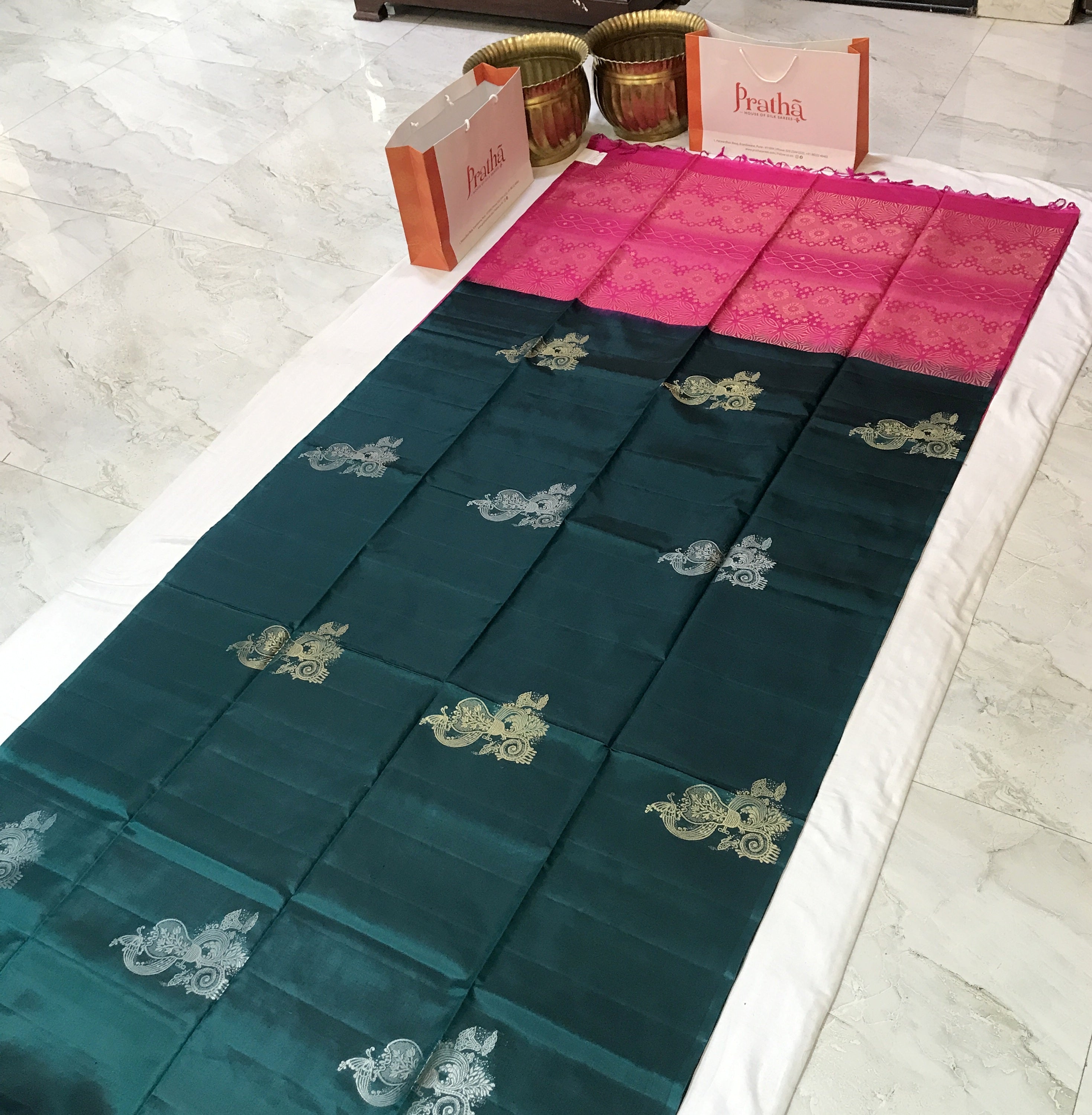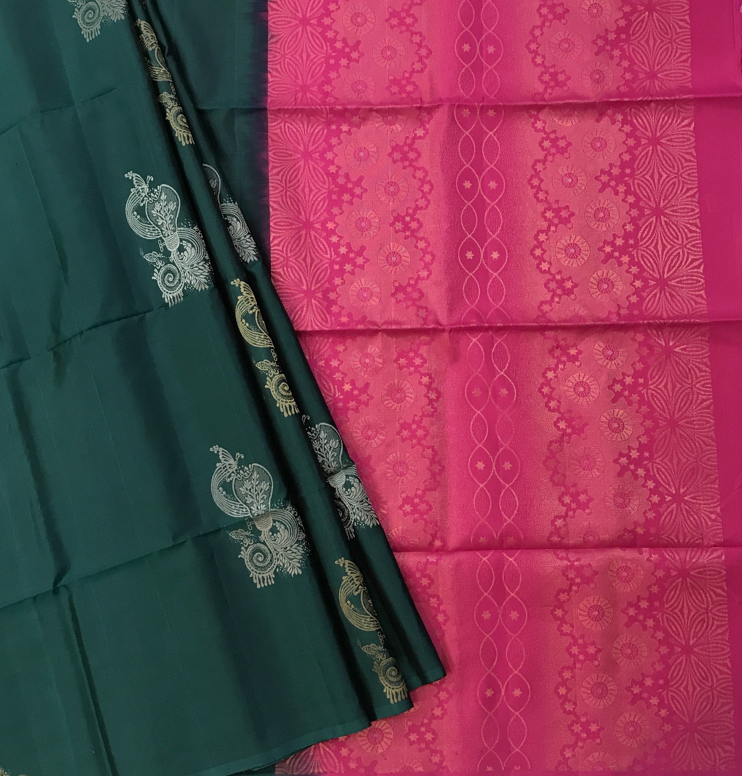 This elegant handwoven silk saree features a soothing bottle green body adorned with subtle woven un golden-silver ( butti ) motifs that lend it a refined, understated charm. The contrast pink pallu and border are richly detailed with intricate geometric patterns and traditional zari work, adding depth and character to the drape. A delicate zari edging neatly frames the saree, making it a graceful choice for festive gatherings and timeless celebrations.