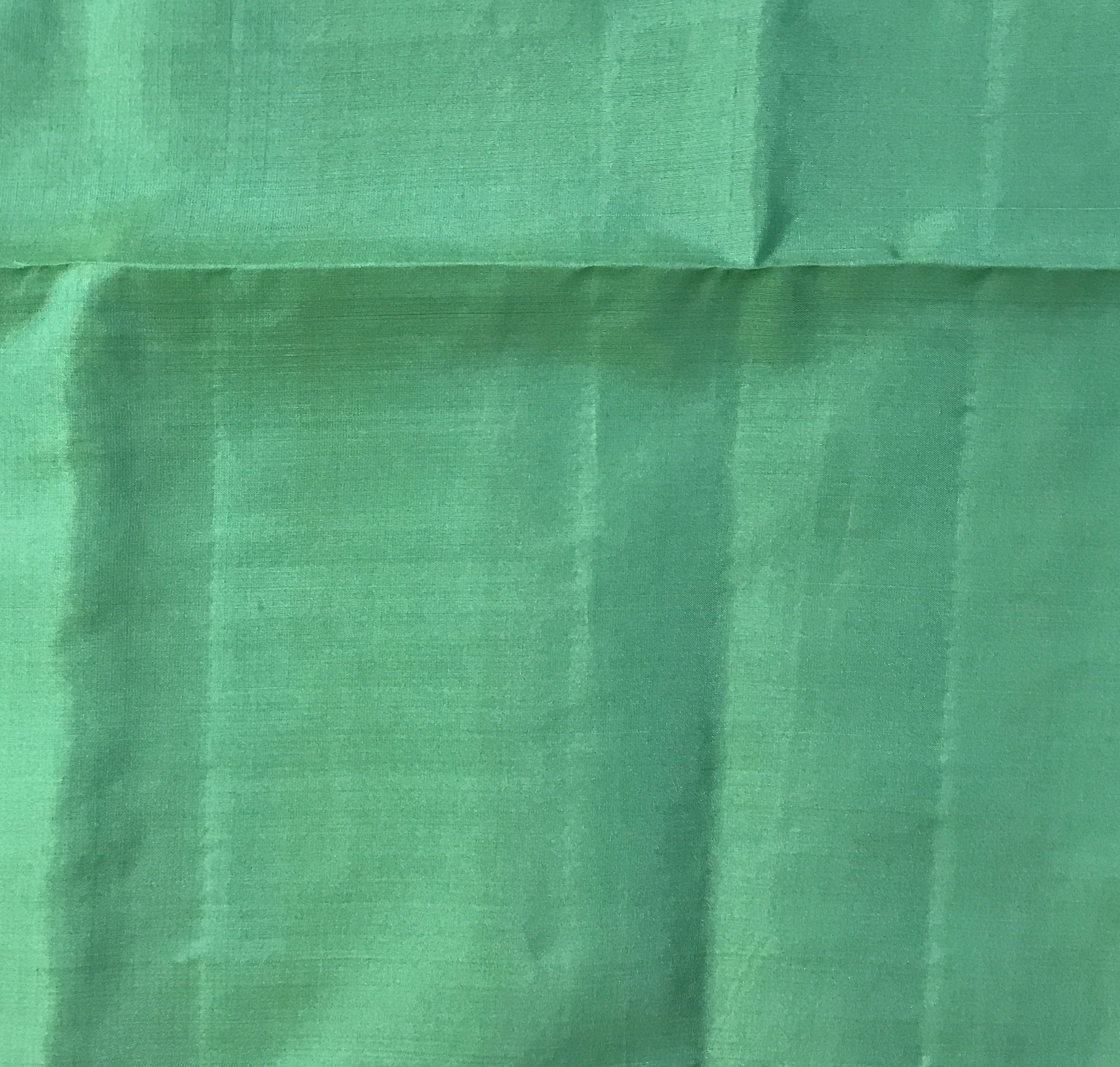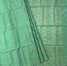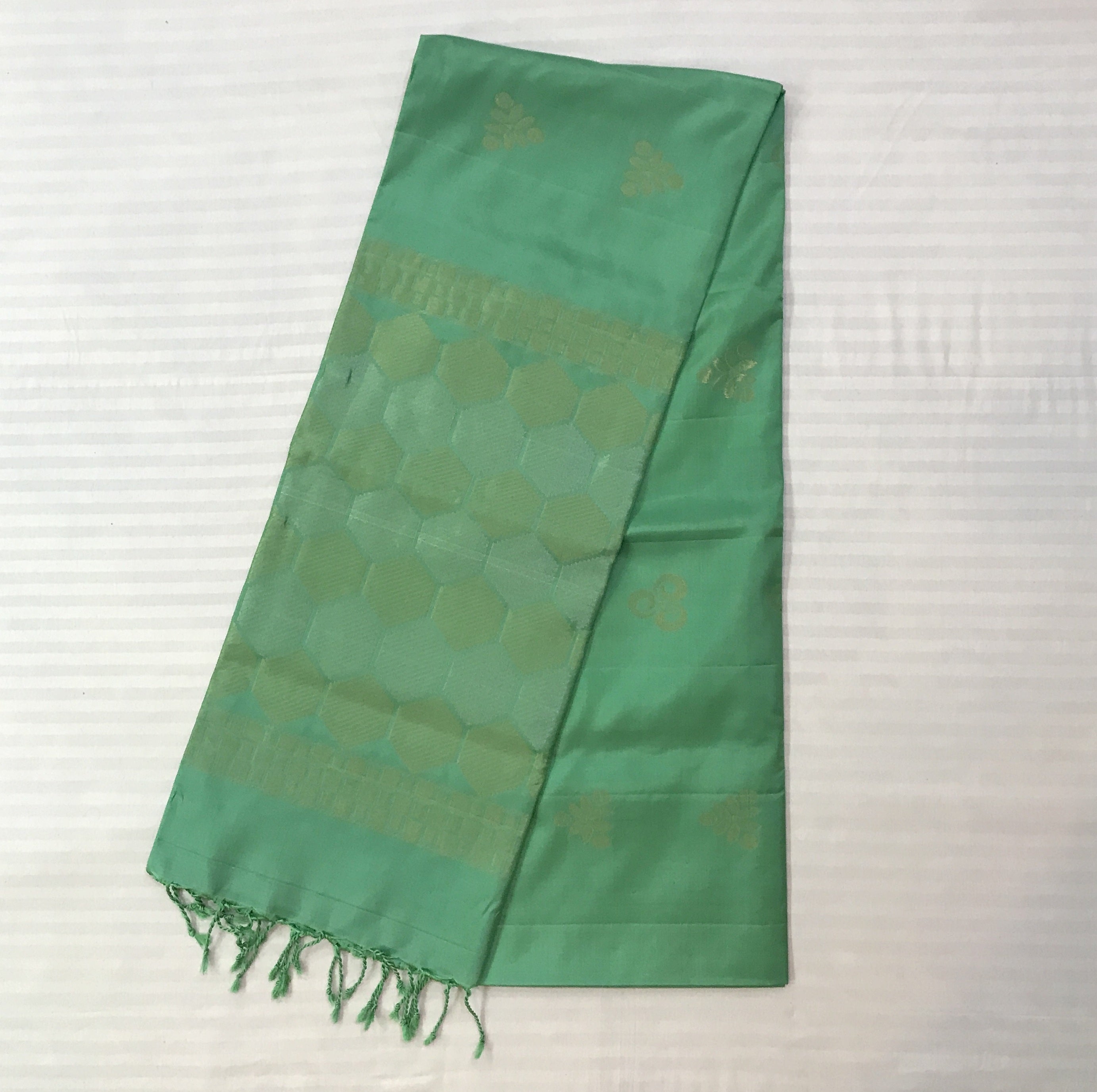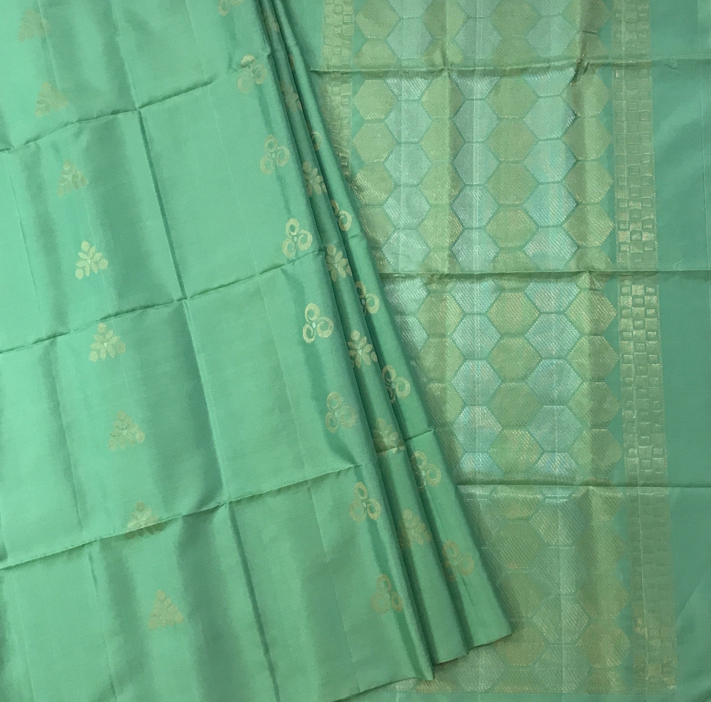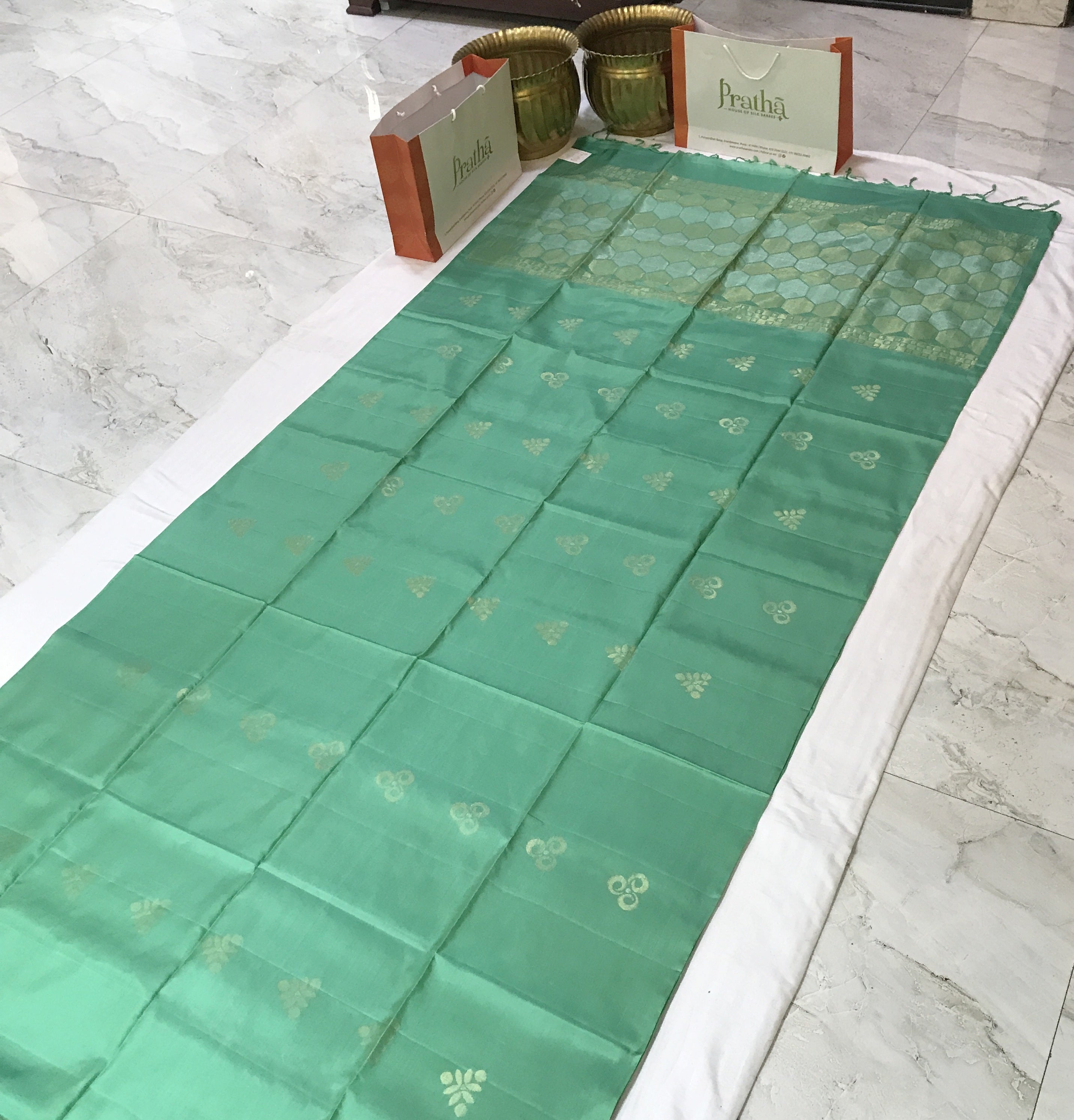 A very pretty shade of Green pure silk handwoven Soft silk, this one is perfectly traditional. The intricate and different type of butti without any traditional border with richly woven self coloured golden-silver brocade design zari Pallu make this weave a classic! This soft silk will look great in the day as well as at night!