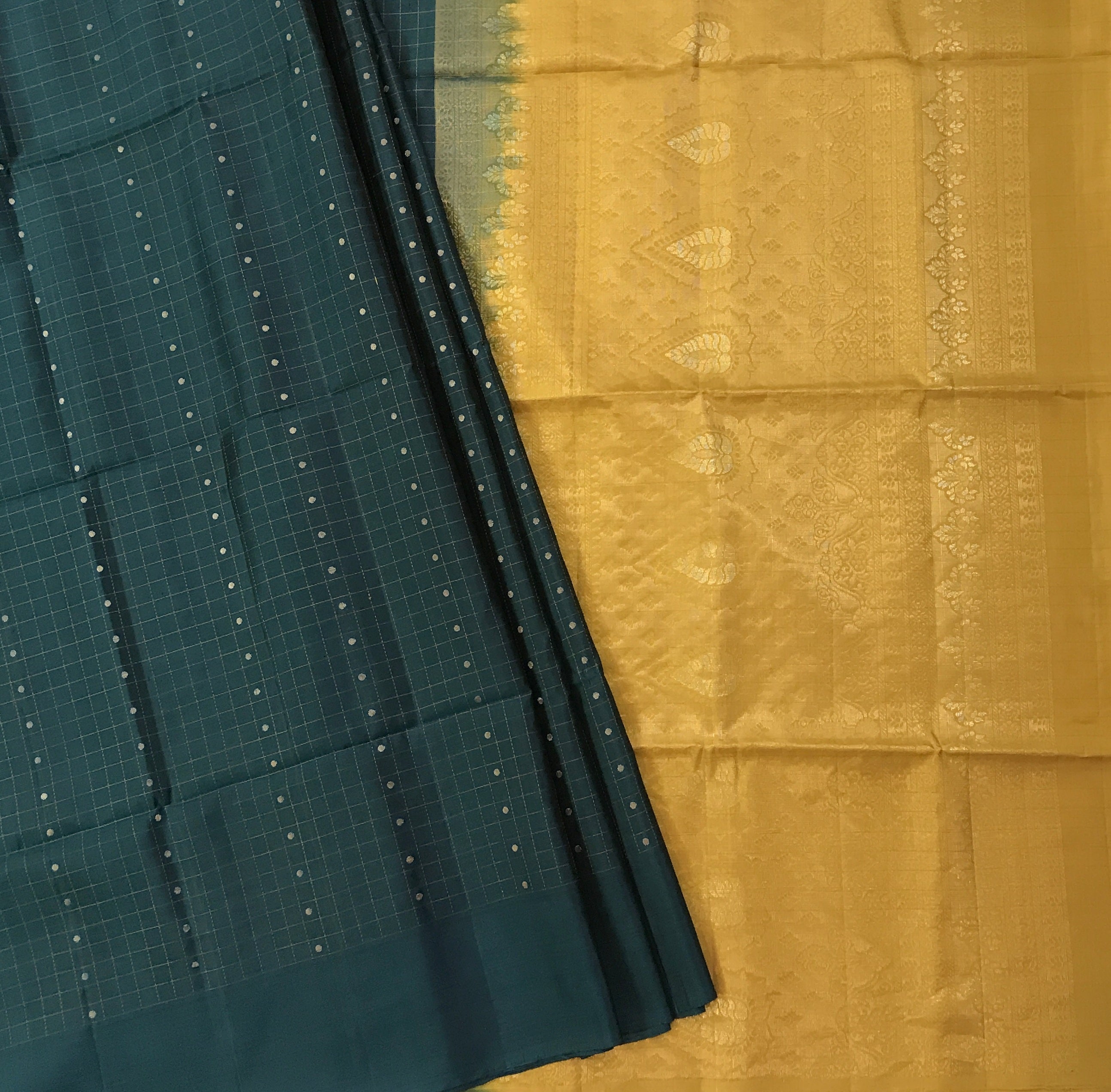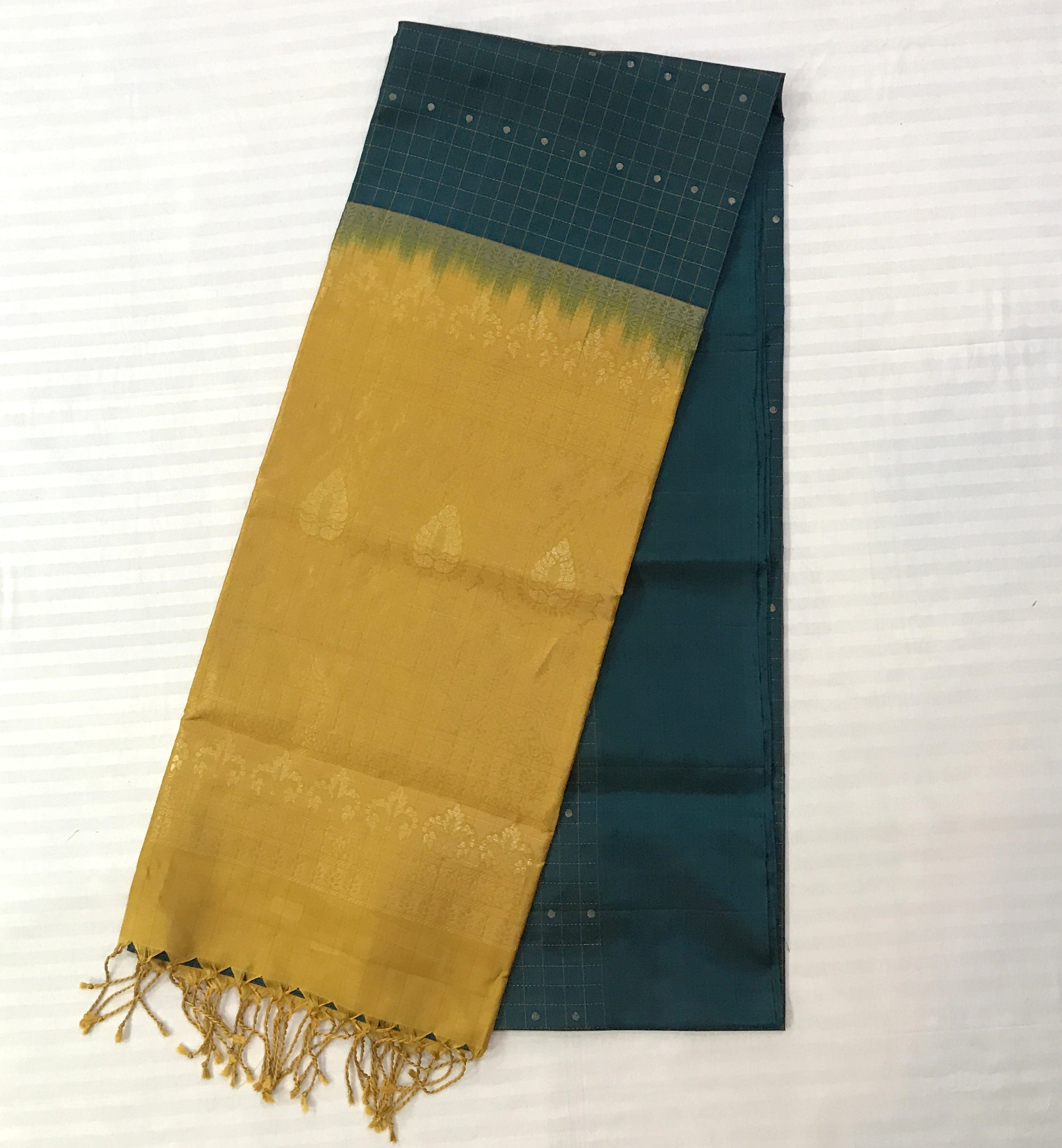 This elegant saree features a striking dual-tone combination of Blue and refreshing yellow, creating a beautiful contrast that feels both classic and contemporary. The blue body is adorned with delicate small checks design with floral buttis, subtly woven to add understated charm without overwhelming the richness of the fabric.