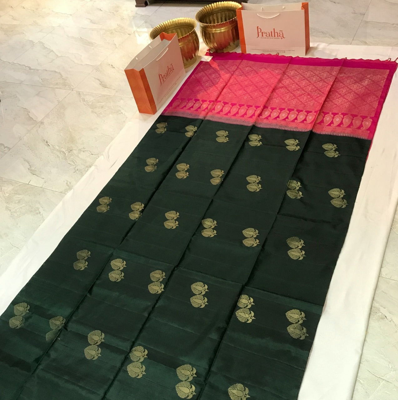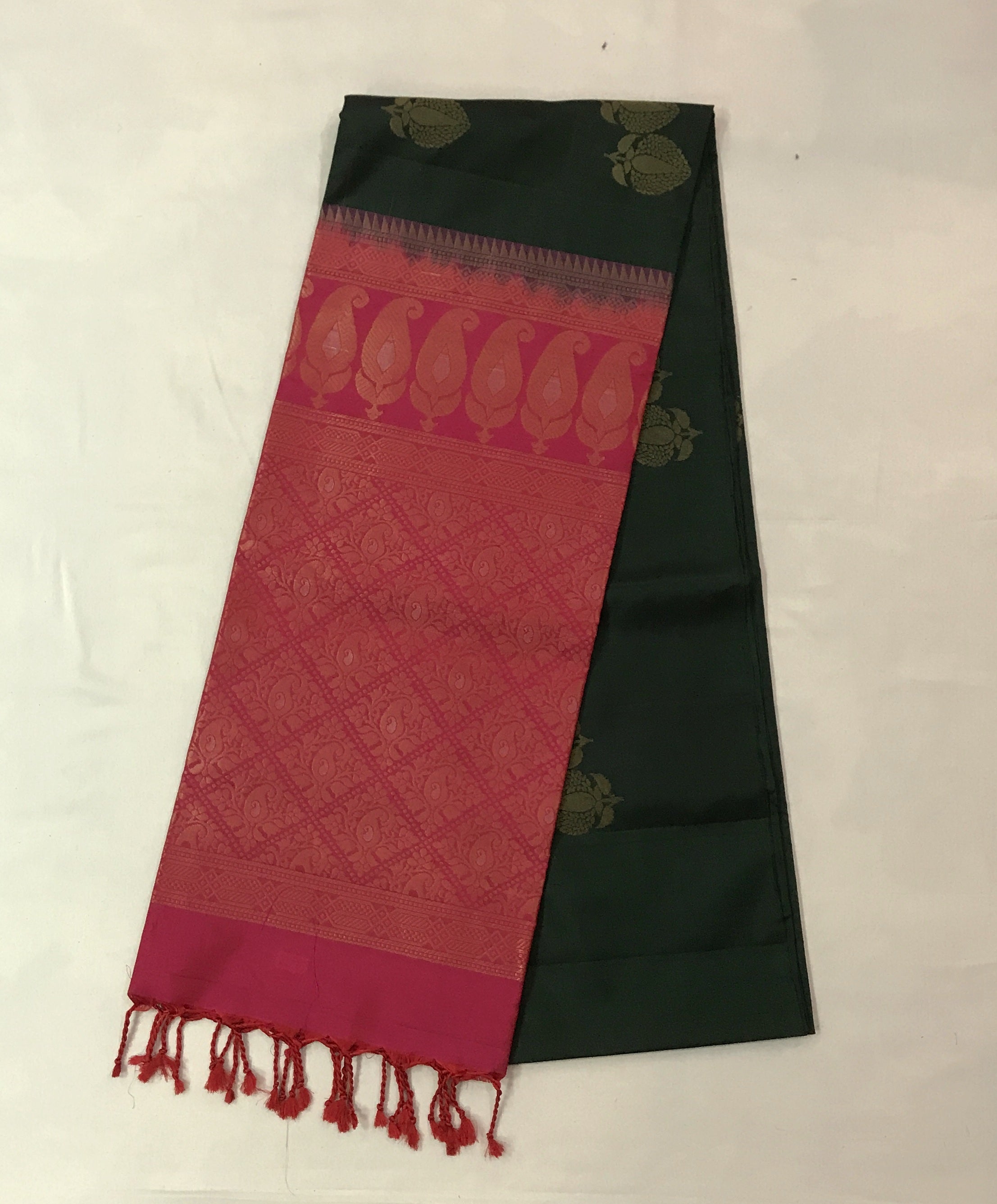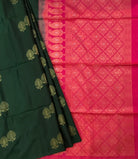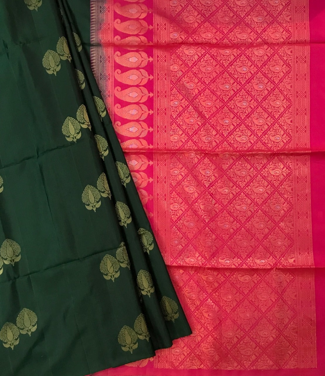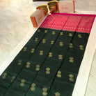 An enteral favorite of so many! A must have in any saree connoisseur's wardrobe! This Light -weight soft silk is an easy to drape saree. Being handwoven, it gives a very comfortable feel, when worn. The green colour spread throughout the saree, with the intricate big shaped dual butti complement each other perfectly. This big butti and pallu created fully in mixed golden zari thread, looks great!