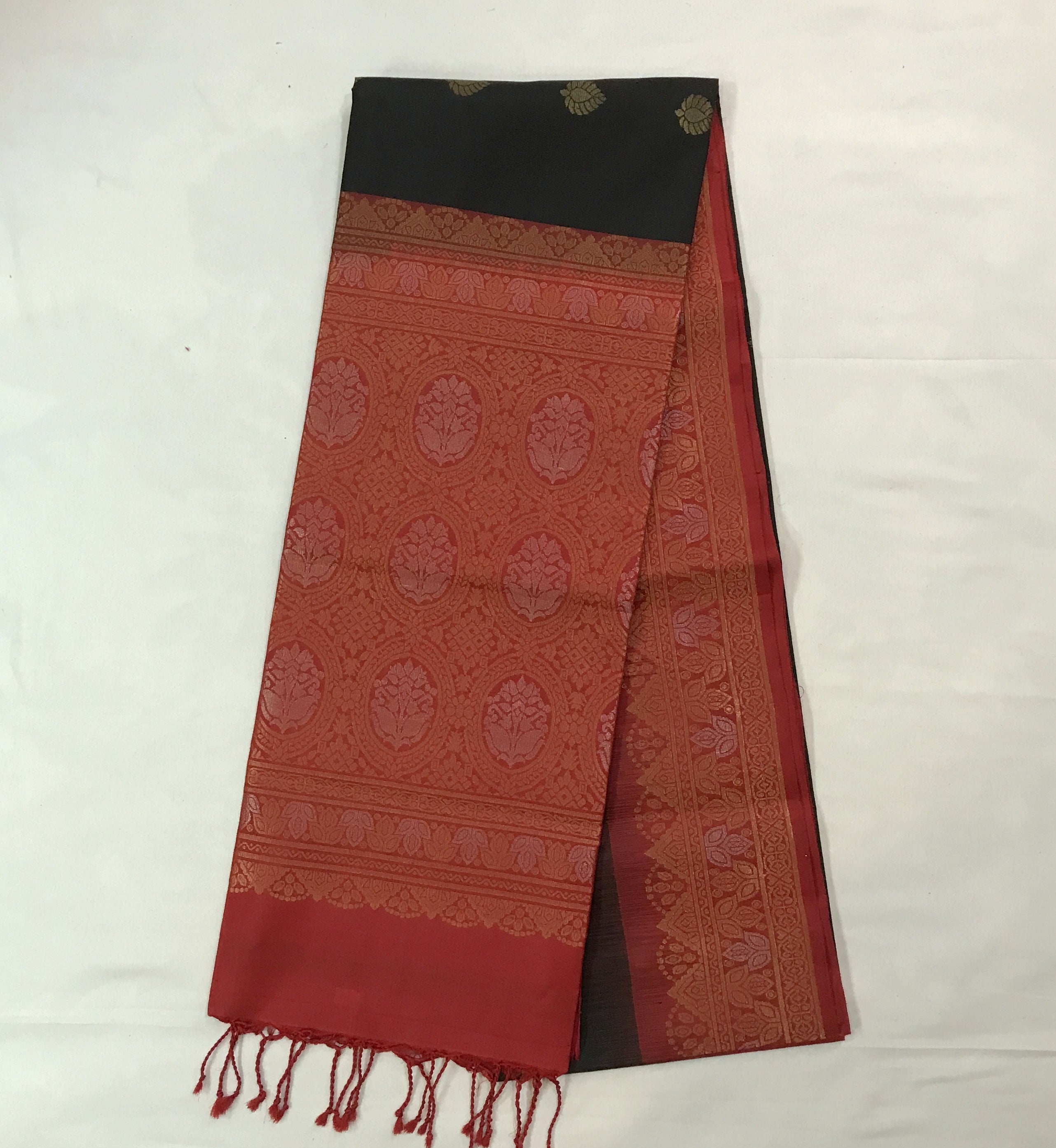 Blouse Colour: Contrast ( Plain red with golden zari border and saree along with tassels )
