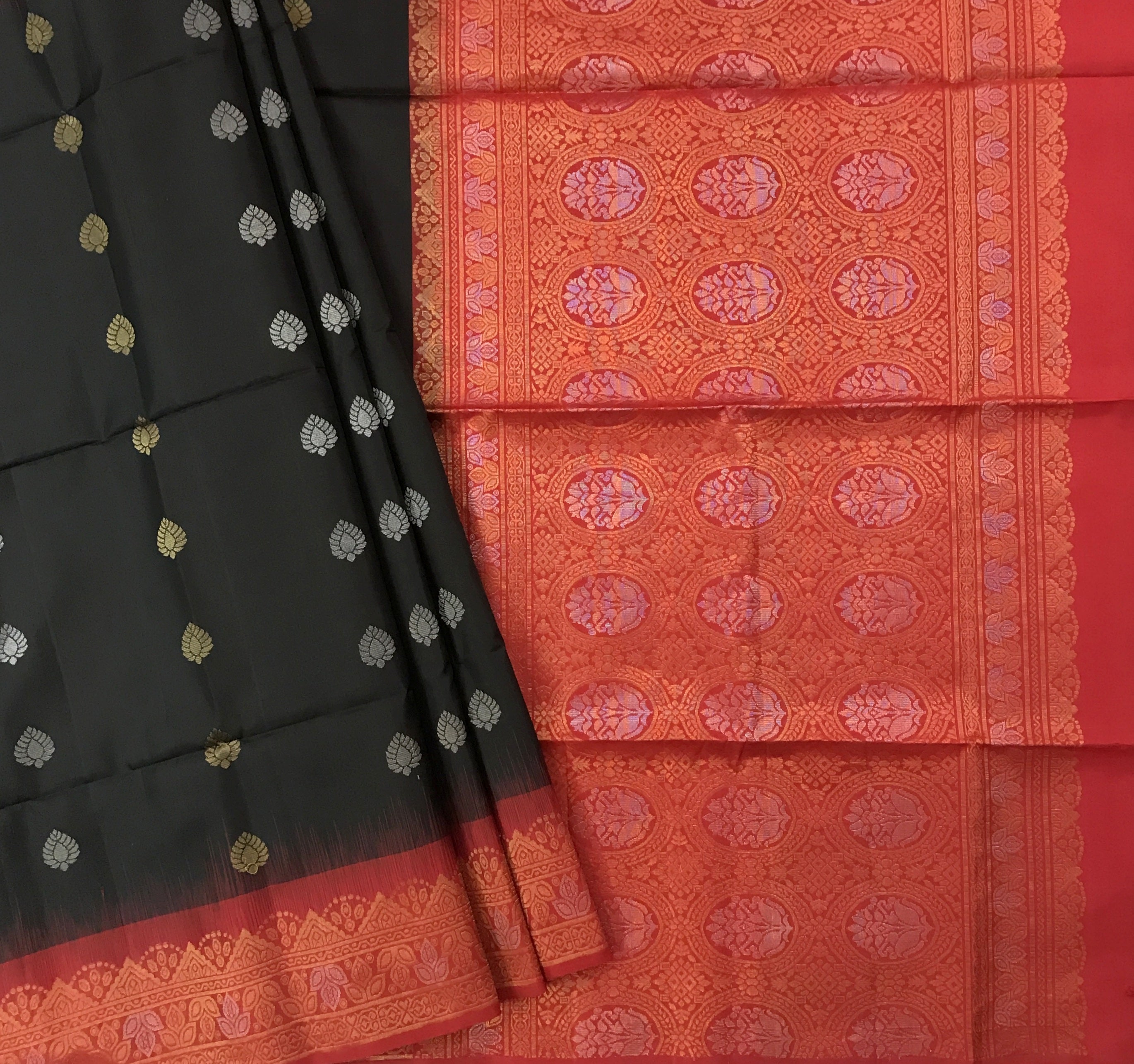 Stylish soft silk saree in a lovely black and red. The saree features shimmering silver zari butti all over the body. A striking contrast border with intricate design adds to its charm, making it ideal for celebrations and gatherings