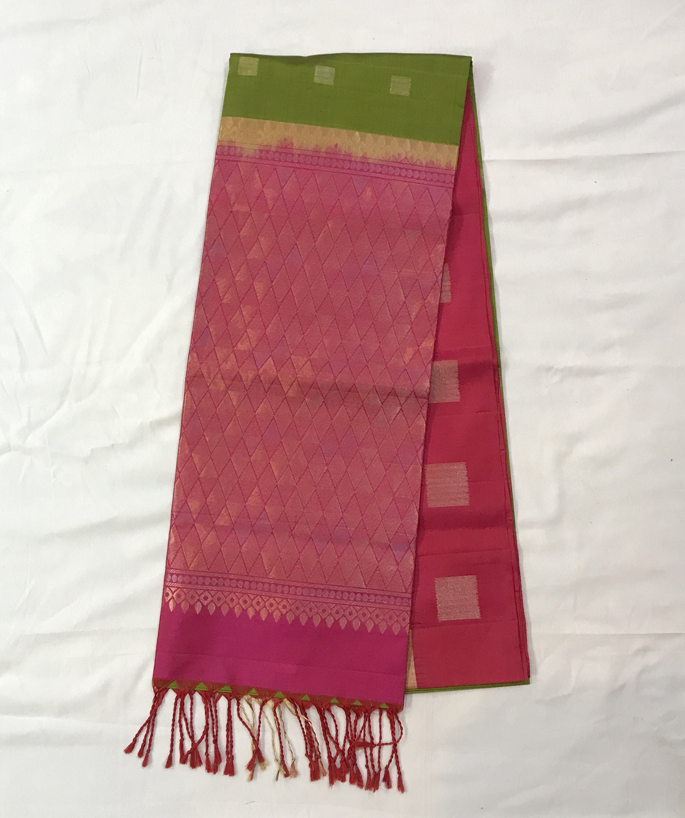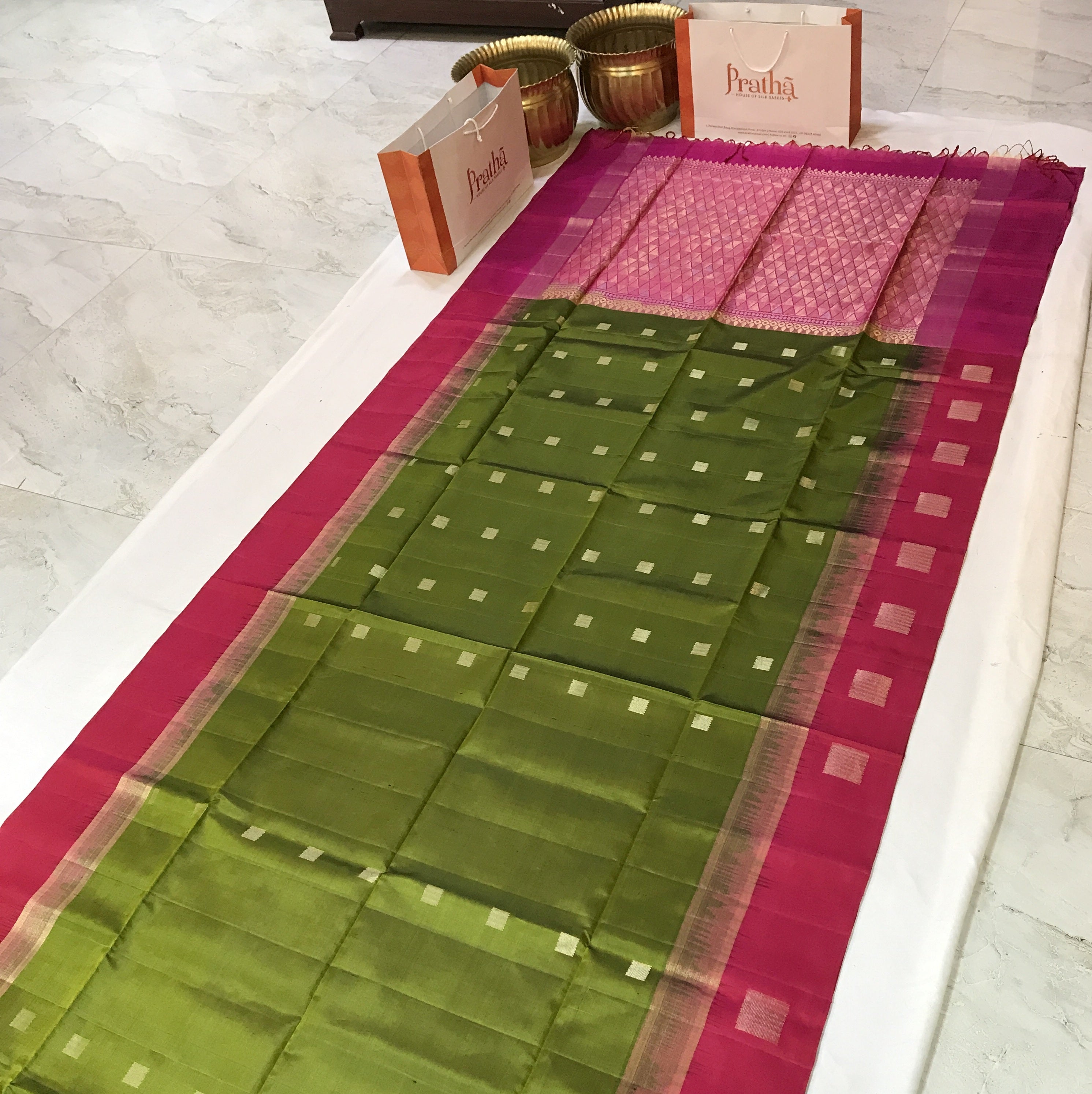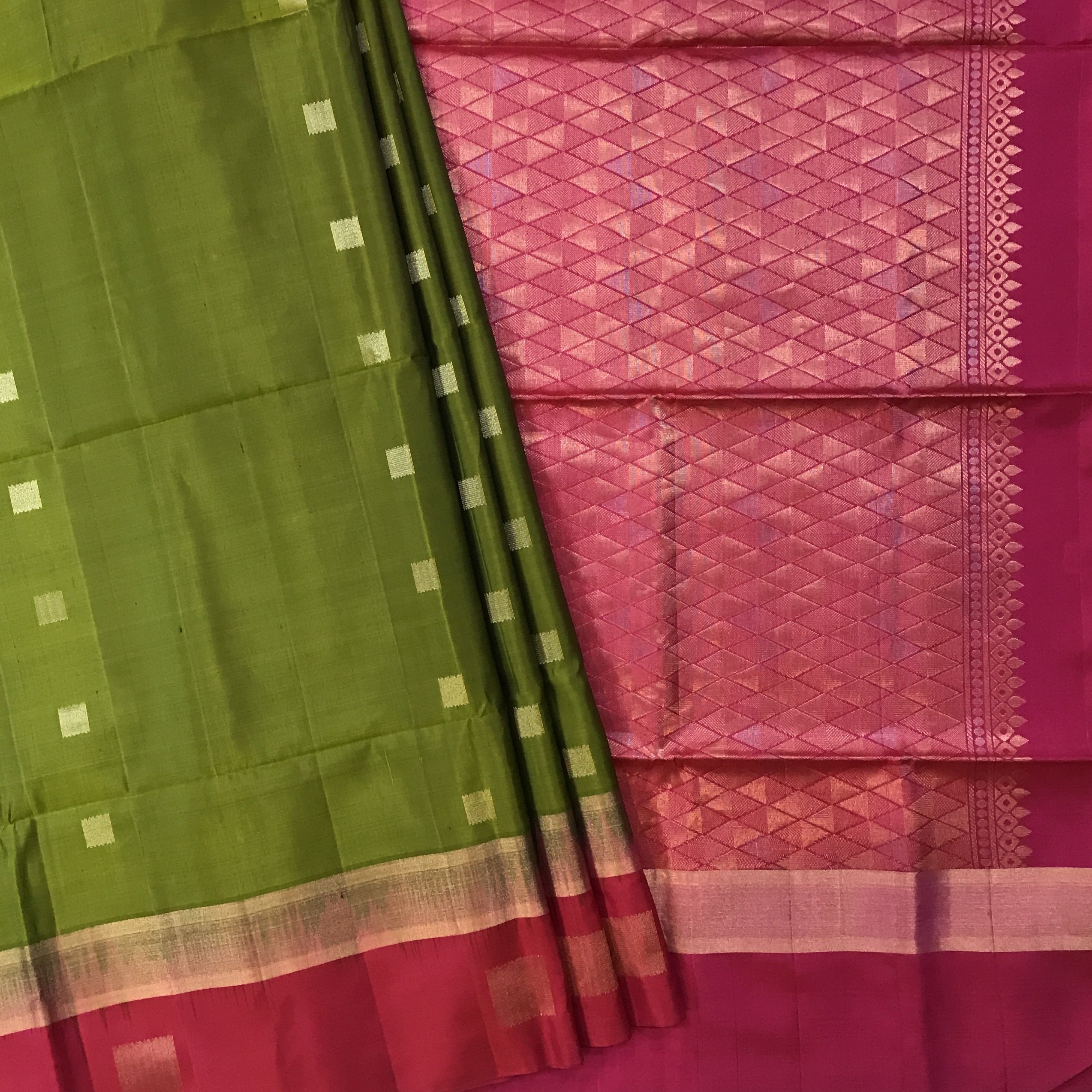This Light -weight soft silk is an easy to drape saree. Being handwoven, it gives a very comfortable feel, when worn. The fantastic shade of mehendi-green spread throughout the saree with small square shaped golden-silver zari butti and border in pink color with design pallu looks beautiful.