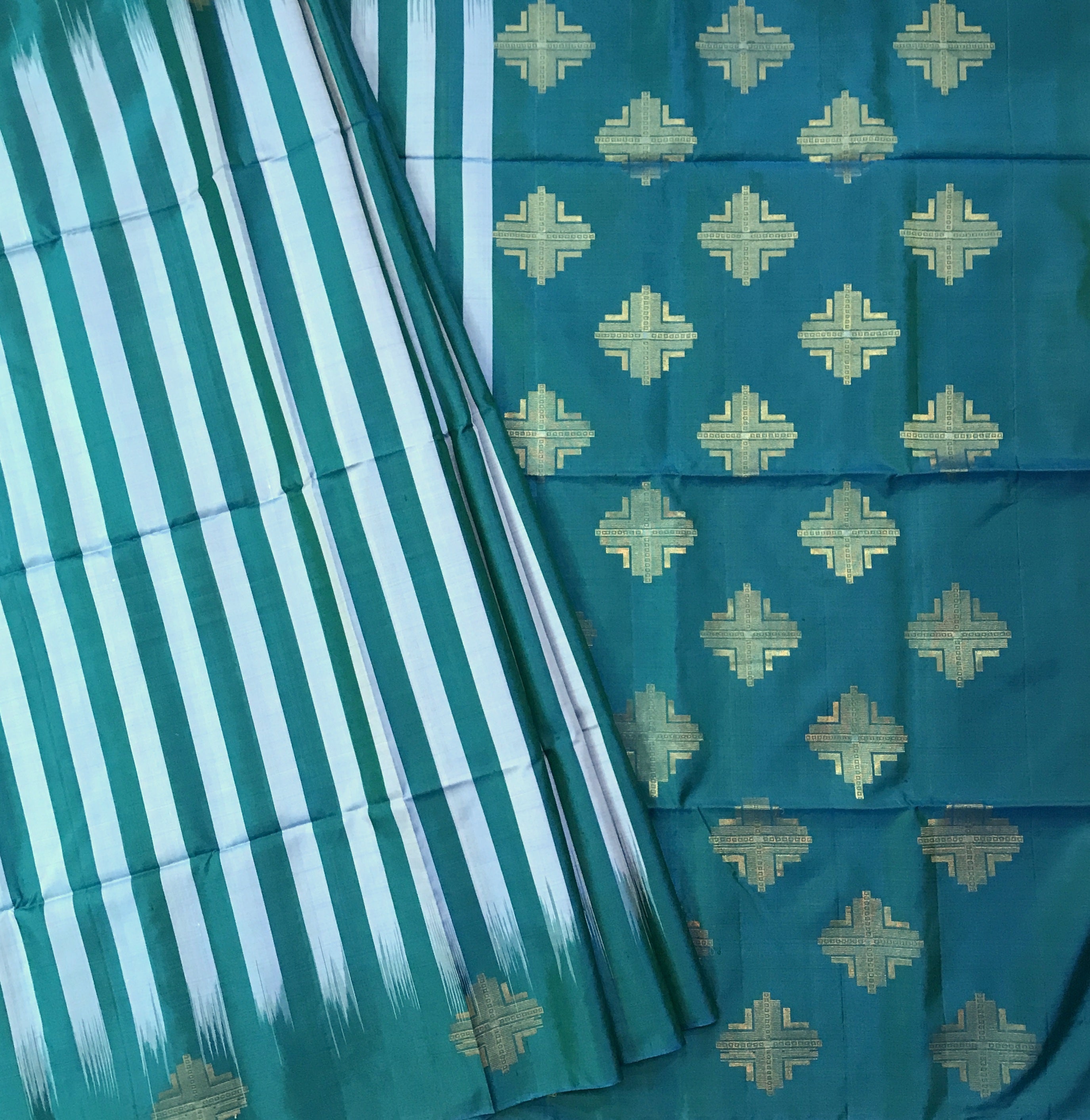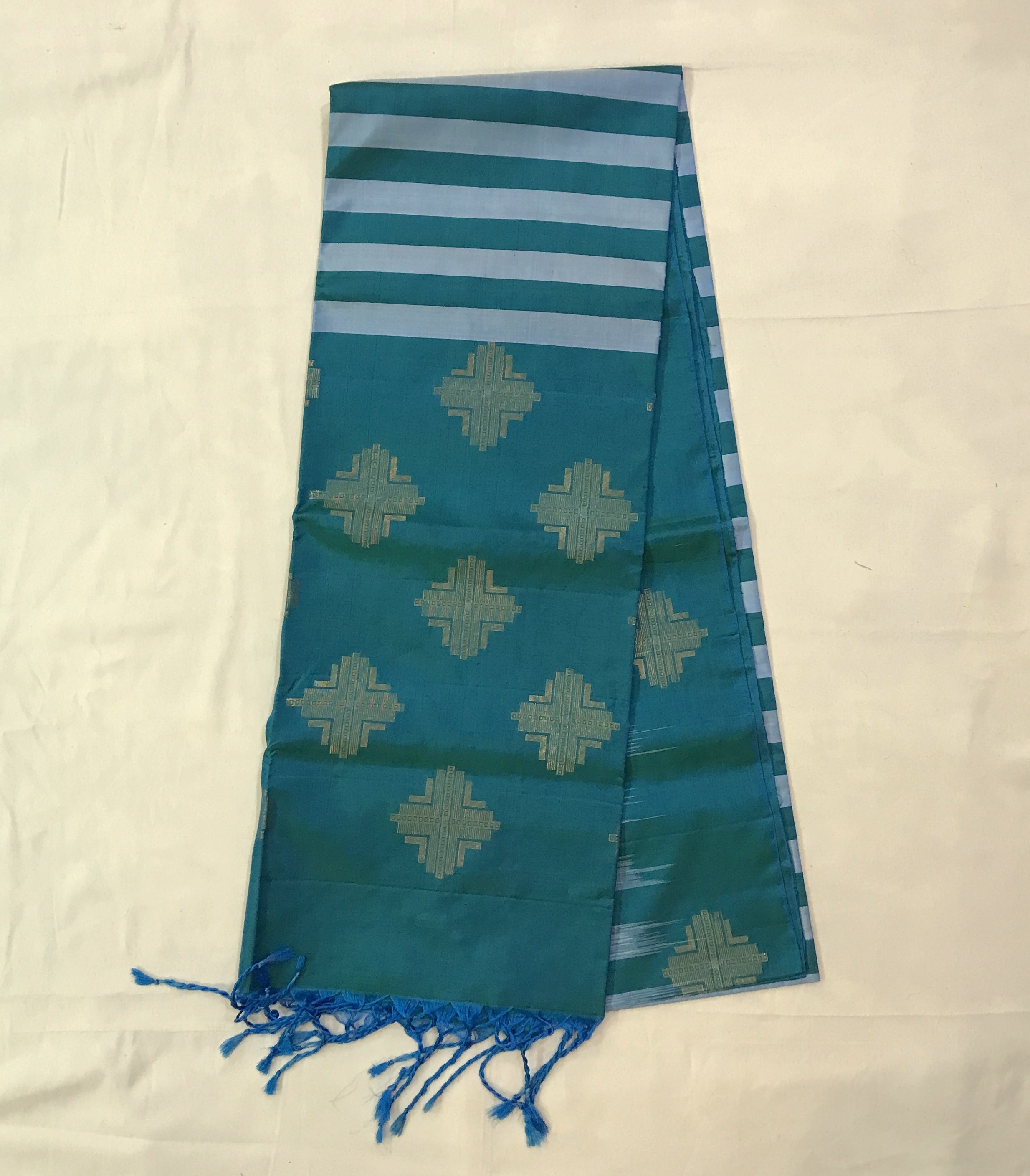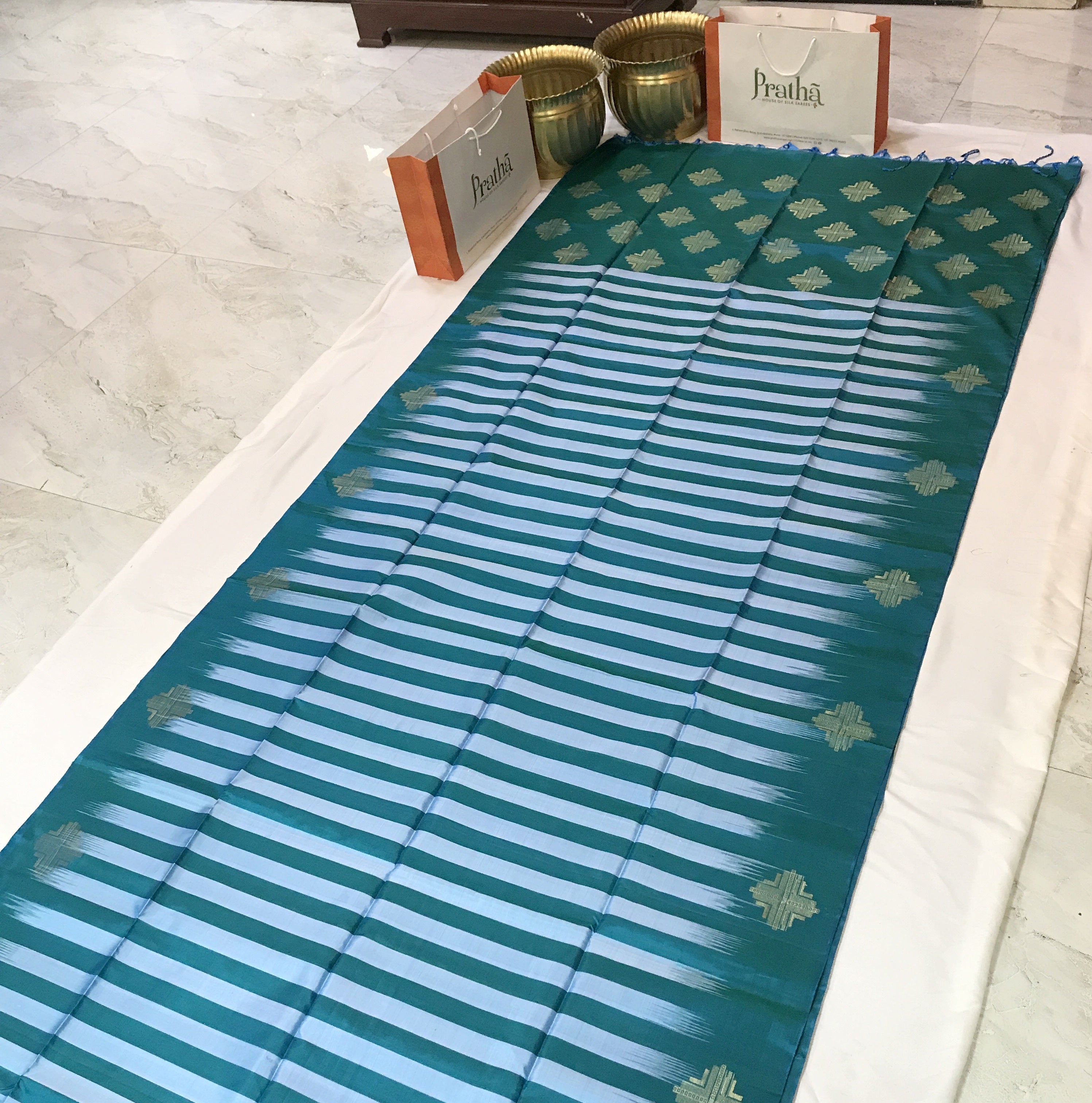 This lightweight soft silk saree is a delight to drape, offering supreme comfort with its handwoven finesse. The saree features a beautiful peacock base adorned with elegant peacock-silver zari zig-zag lines running throughout the body, adding a touch of contemporary charm to its traditional appeal. A contrasting peacock coloured border with intricate detailing, paired with a rich design pallu, enhances the visual appeal and adds a festive flair.