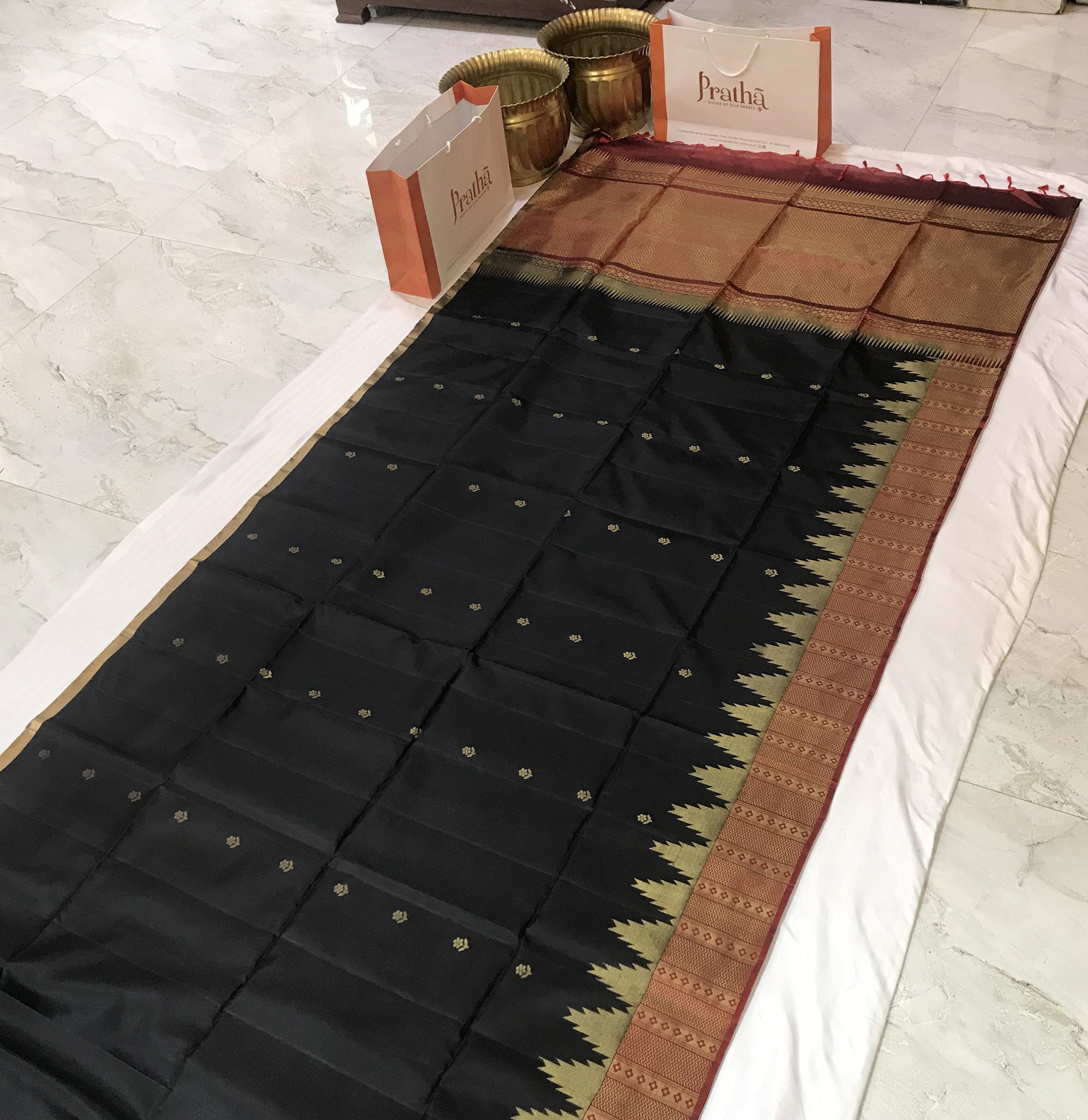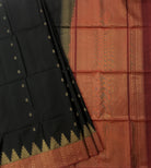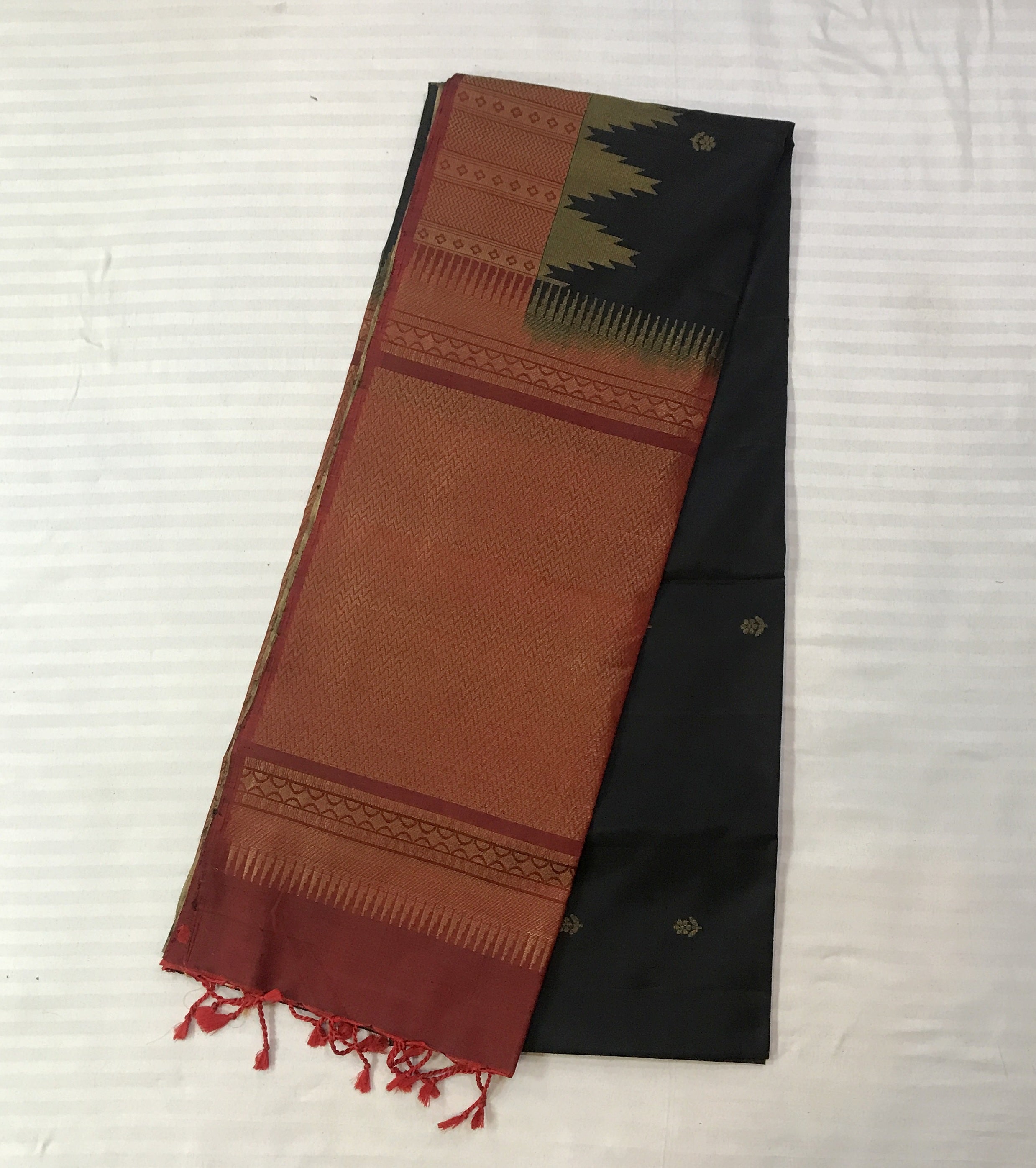 Stylish soft silk saree in a lovely black and red. The saree features shimmering golden zari butti all over the body. A striking temple contrast border with intricate design adds to its charm, making it ideal for celebrations and gatherings