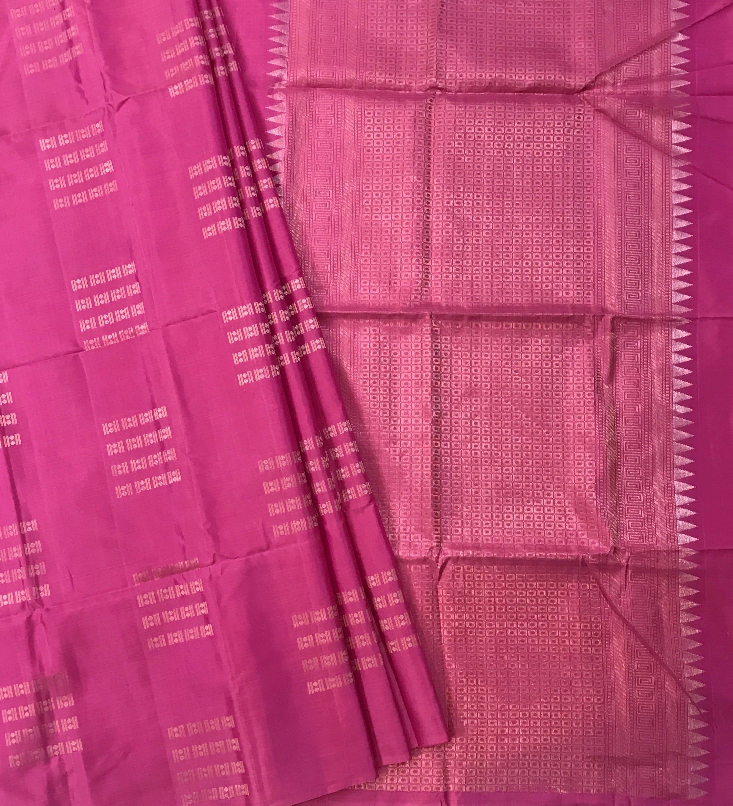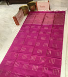 A very beautiful shade of pink coloured Soft Silk with big butti and makes this a stylish contemporary saree. The square shaped butti design running through the saree with coloured golden zari pallu makes this weave a favorite of many.