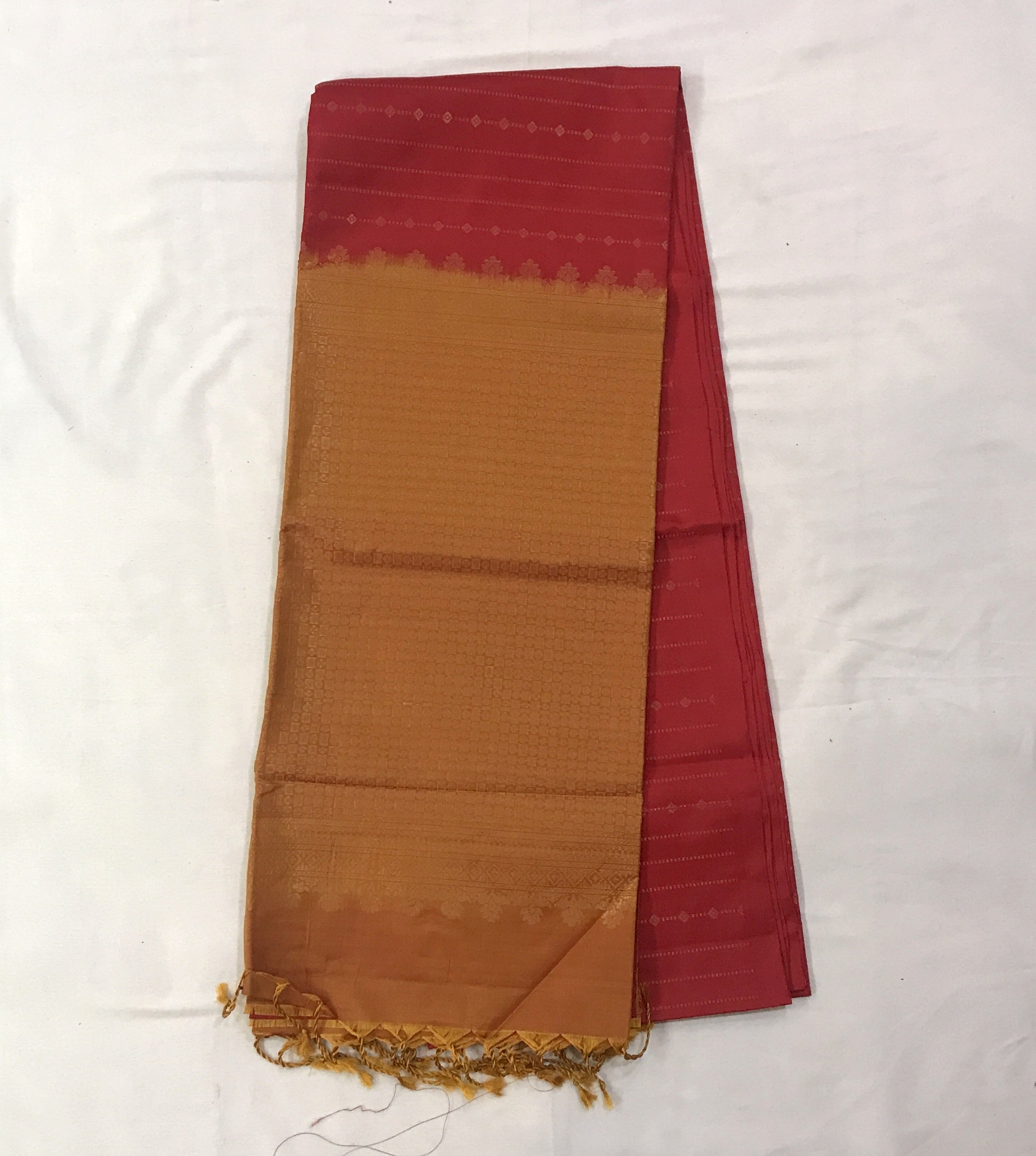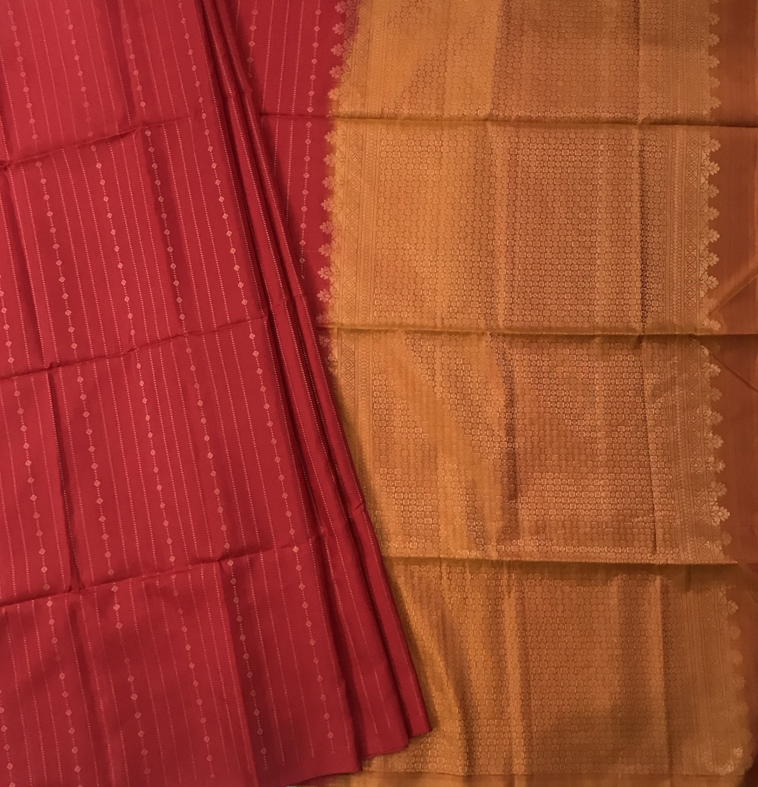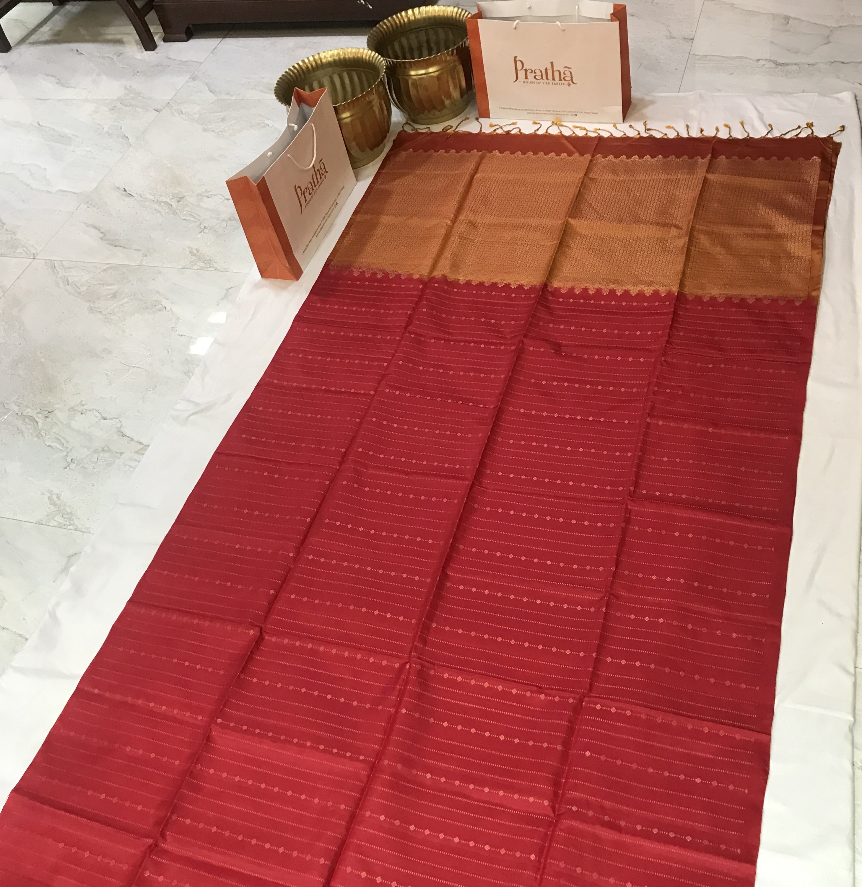 A very beautiful shade of red coloured Soft Silk with lines design and makes this a stylish contemporary saree. The intricate zari lines design running through the saree with coloured green golden zari pallu makes this weave a favorite of many.