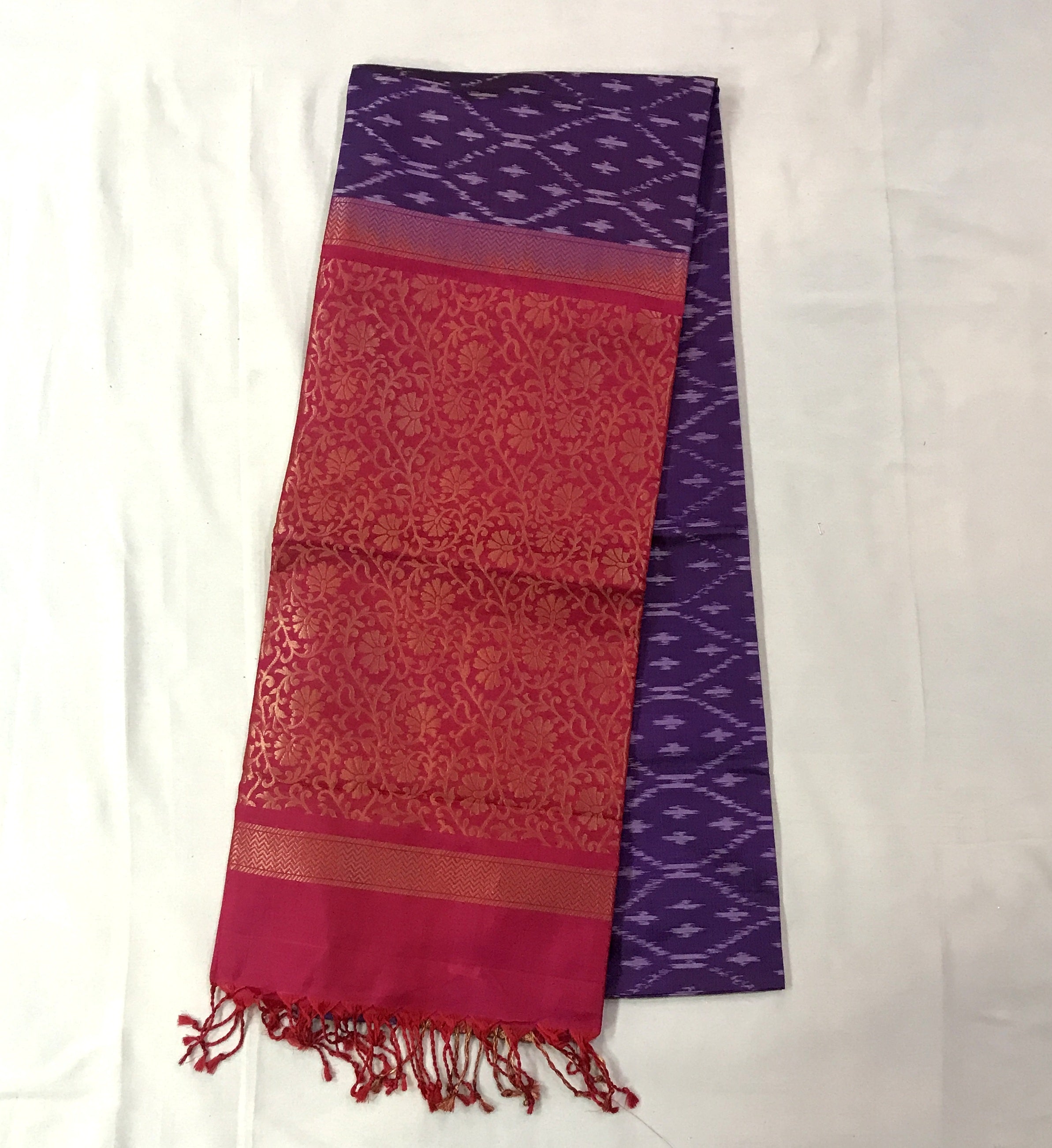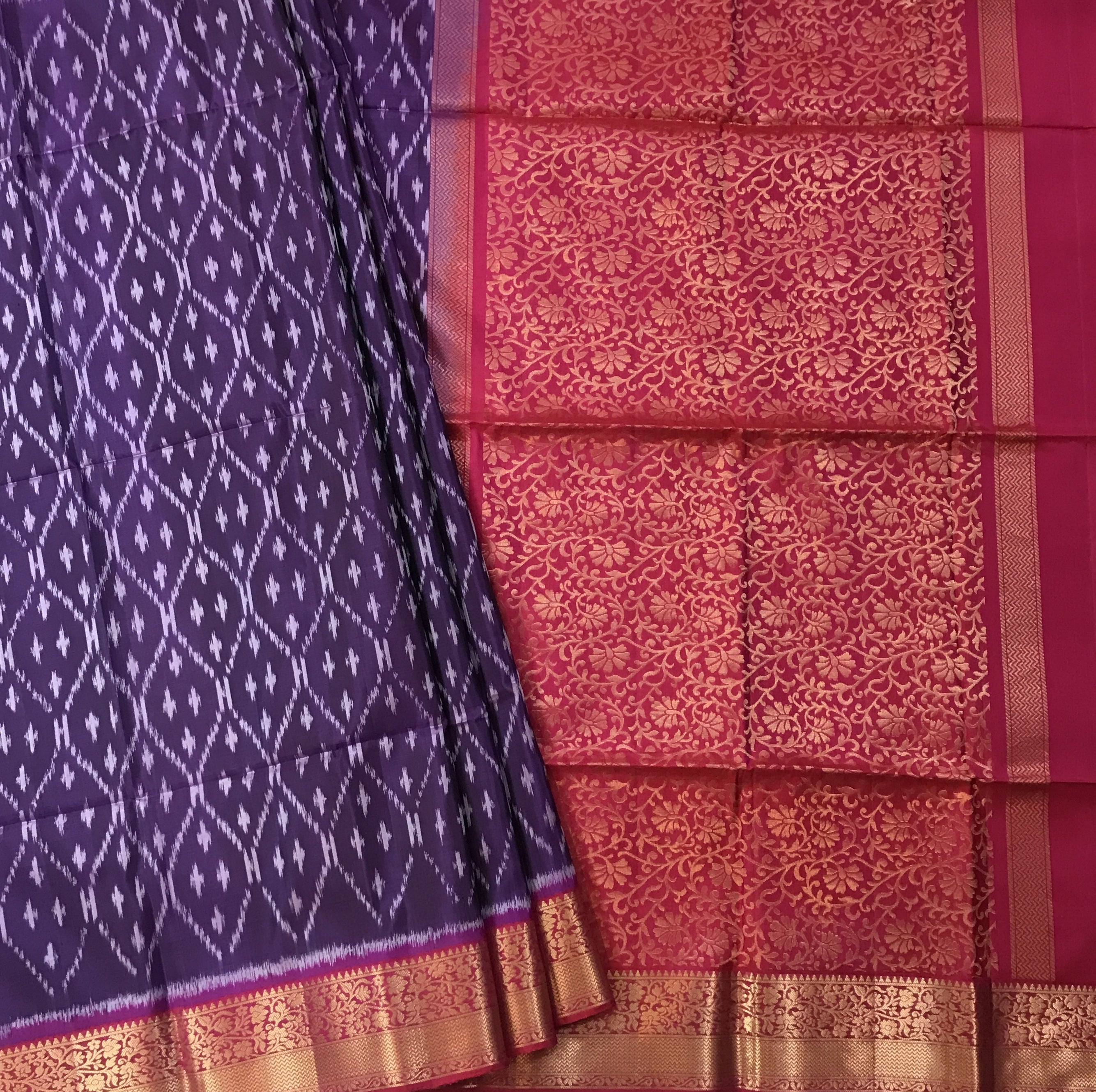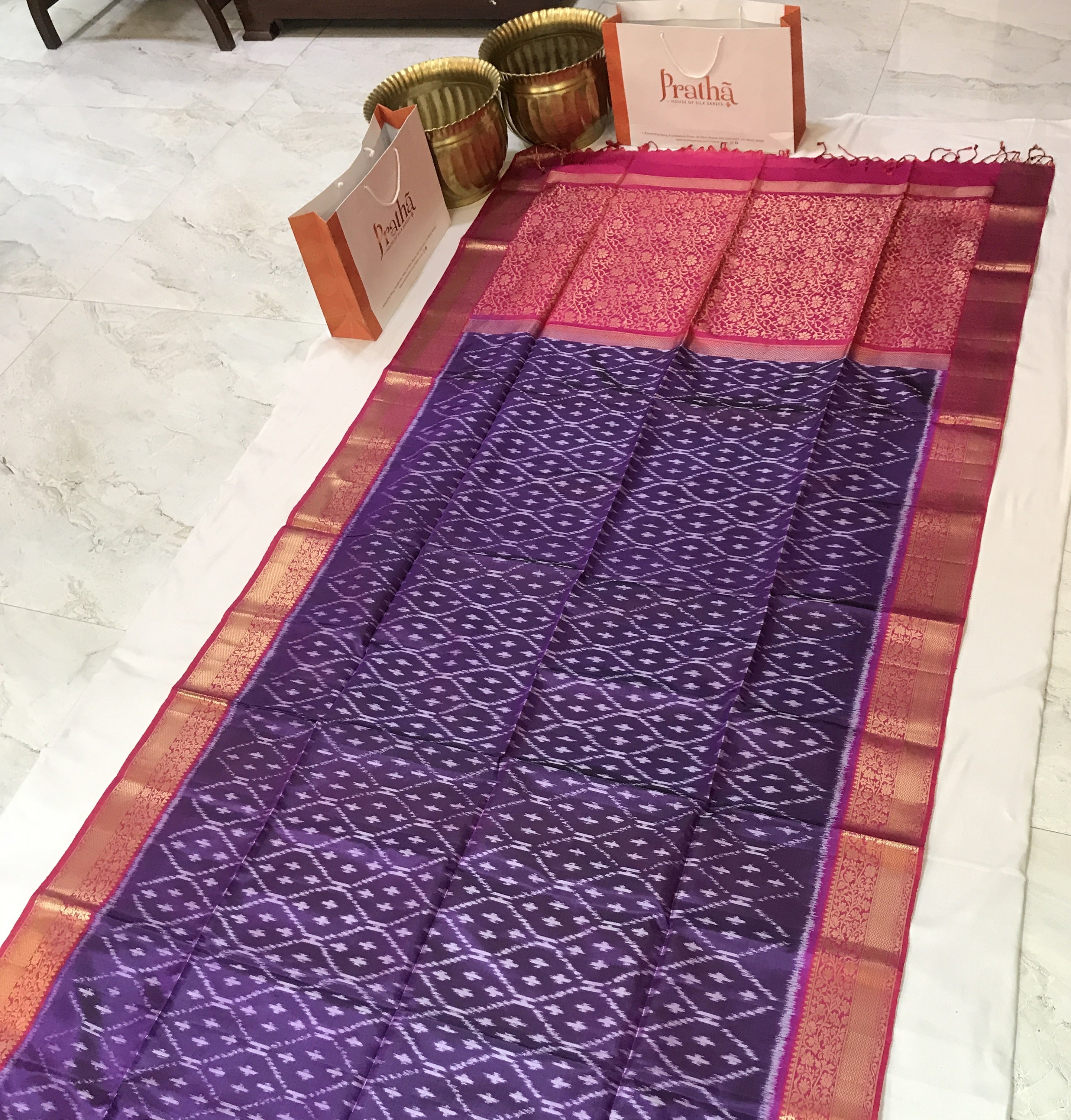 A very pretty shade of purple Soft Silk Ikat saree with its Ikkat design all over the saree , perfect saree for summers! Don't miss the Pink coloured golden zari design traditional border is looks very beautiful with charming design golden zari pallu. Light in weight and easy to drape.