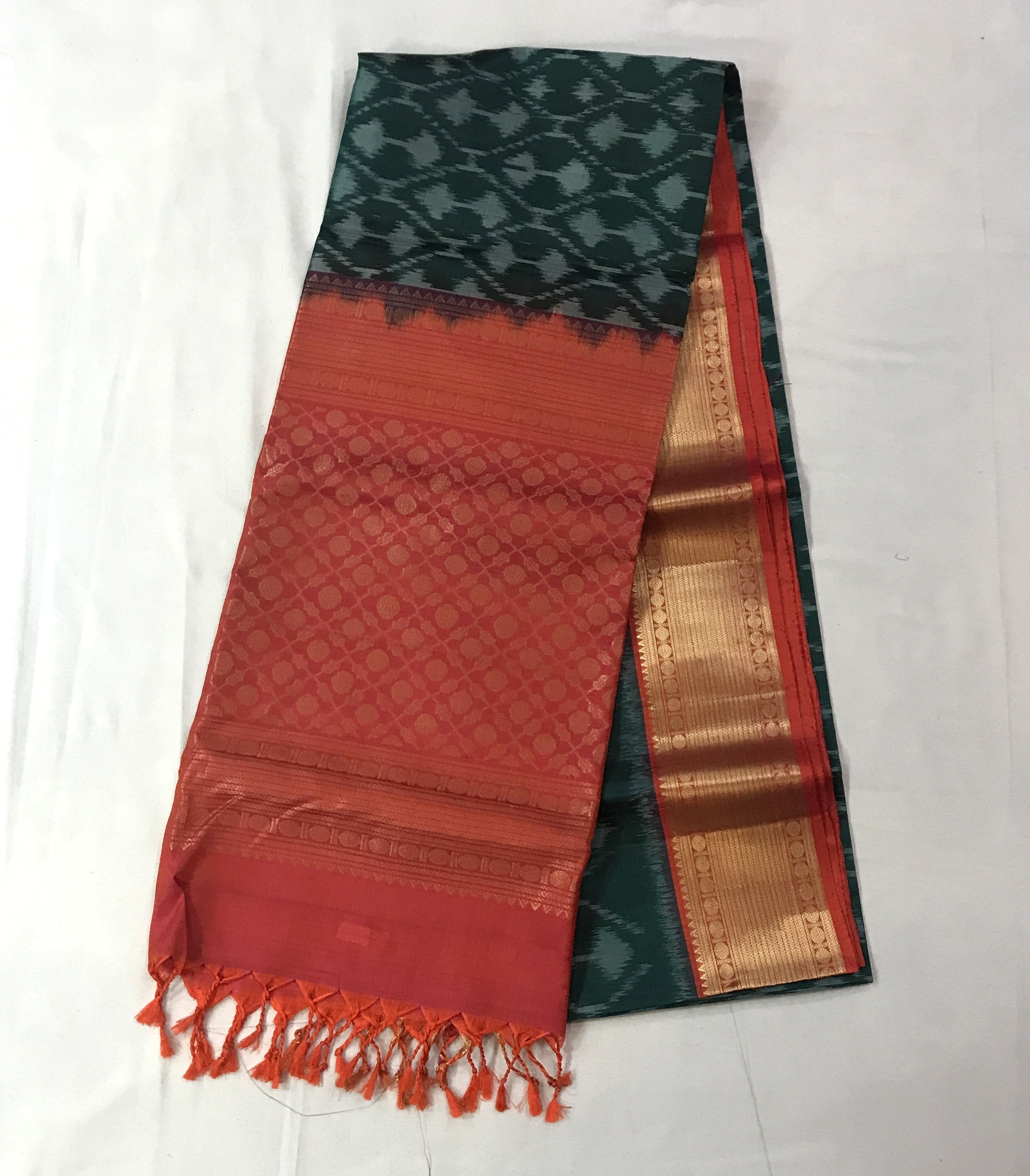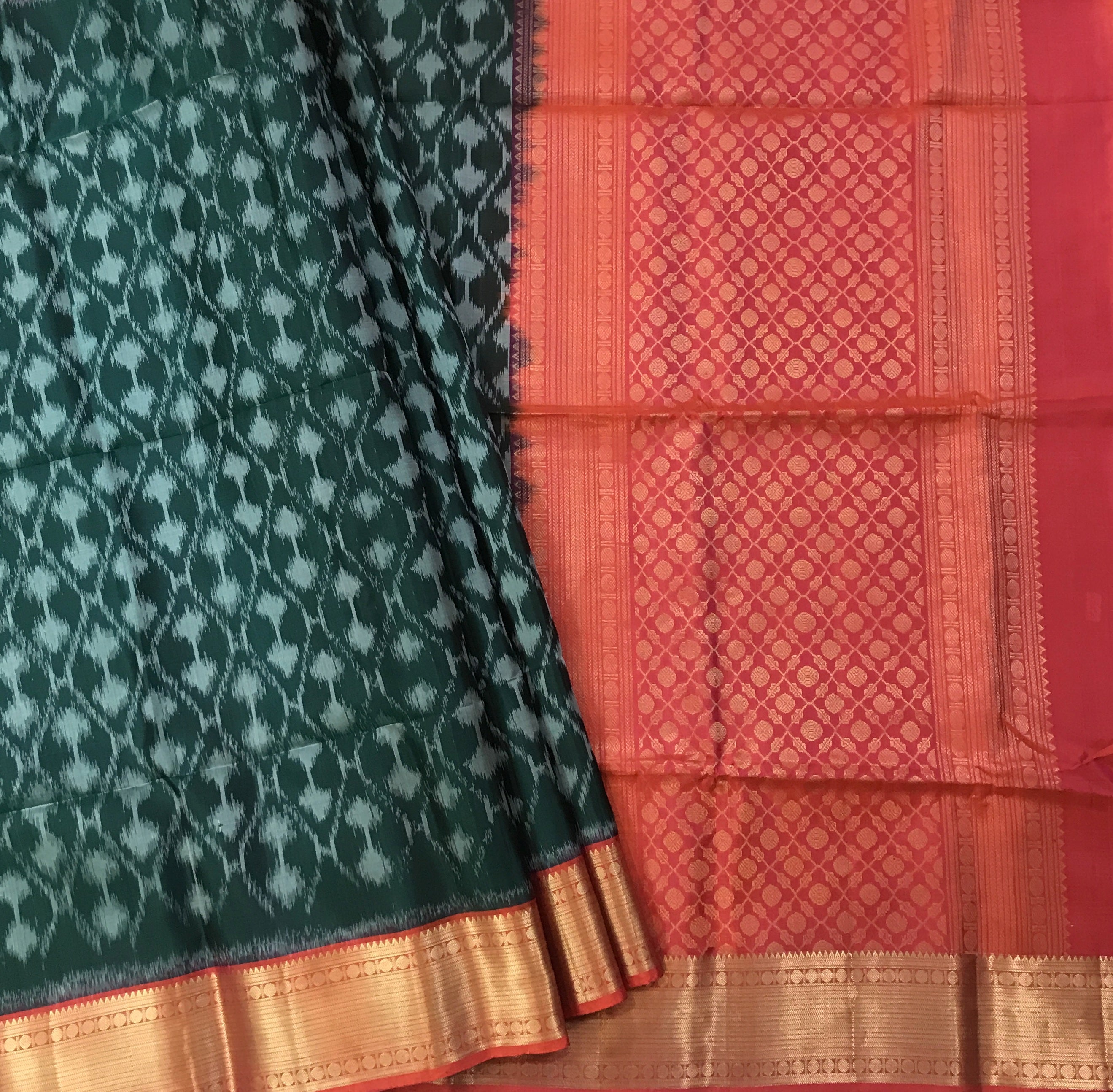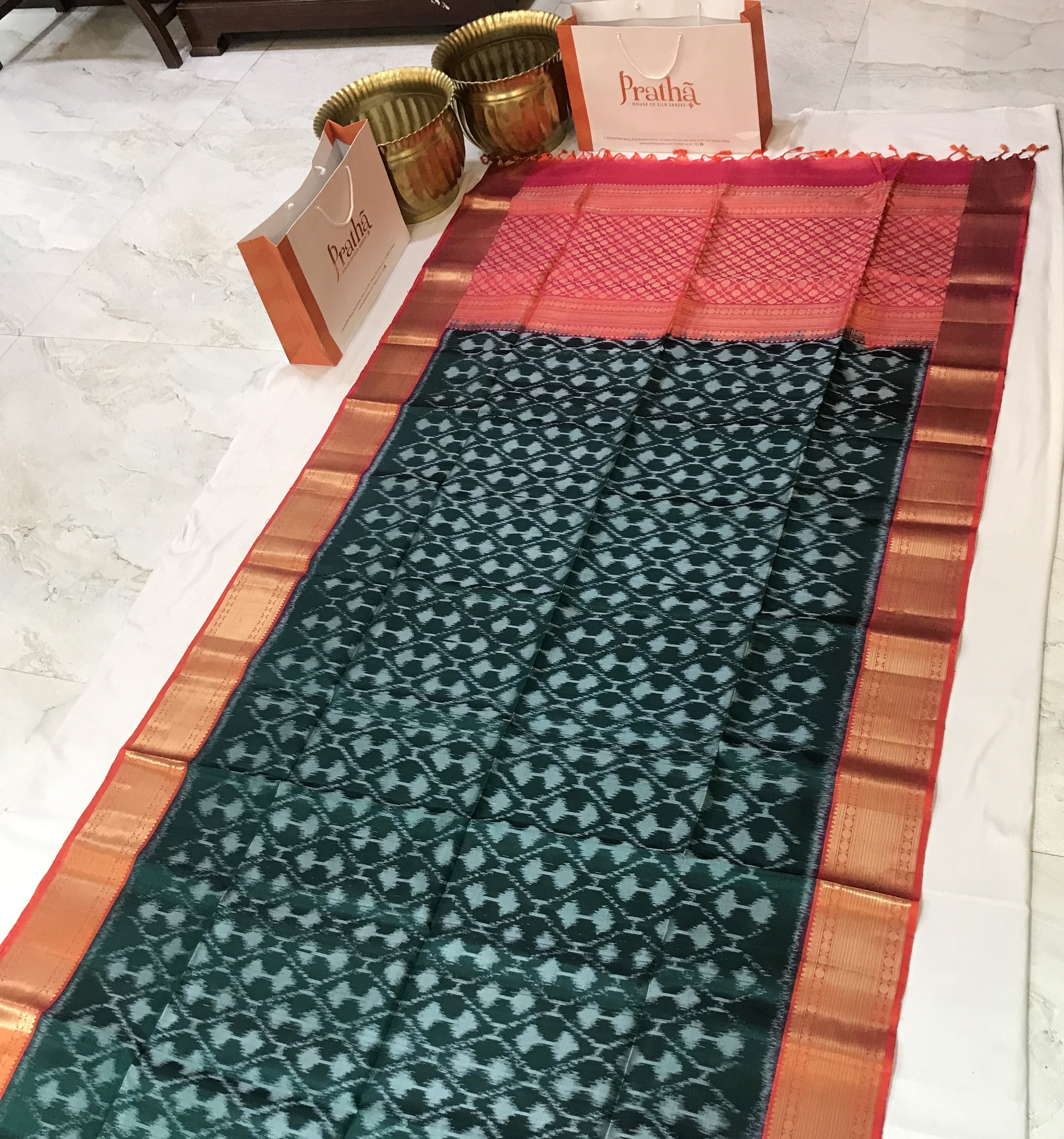A very pretty shade of green Soft Silk Ikat saree with its Ikkat design all over the saree , perfect saree for summers! Don't miss the red coloured golden zari design traditional border is looks very beautiful with charming design golden zari pallu. Light in weight and easy to drape.