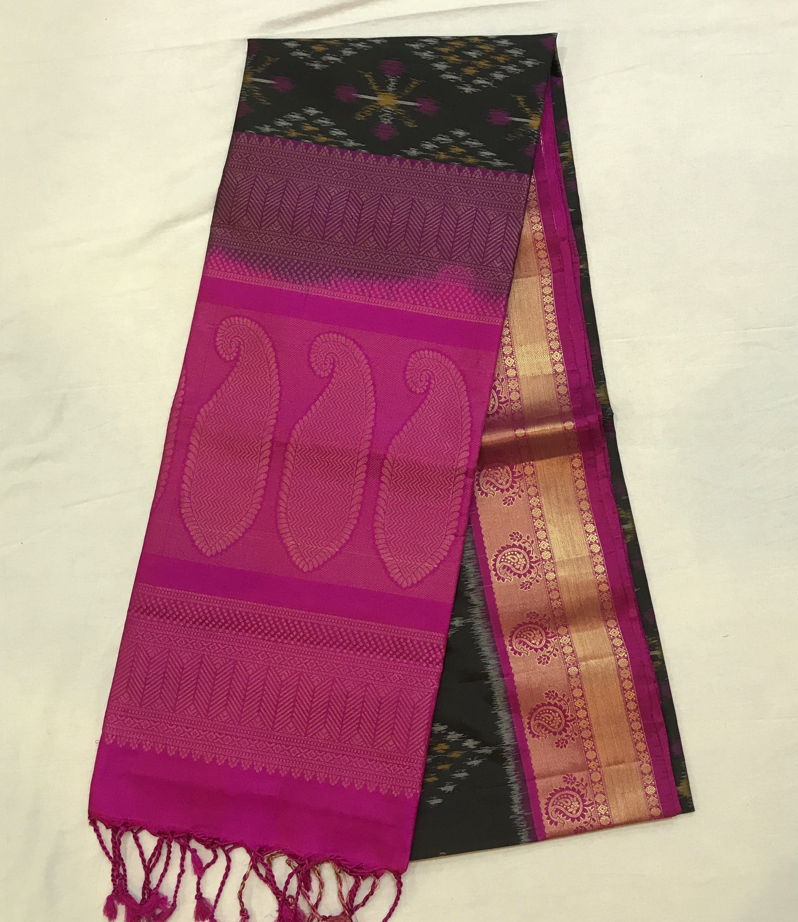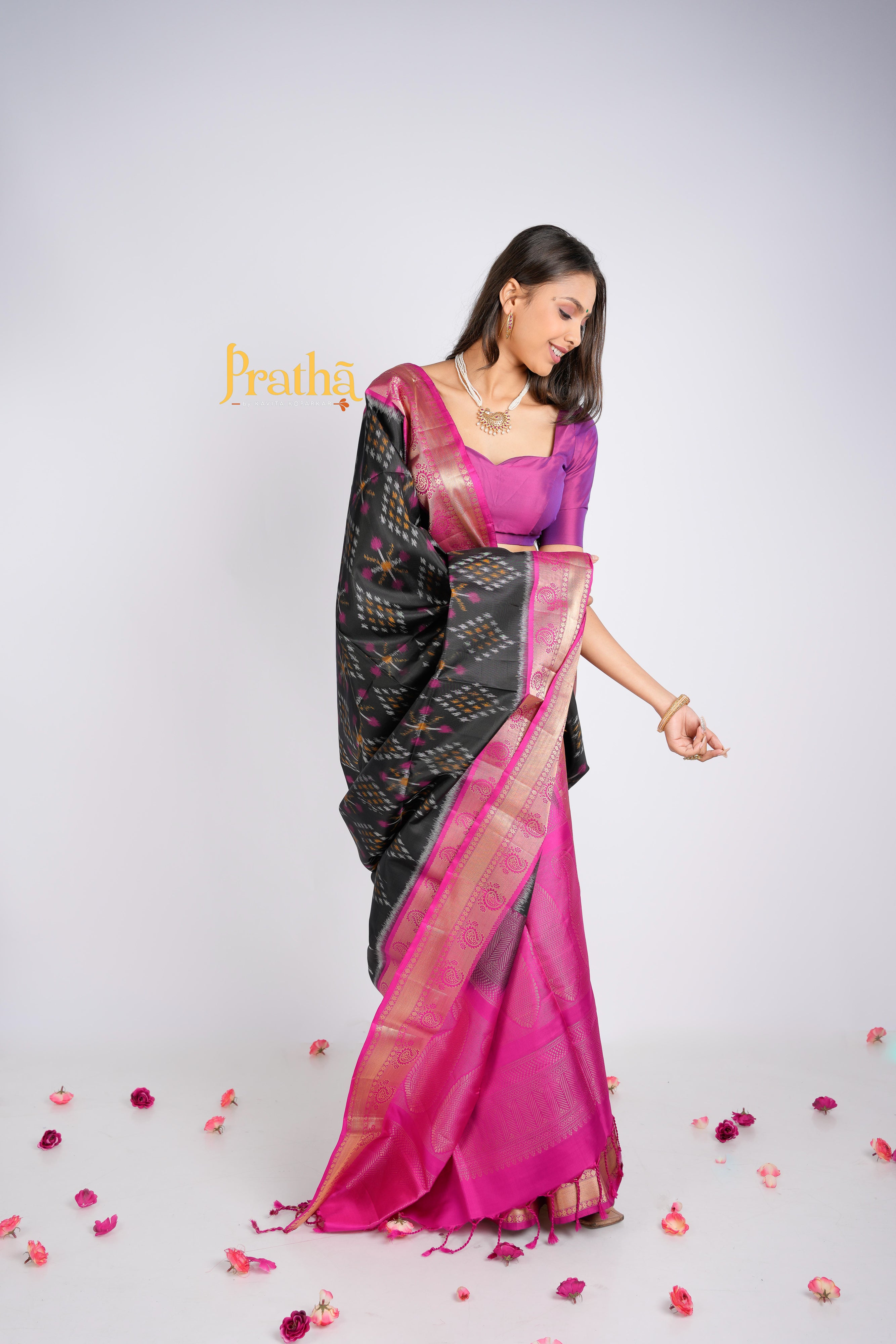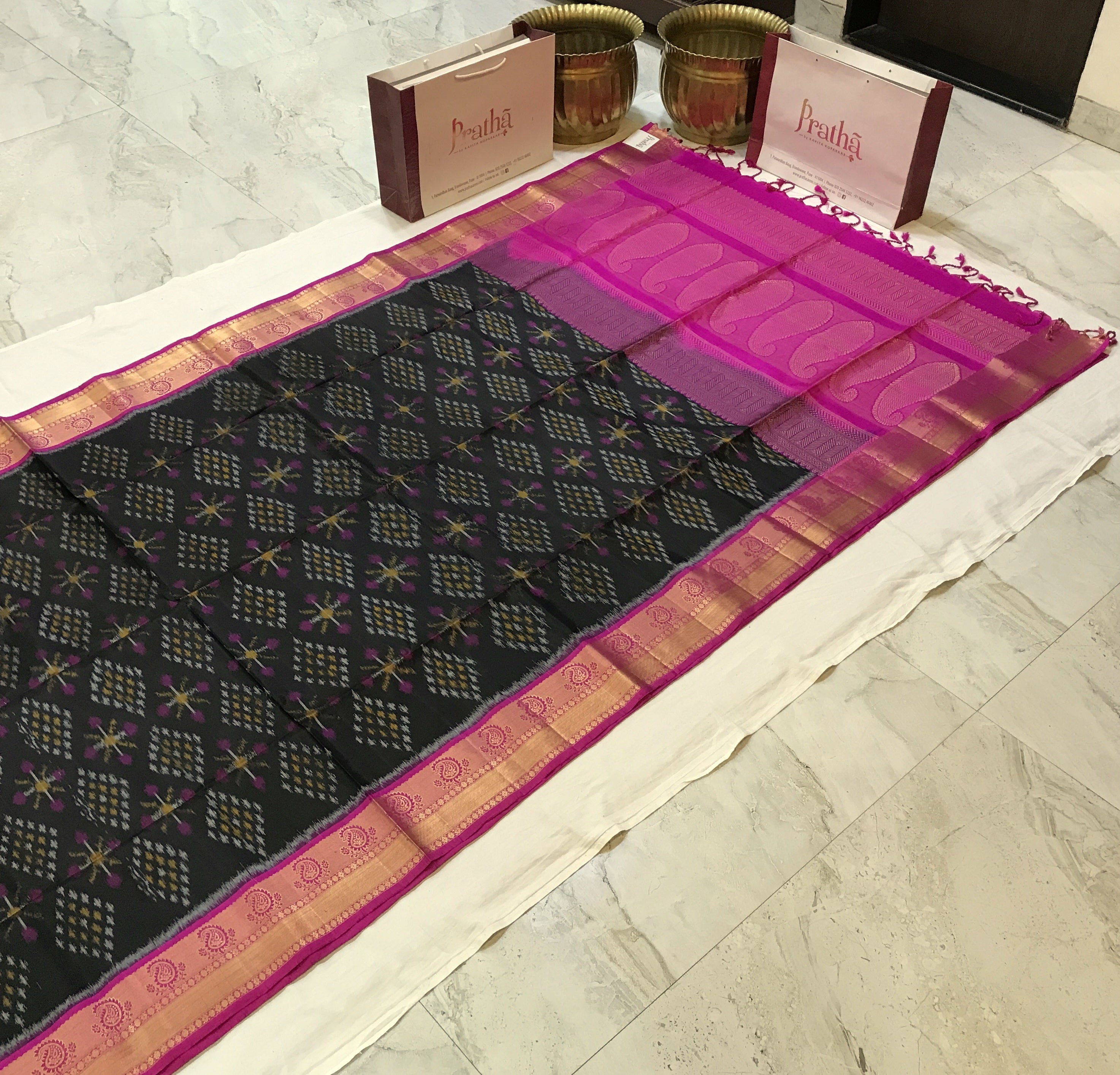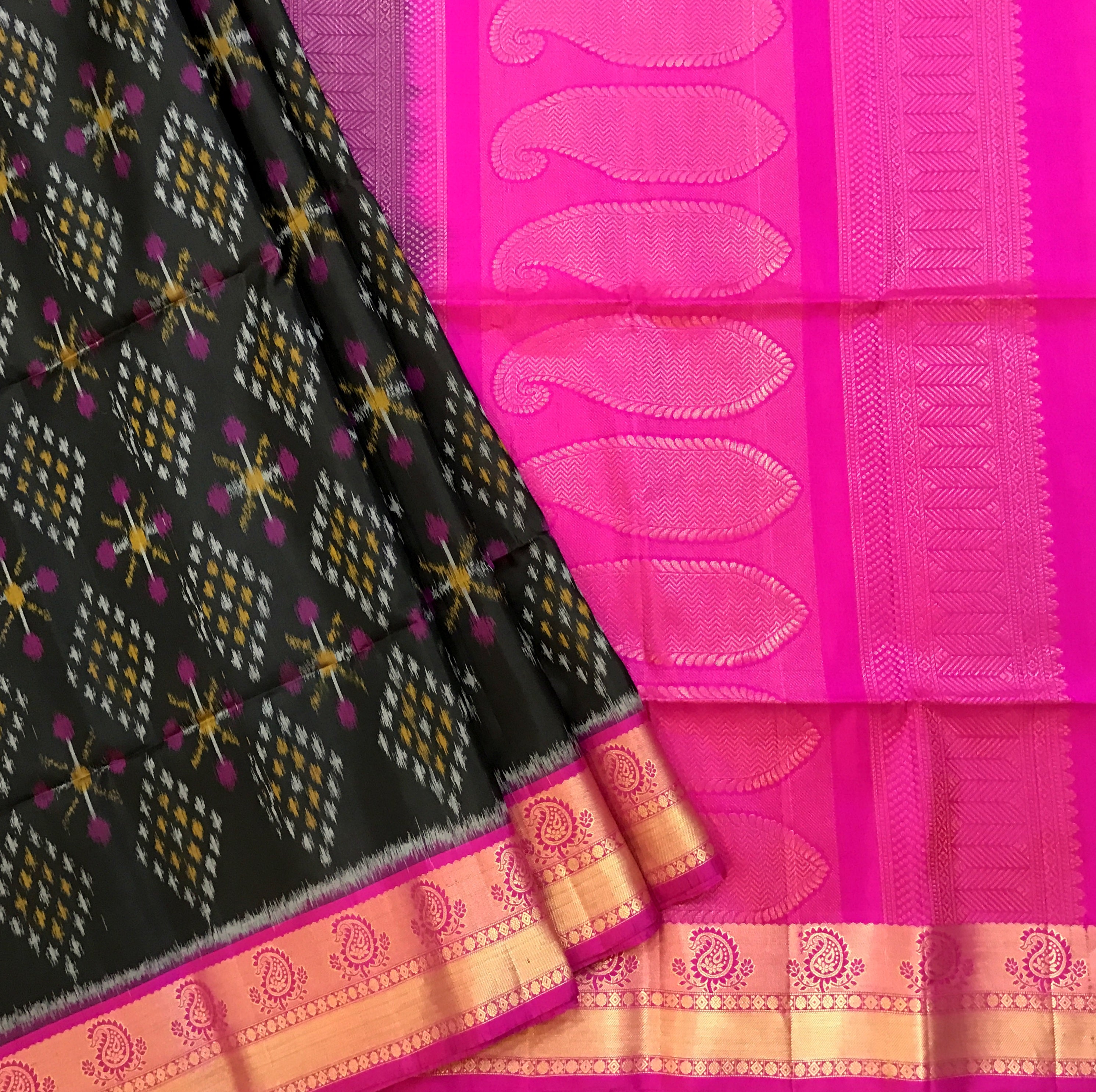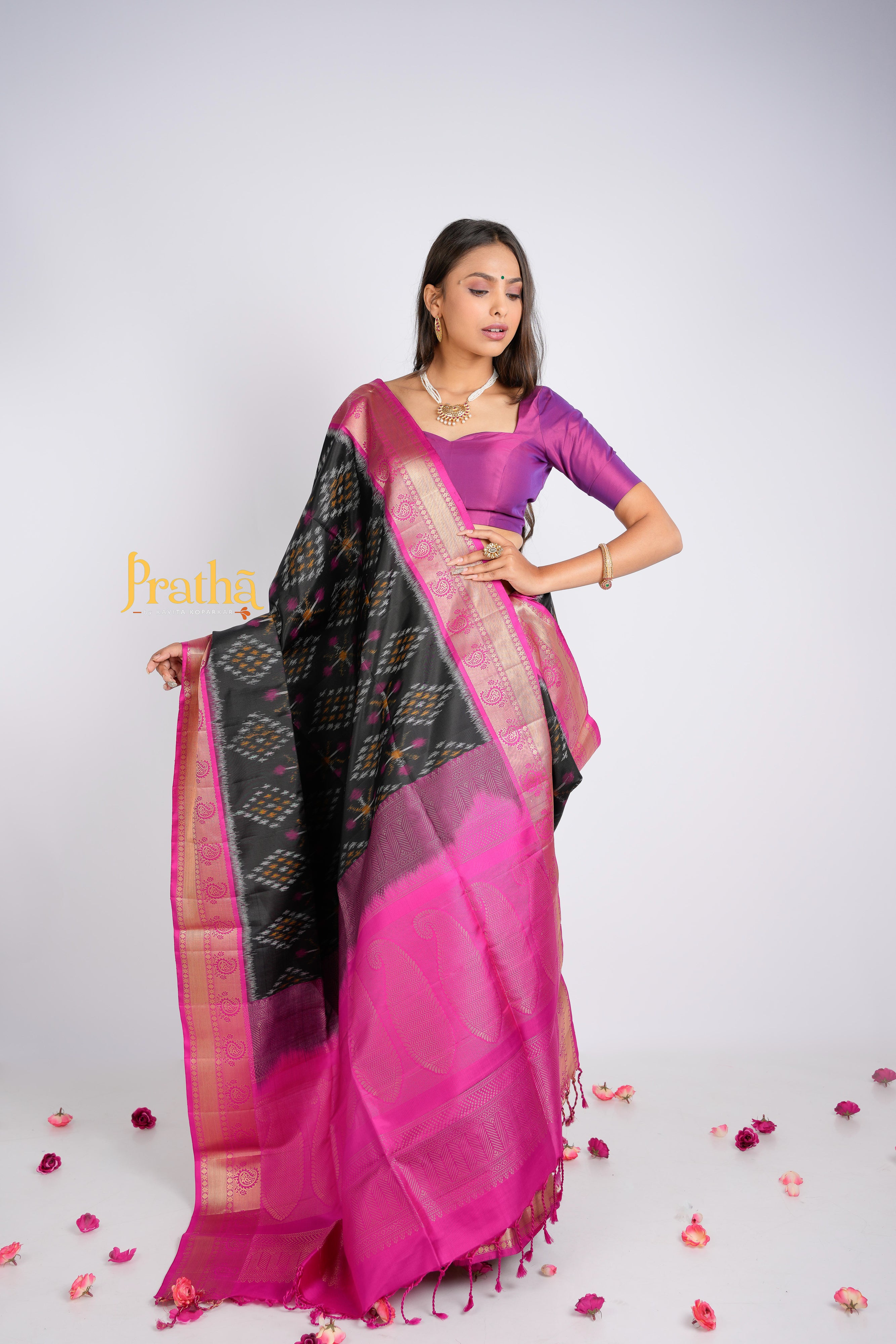 A black saree paired with pink is a perfect mixture, this Soft Silk saree flaunts beautiful ikkat design with contrast intricate design traditional border and pink coloured zari pallu give this weave a classy feel. Comfortable to wear and easy to drape this saree is look special. This black and pink combination makes this saree a prefect casual or party wear weave.