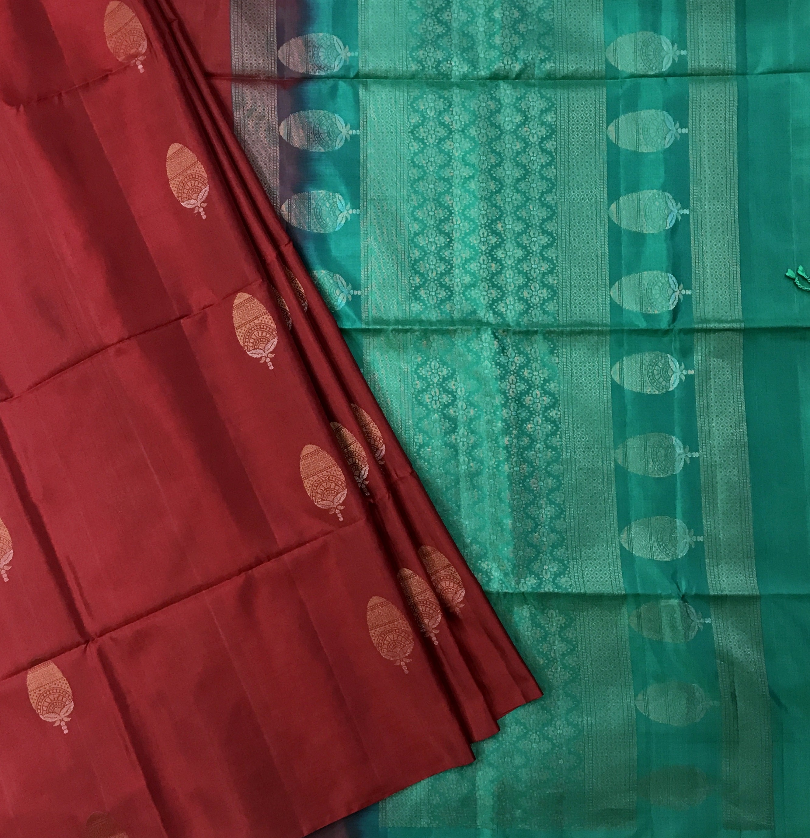 A ravishing shade of maroon, this is a pure silk handwoven Soft Silk saree with big leaf butti design all over its body looks gorgeous . This one is a special weave, as it has big butti with contrast green golden zari pallu add to the festive feel of this weave.