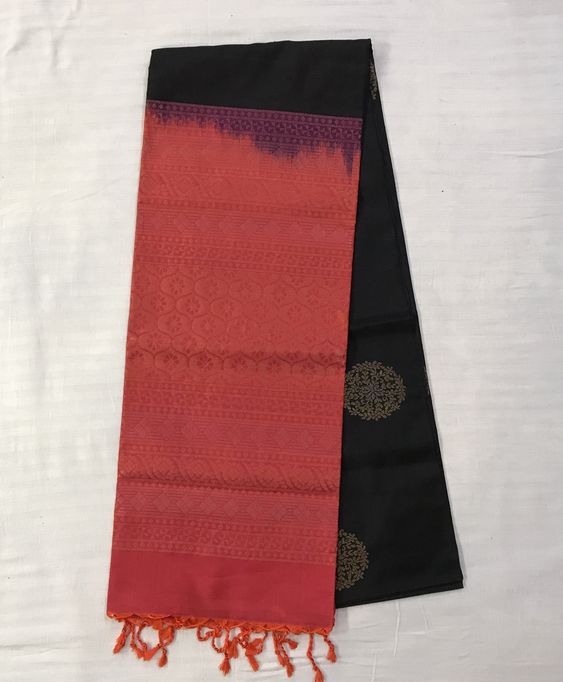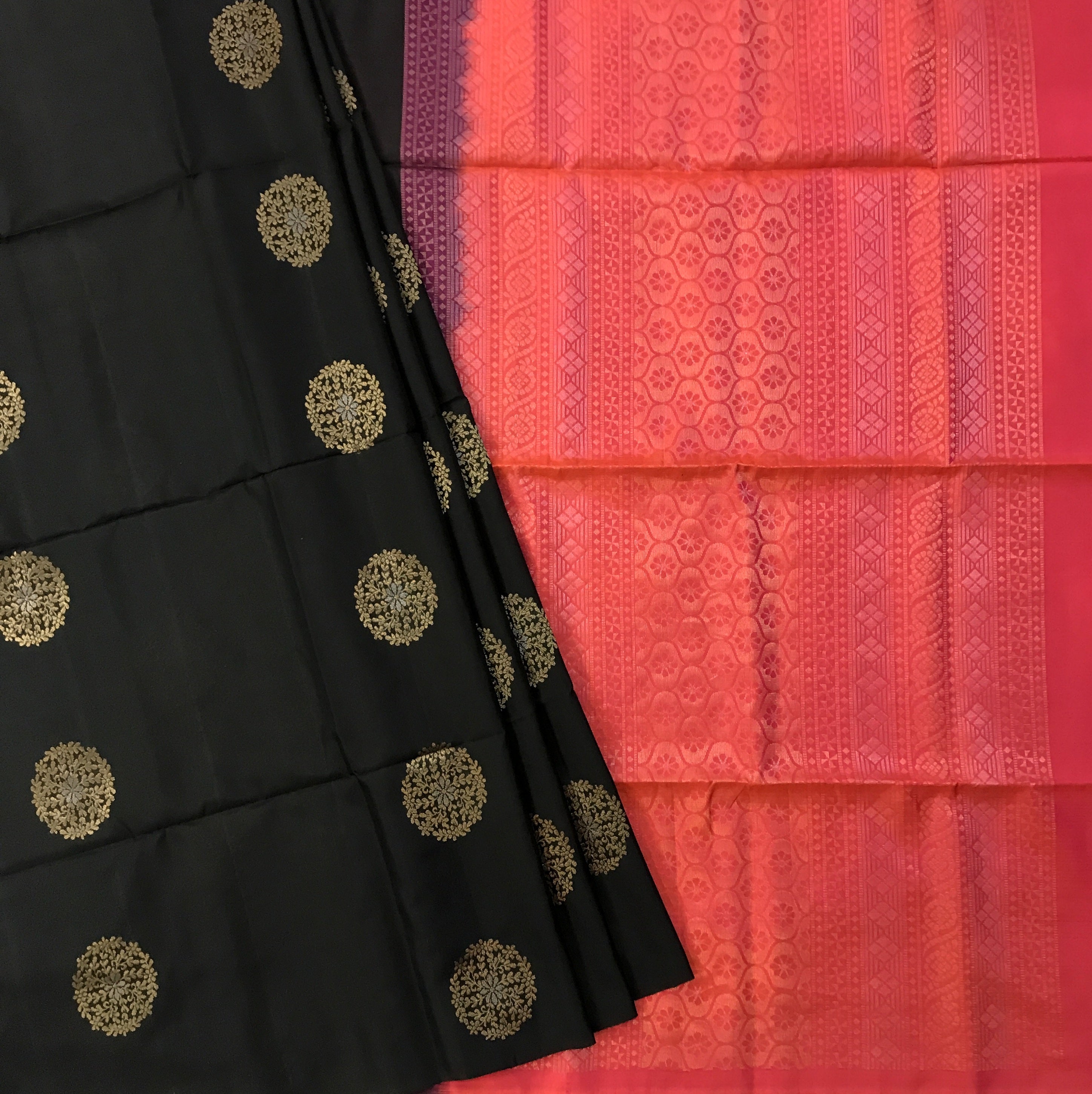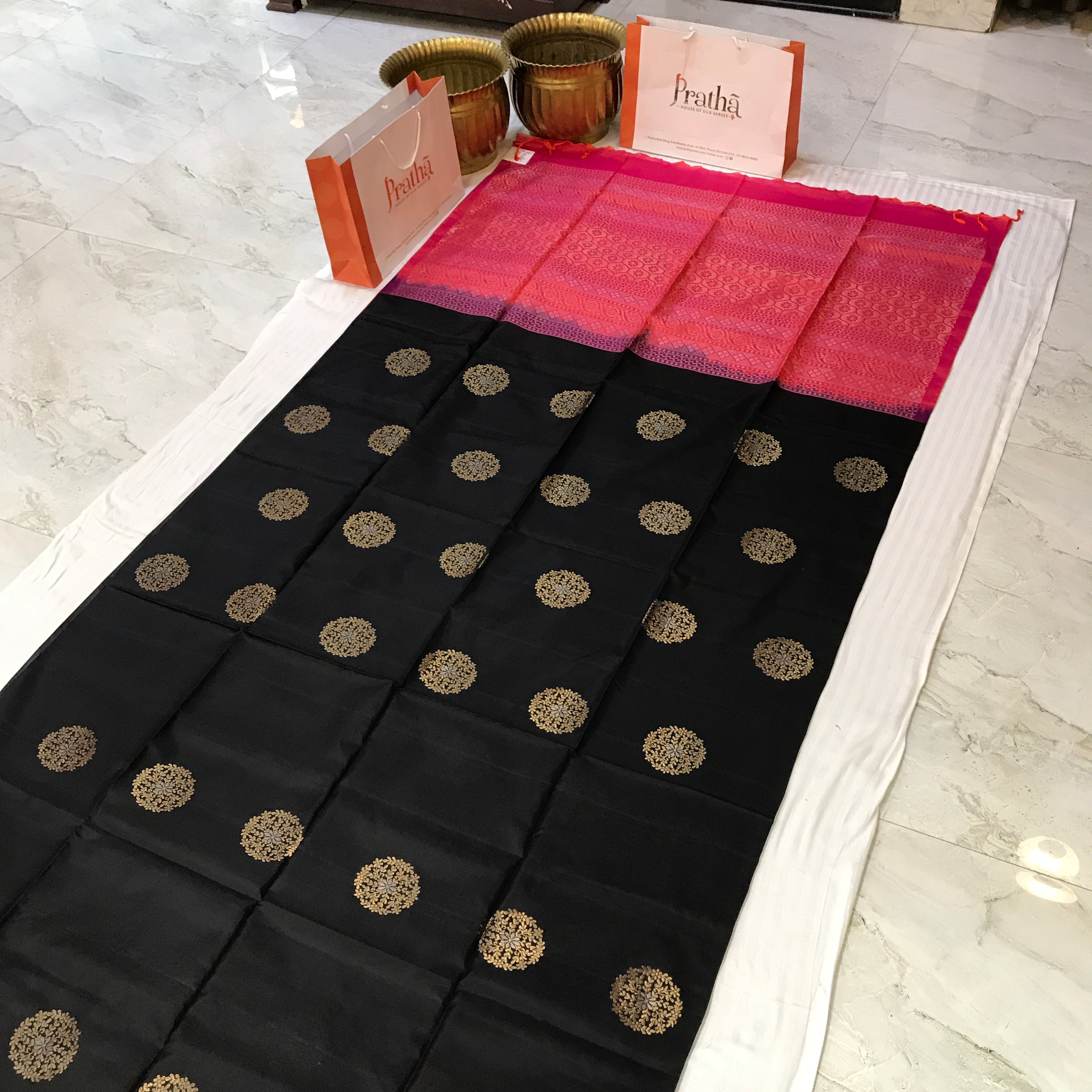 The black coloured Soft Silk makes this a stylish contemporary saree. A very beautiful big circle butta design running through the saree and pink coloured zari pallu makes this weave a favorite of many.