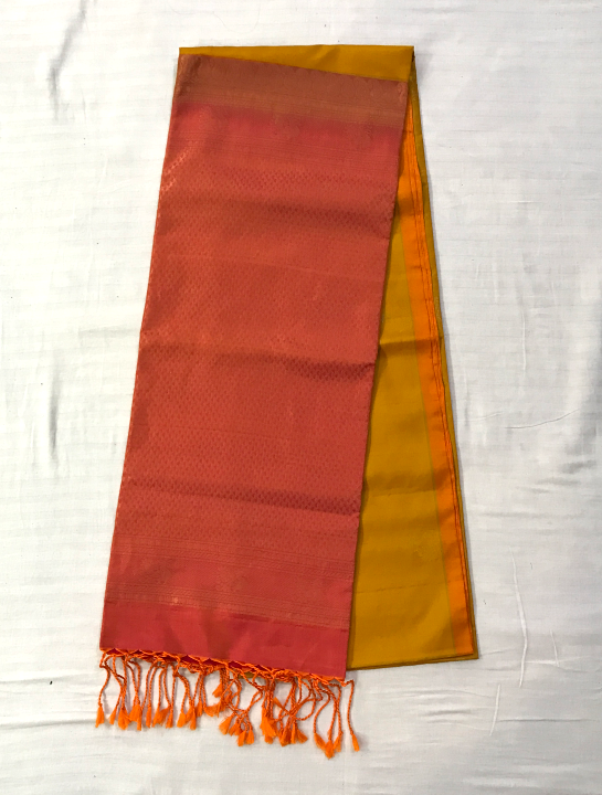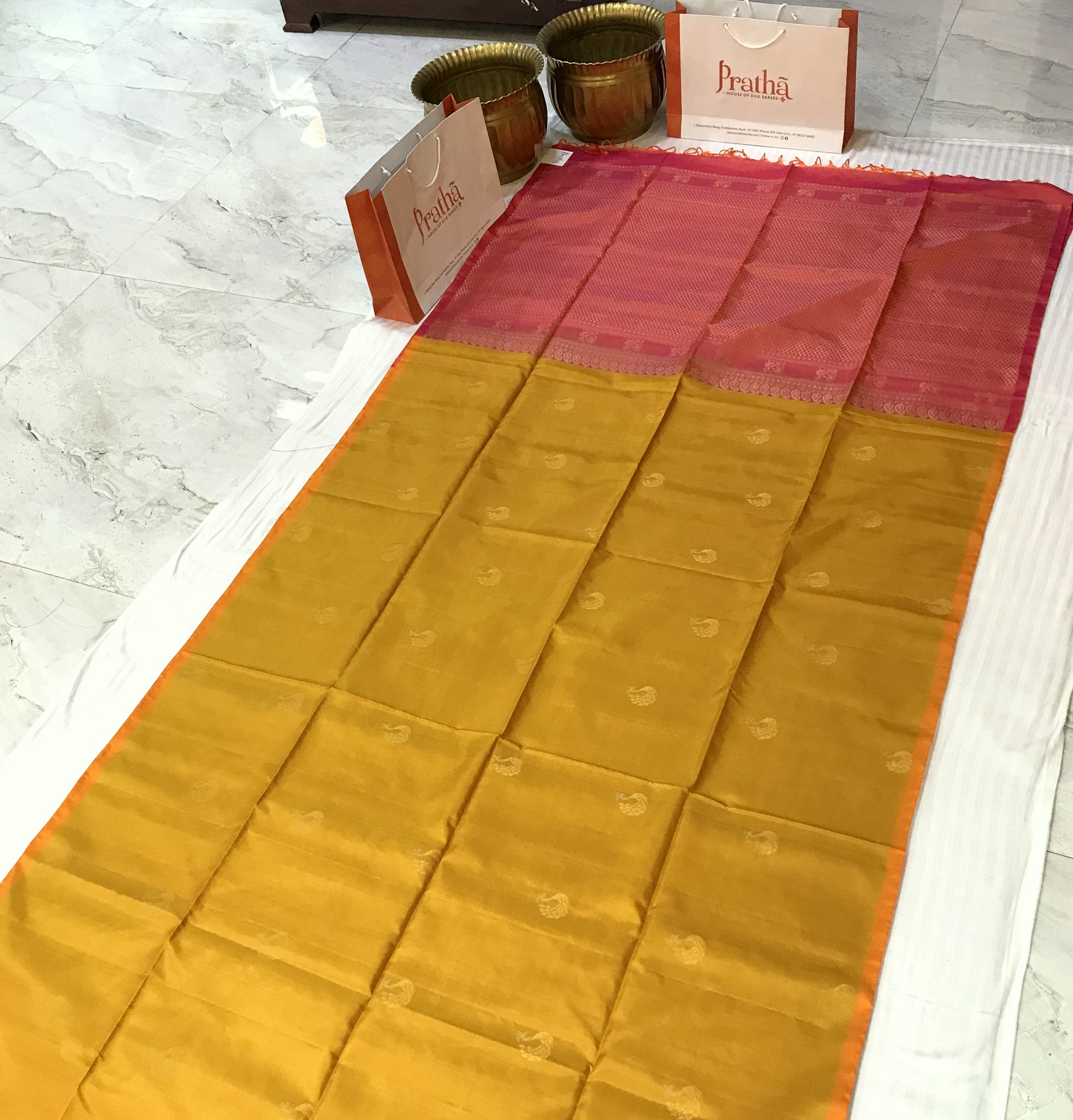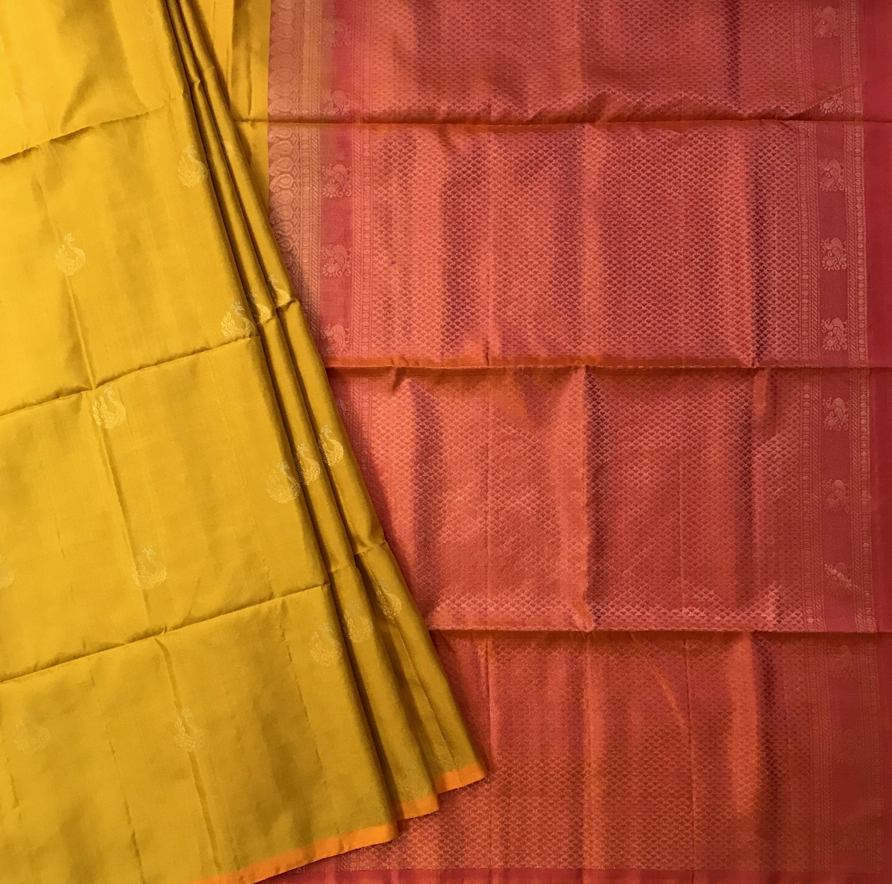 A handpicked mustard yellow Soft Silk saree with a contrast golden-pink pallu! A very beautiful and unusual shaped peacock butti woven in golden and silver zari without border saree. This saree looks magnificent when worn for parties, casual outings as well as corporate events!