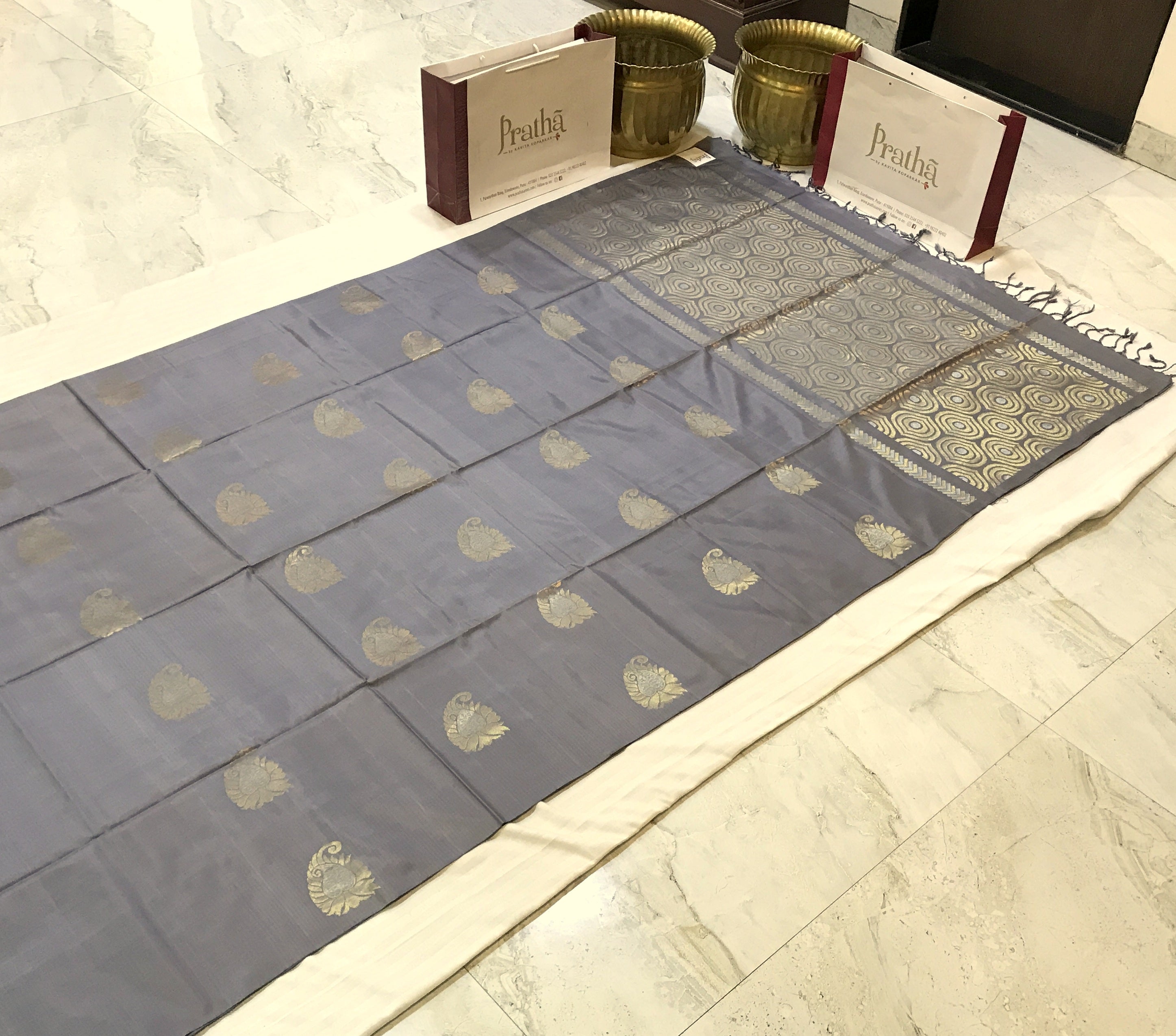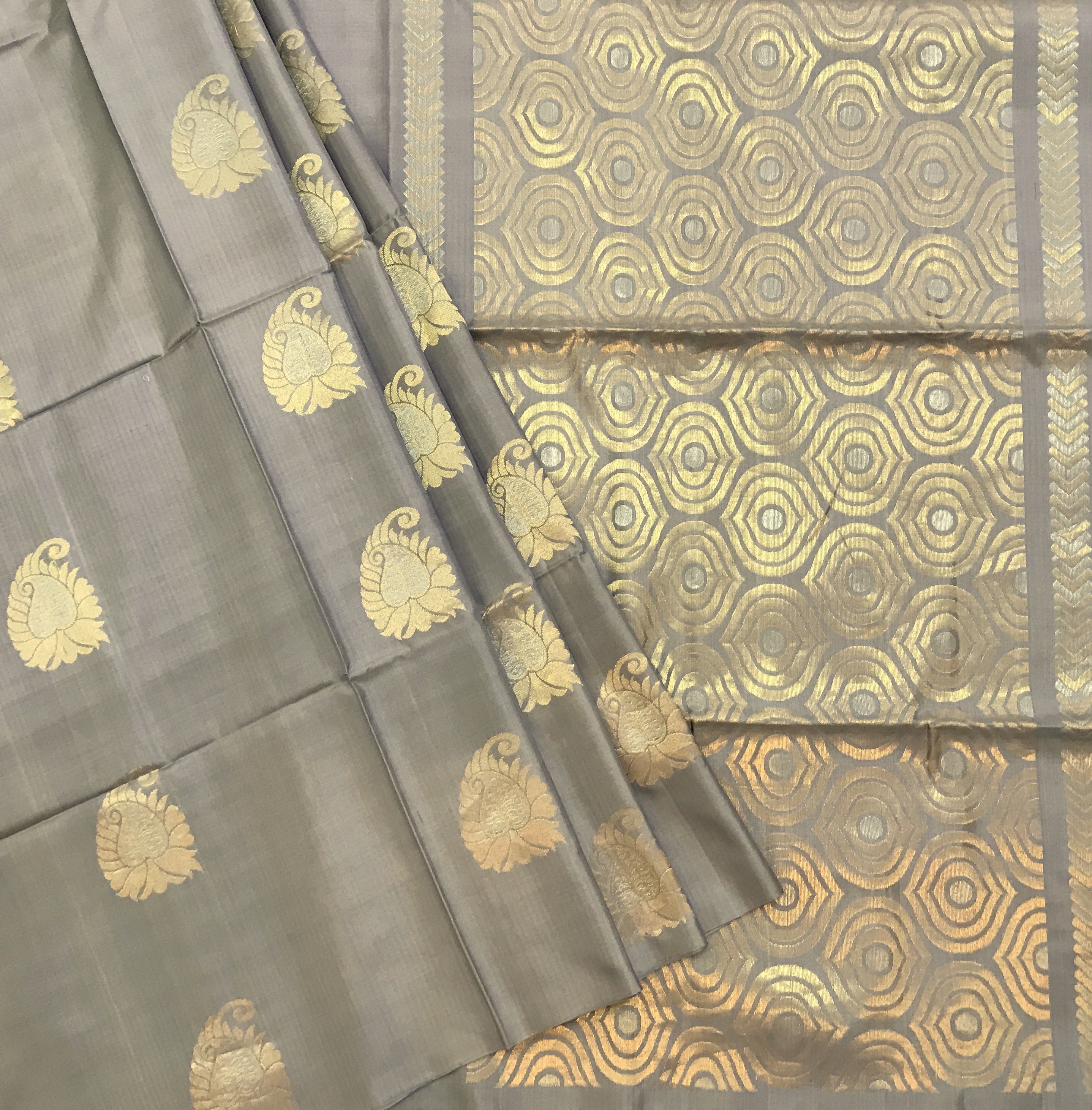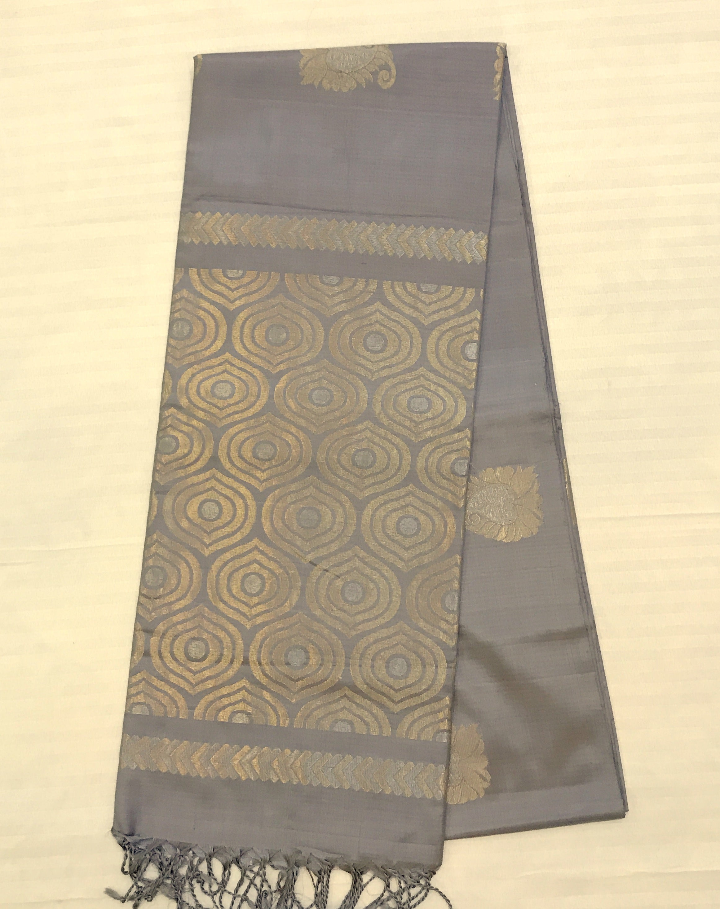 This Light -weight soft silk is an easy to drape saree. Being handwoven, it gives a very comfortable feel, when worn. The grey colour spread throughout the saree, with the big different shaped butti complement each other perfectly. This unique butti and pallu created fully in mixed golden and silver zari thread, looks great!