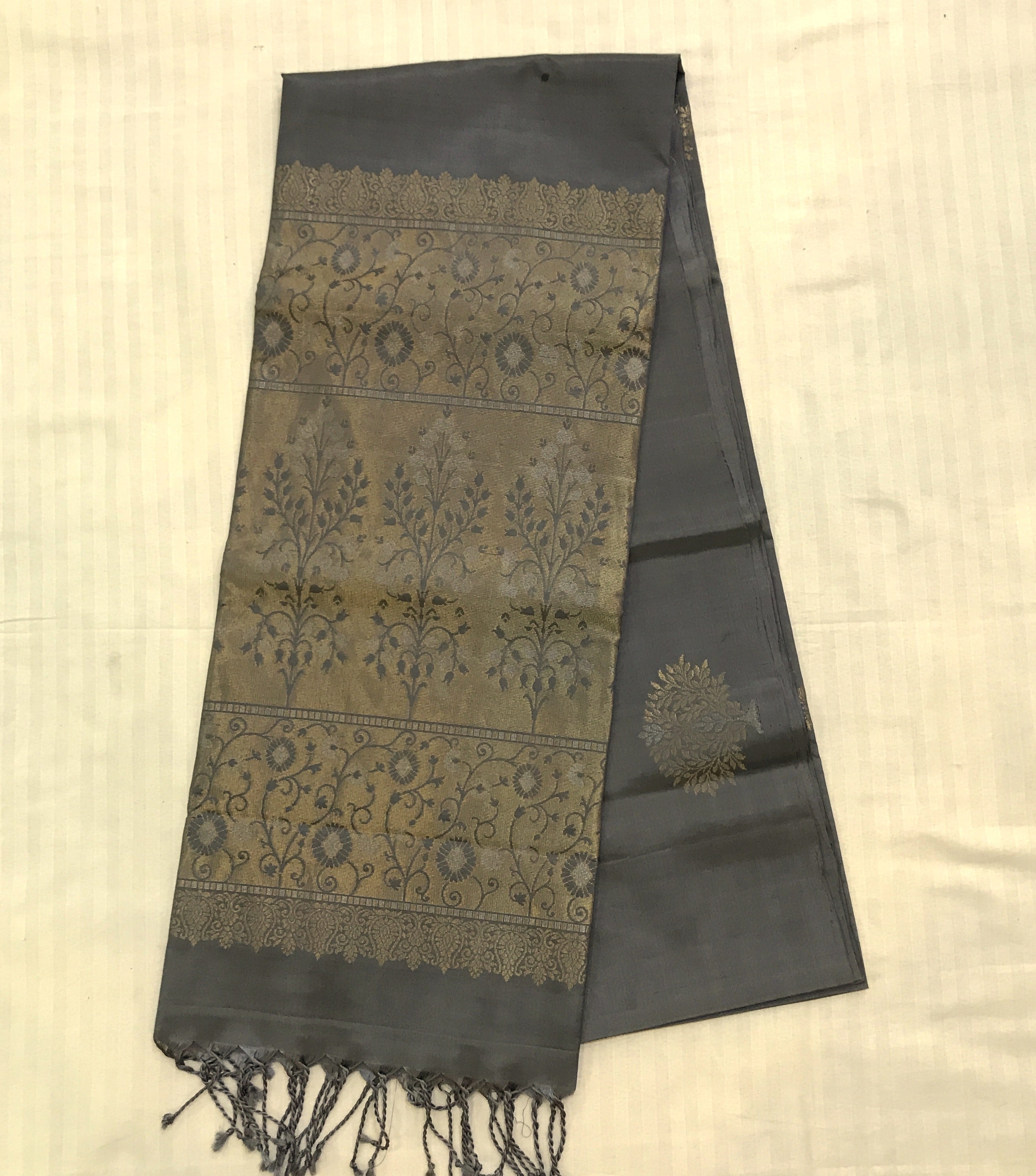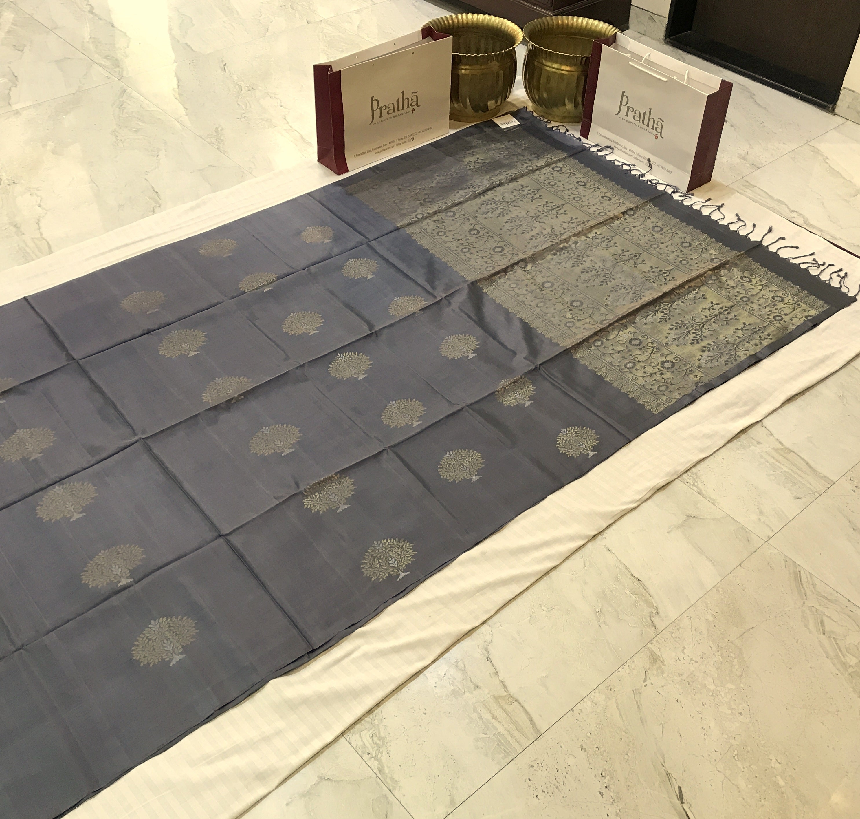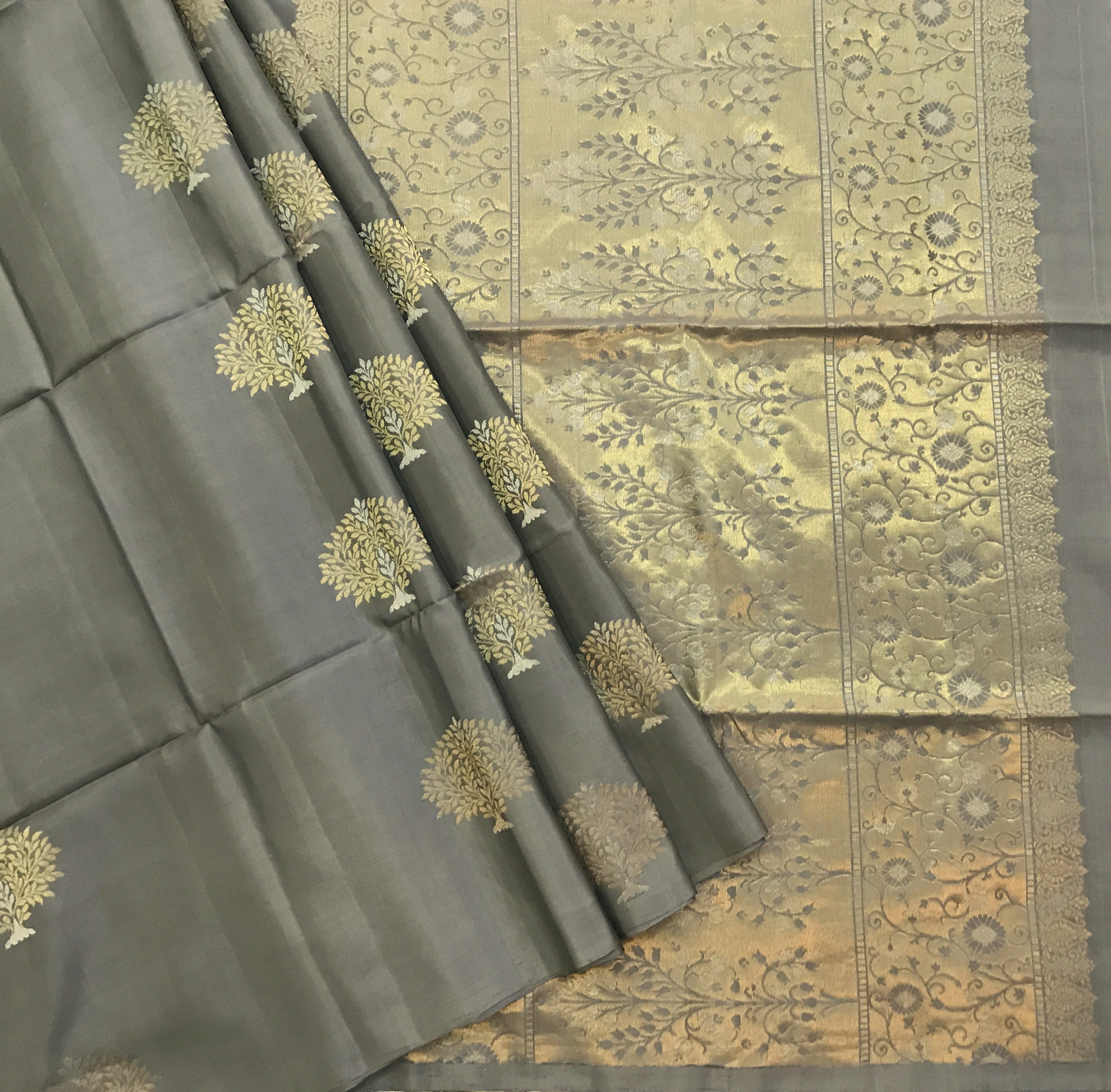 A very pretty dark grey colour spread throughout the saree, with the intricate and big tree shaped ( motifs ) butti woven in golden and silver zari complement each other perfectly. This butti and pallu created fully in golden-silver zari thread, looks great!