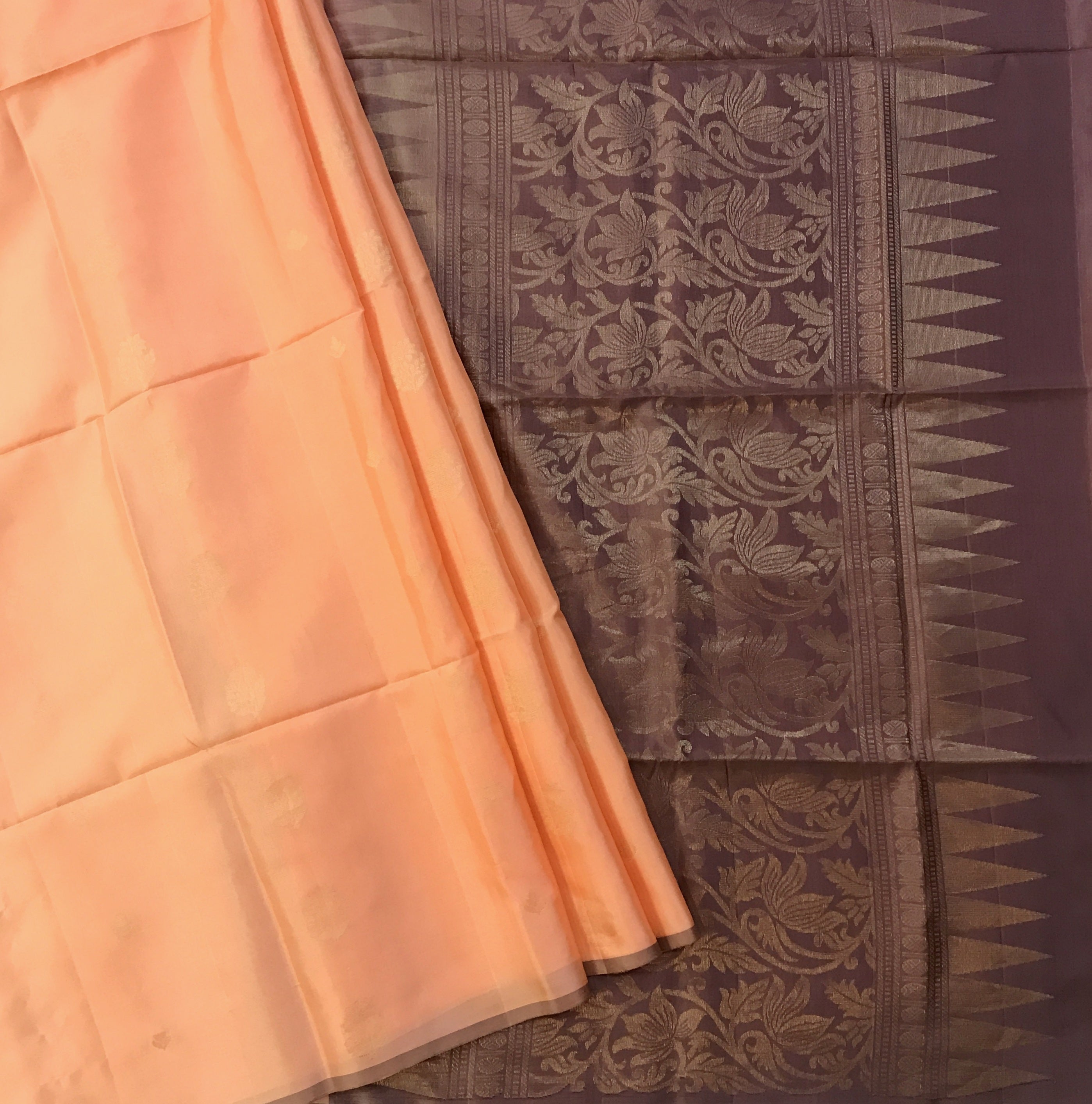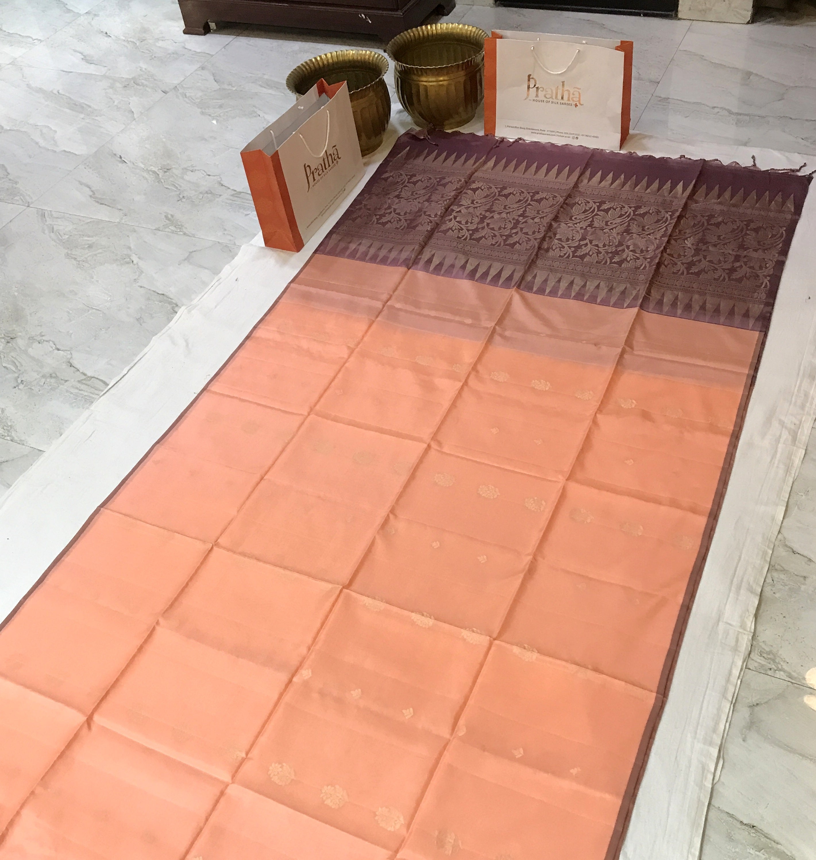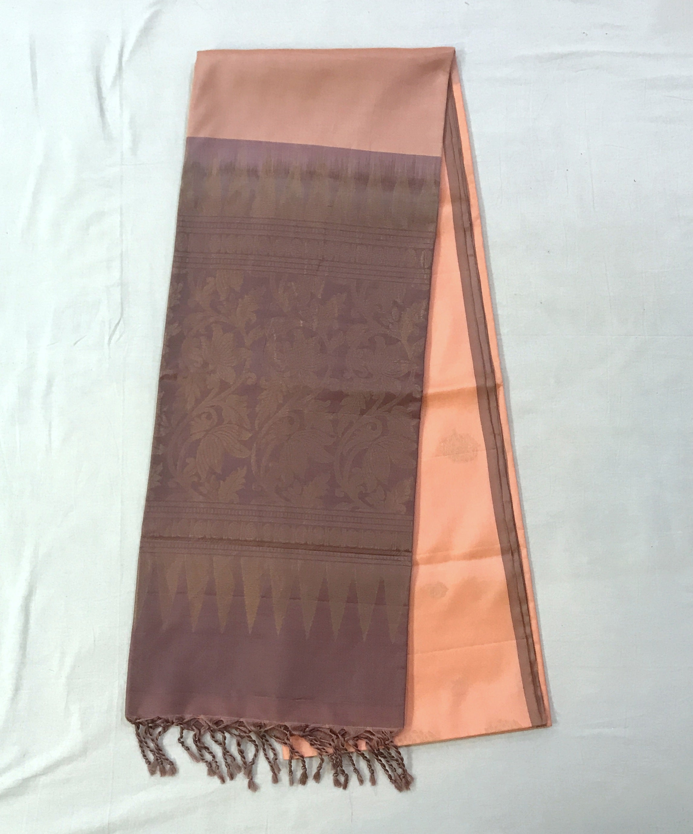 A very attractive and unique peach coloured Soft Silk saree with combination of onion pink this one is stunner! The highlight of this weave is the intricate design zari contrast pallu looks beautiful ].