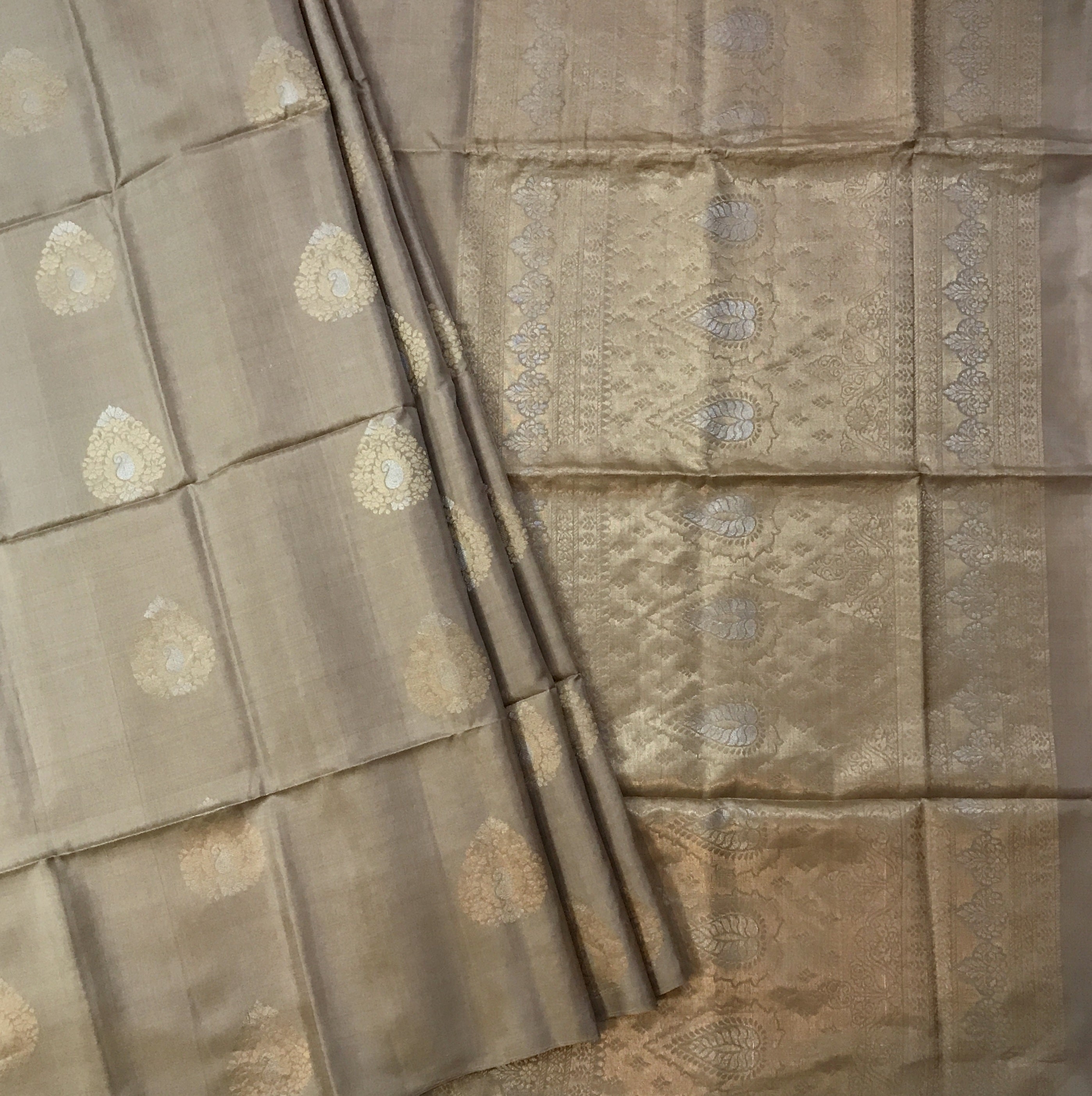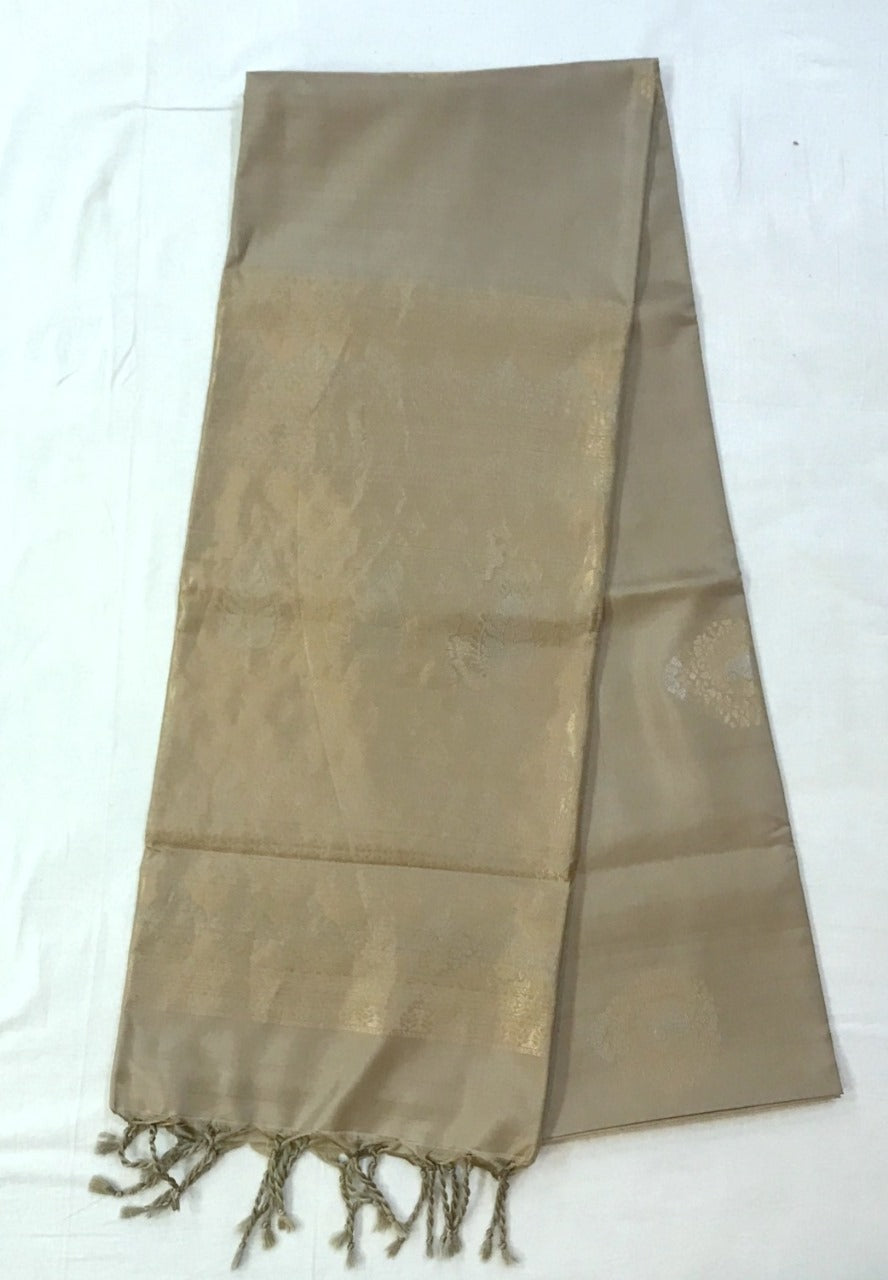 A oyster coloured saree without any border, this Soft Silk saree flaunts beautiful leaf shaped motifs with koyris, intricately woven in golden-silver zari threads and zari pallu give this weave a classy feel. Comfortable to wear and easy to drape this saree is look special. This Beige combination makes this saree a prefect casual or party wear weave.
