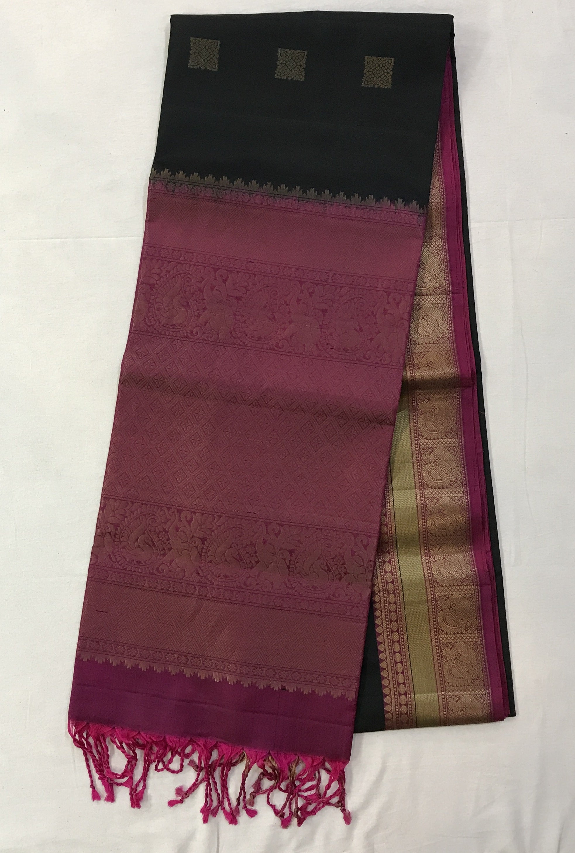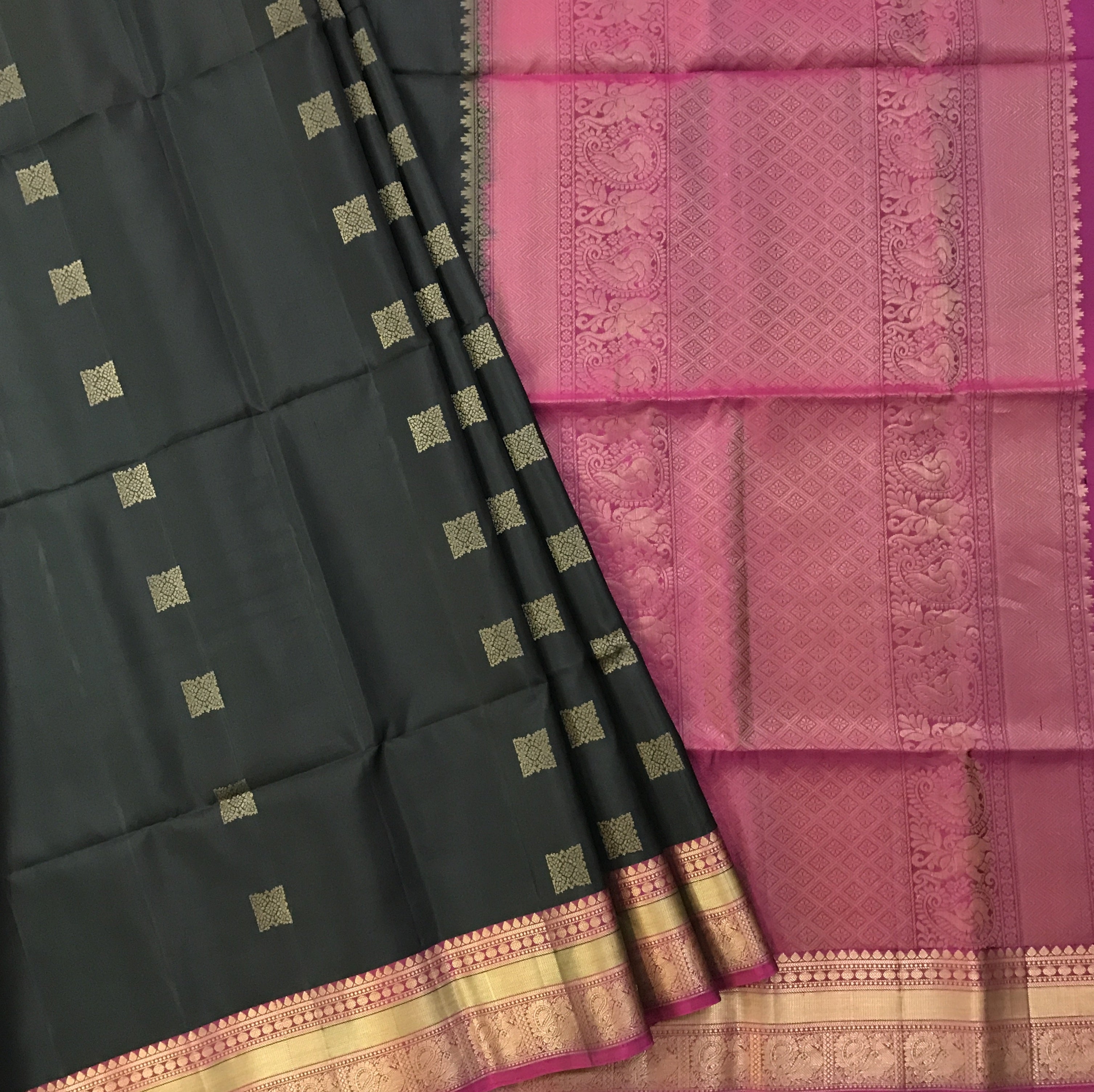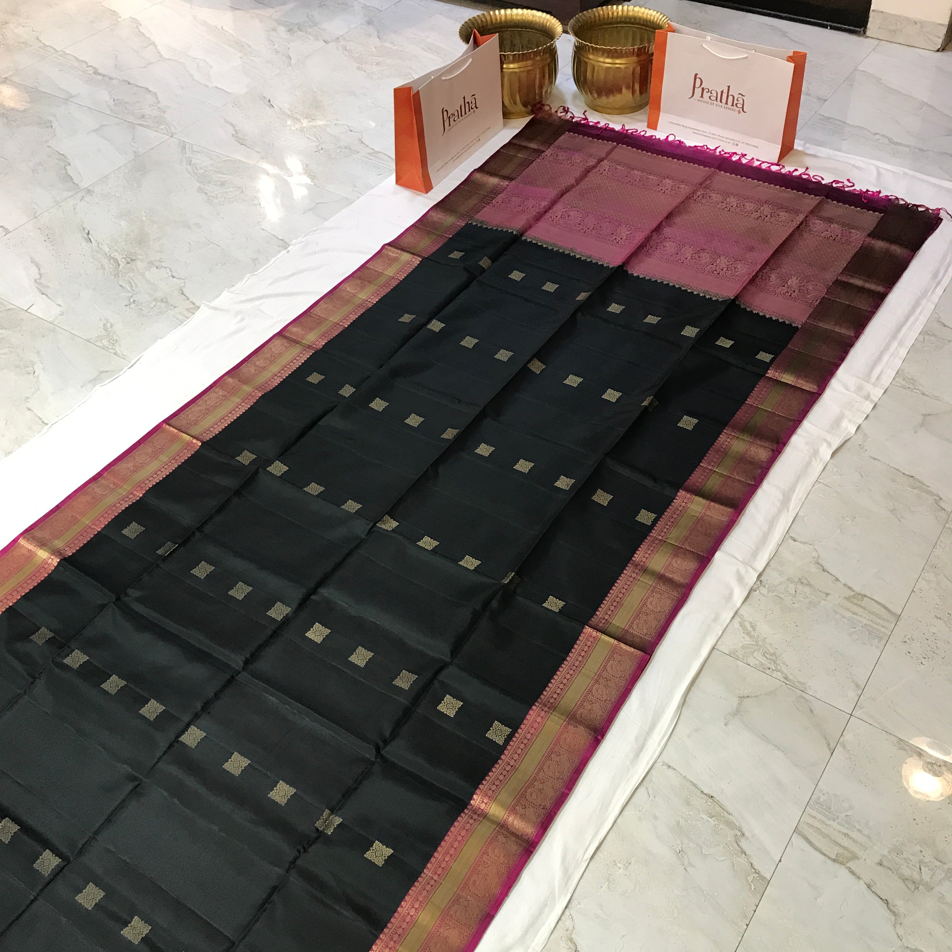 This Light -weight soft silk is an easy to drape saree. Being handwoven, it gives a very comfortable feel, when worn. The fantastic shade of black spread throughout the saree with small golden zari border in pink color, with the exquisite and different design square shaped butta- chakra ( motifs) woven in golden zari thread with design pallu looks beautiful.