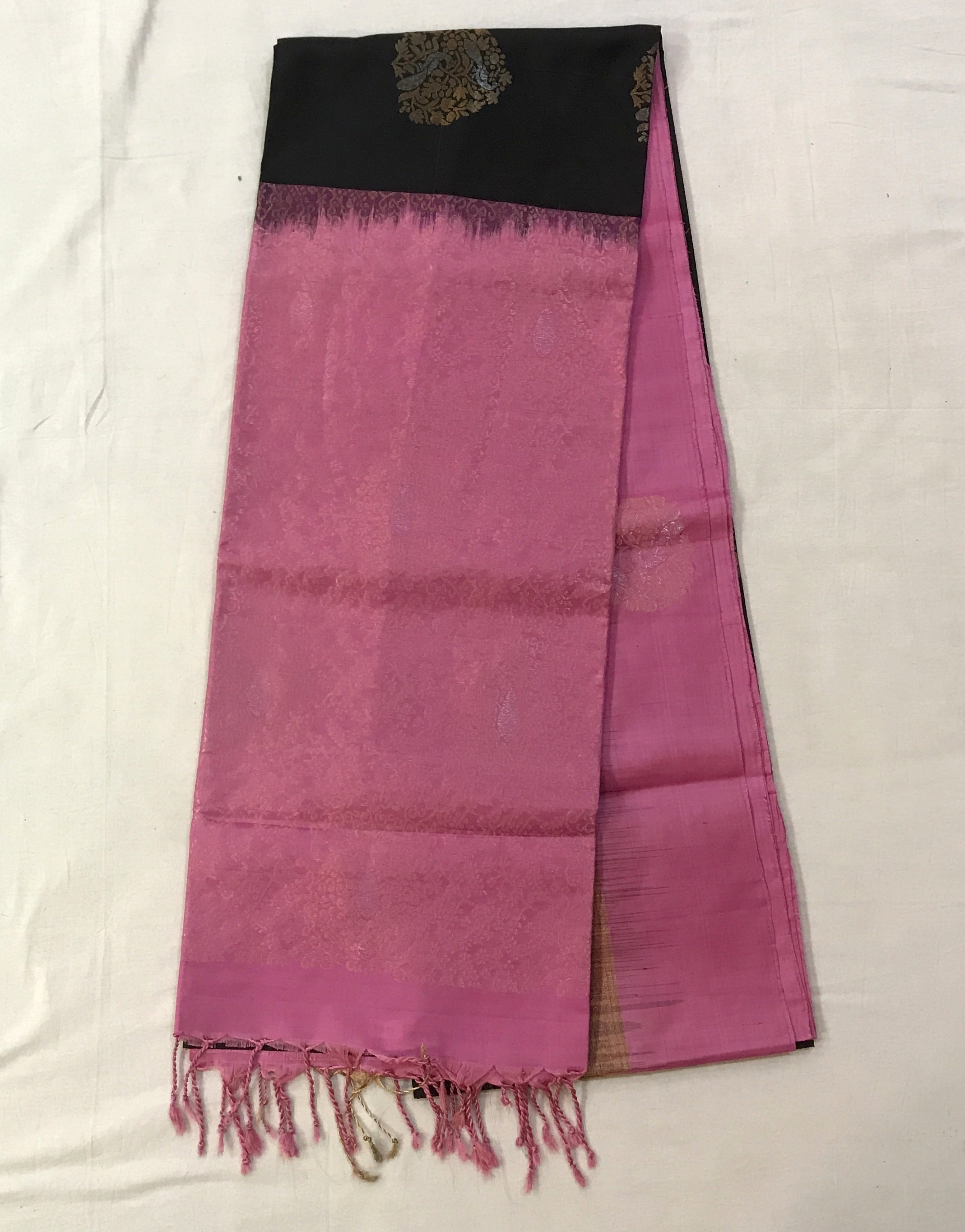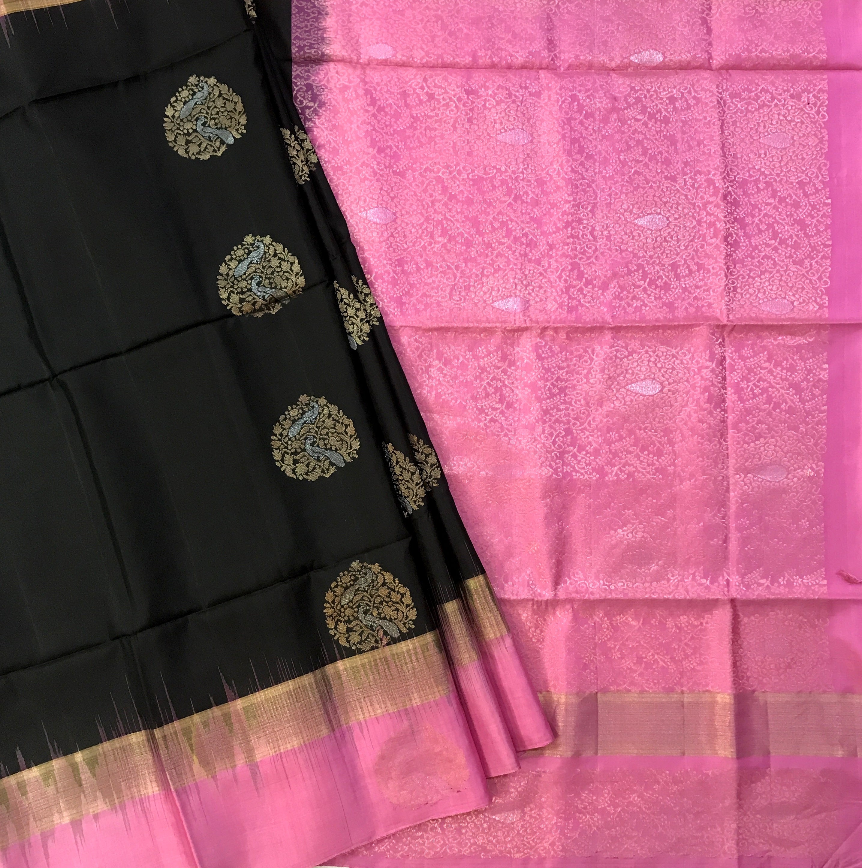 This black pure Soft Silk handwoven saree flaunts beautiful unique ( peacock ) motifs intricately woven in golden-silver zari threads. The fresh black colour against the pink designer ( peacock motifs ) border and pallu, makes this a fantastic combination. Light in weight and easy to drape this is a perfect casual / party / corporate wear saree.