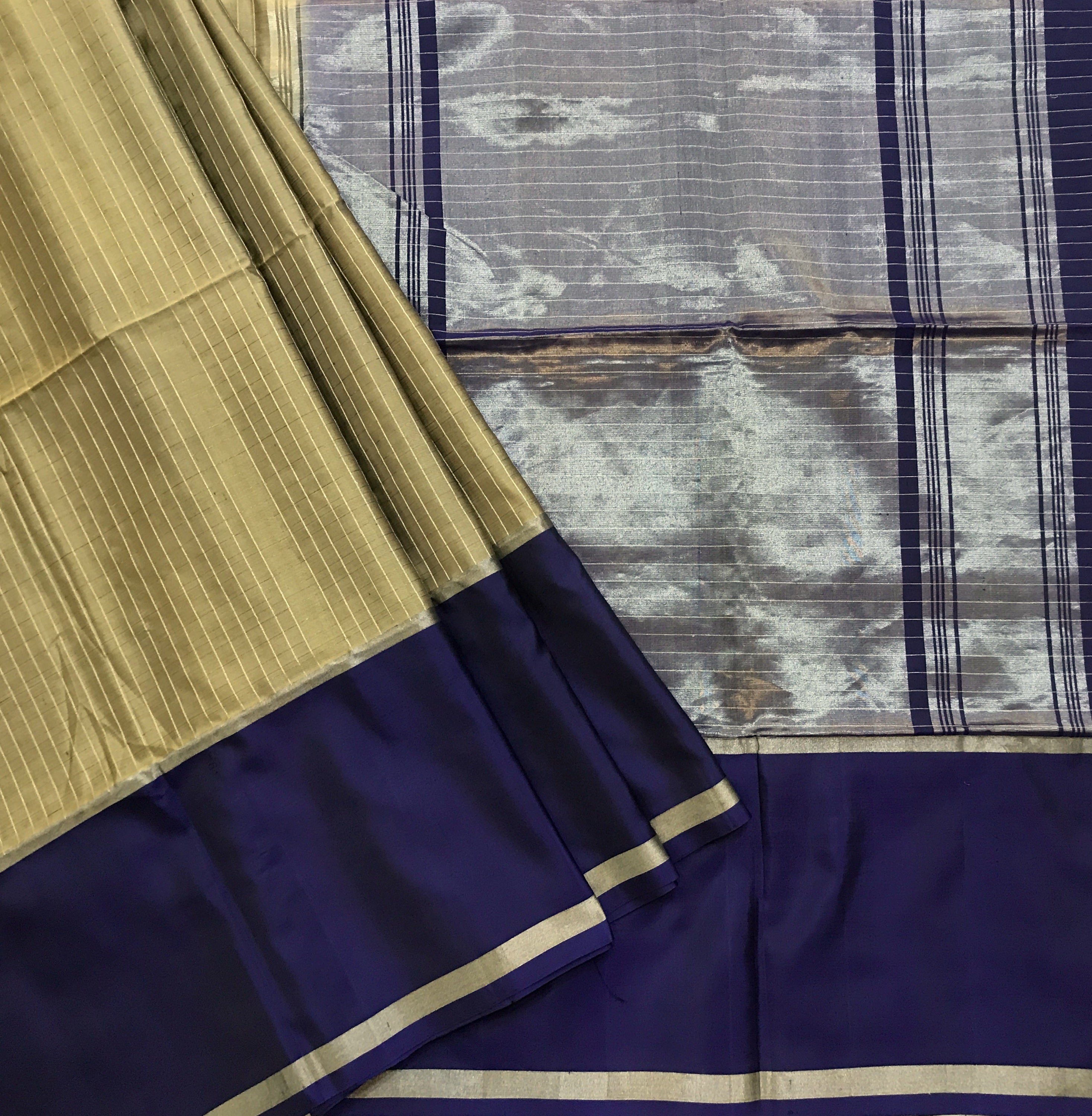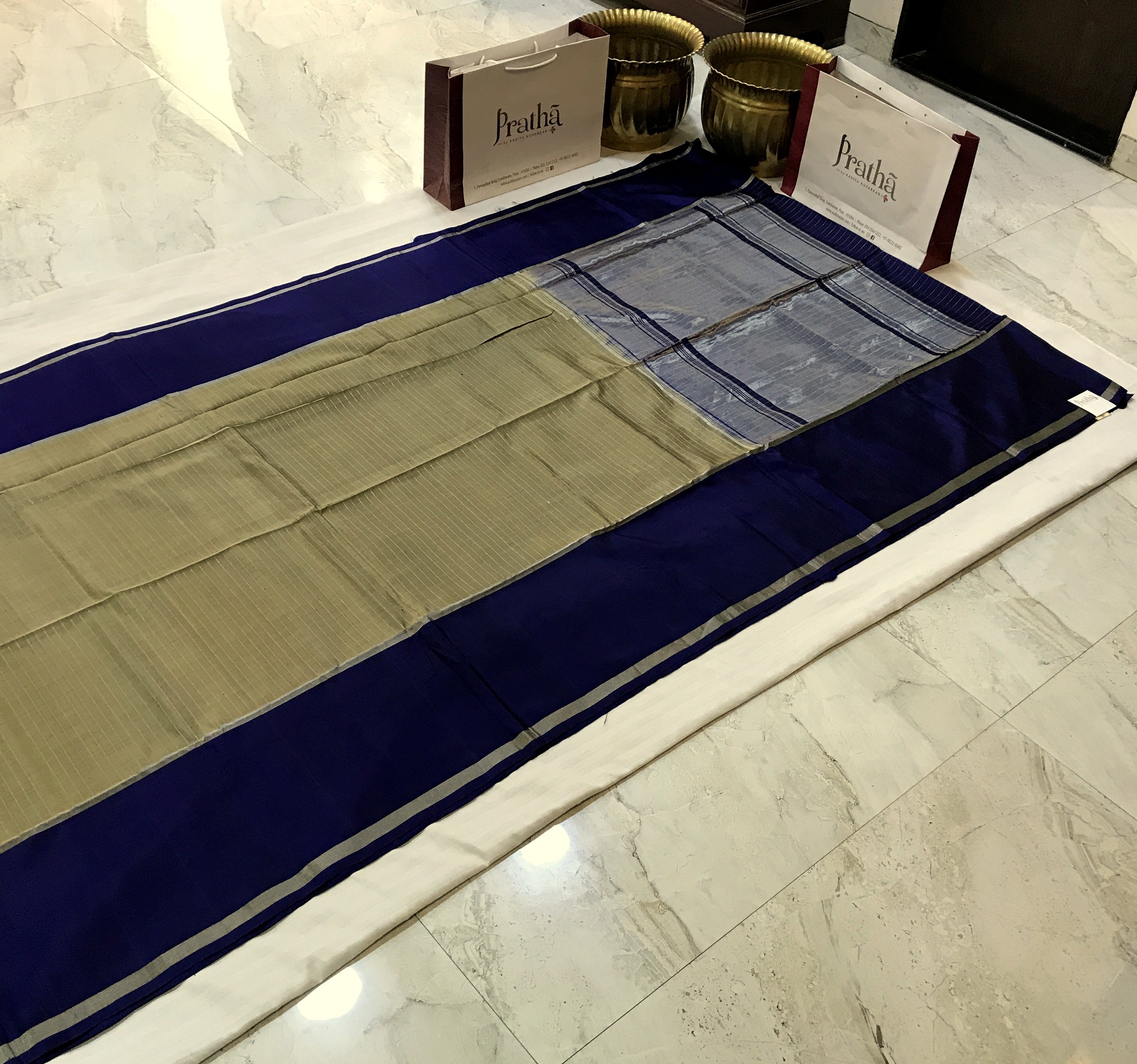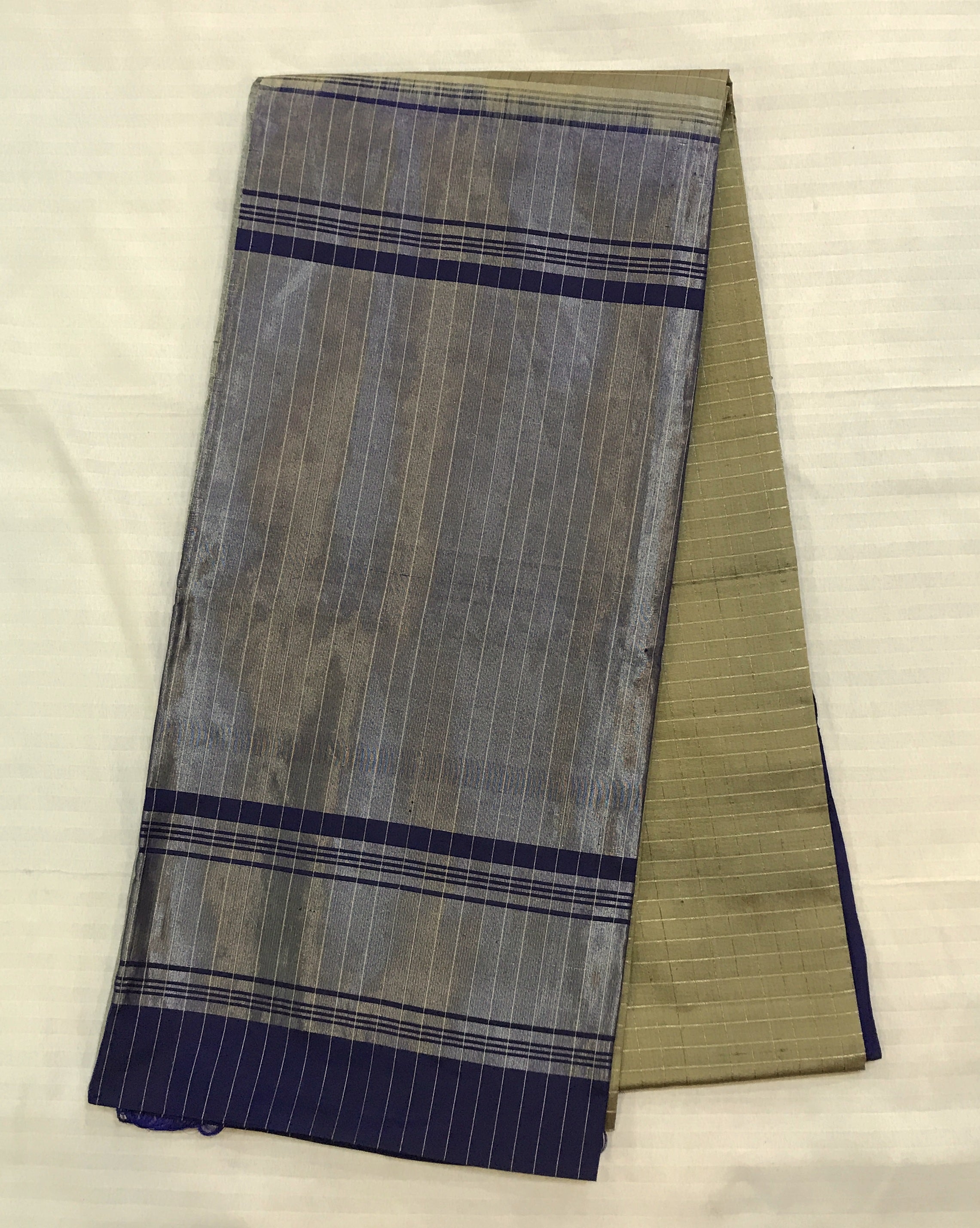 A very beautiful and uncommon olive green coloured Soft Silk with delicate checks design delicate woven in golden-silver zari makes this a stylish contemporary saree. The checks design running through the saree with plain blue silver zari border and blue coloured design silver zari pallu makes this weave a favorite of many.