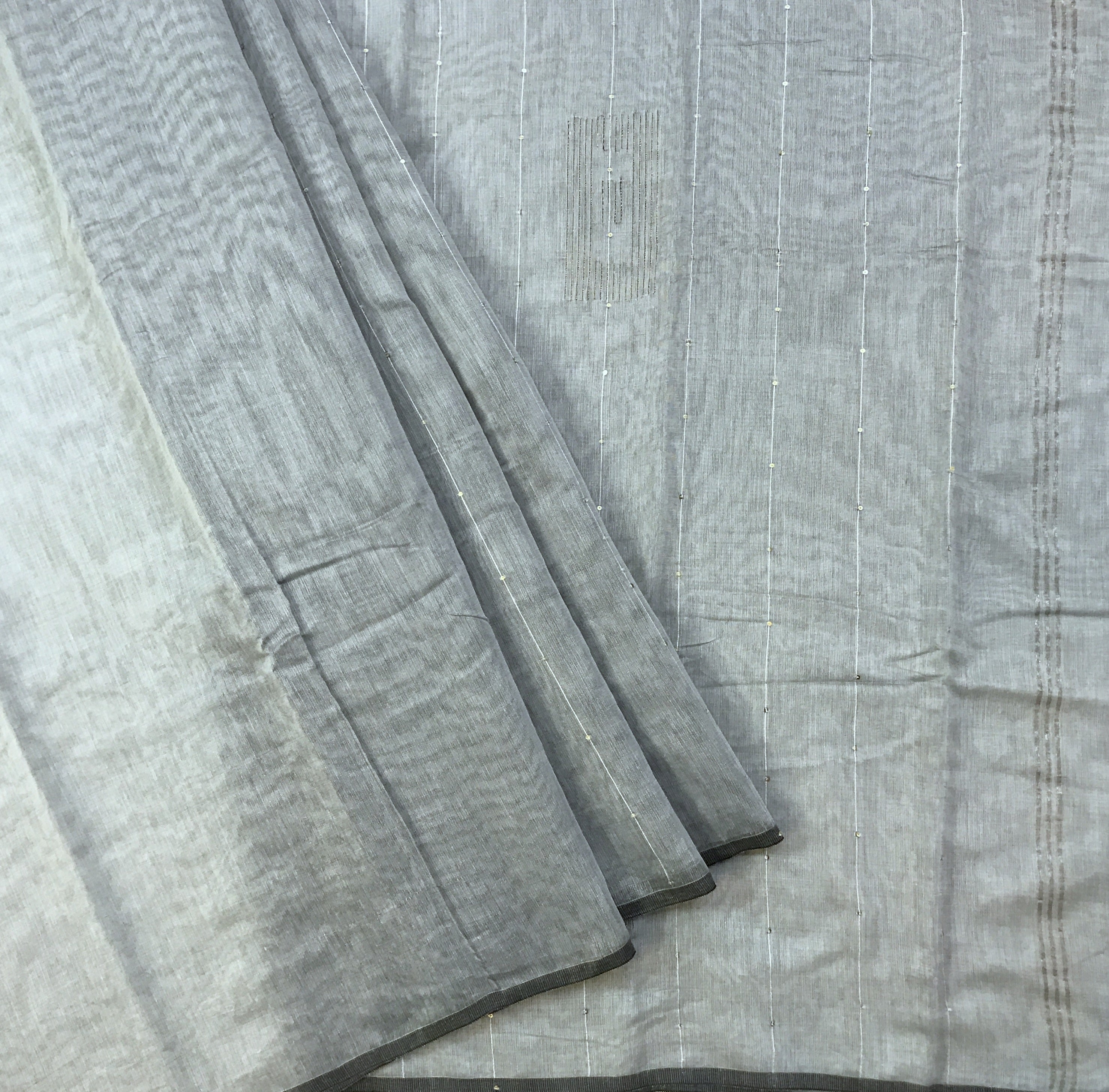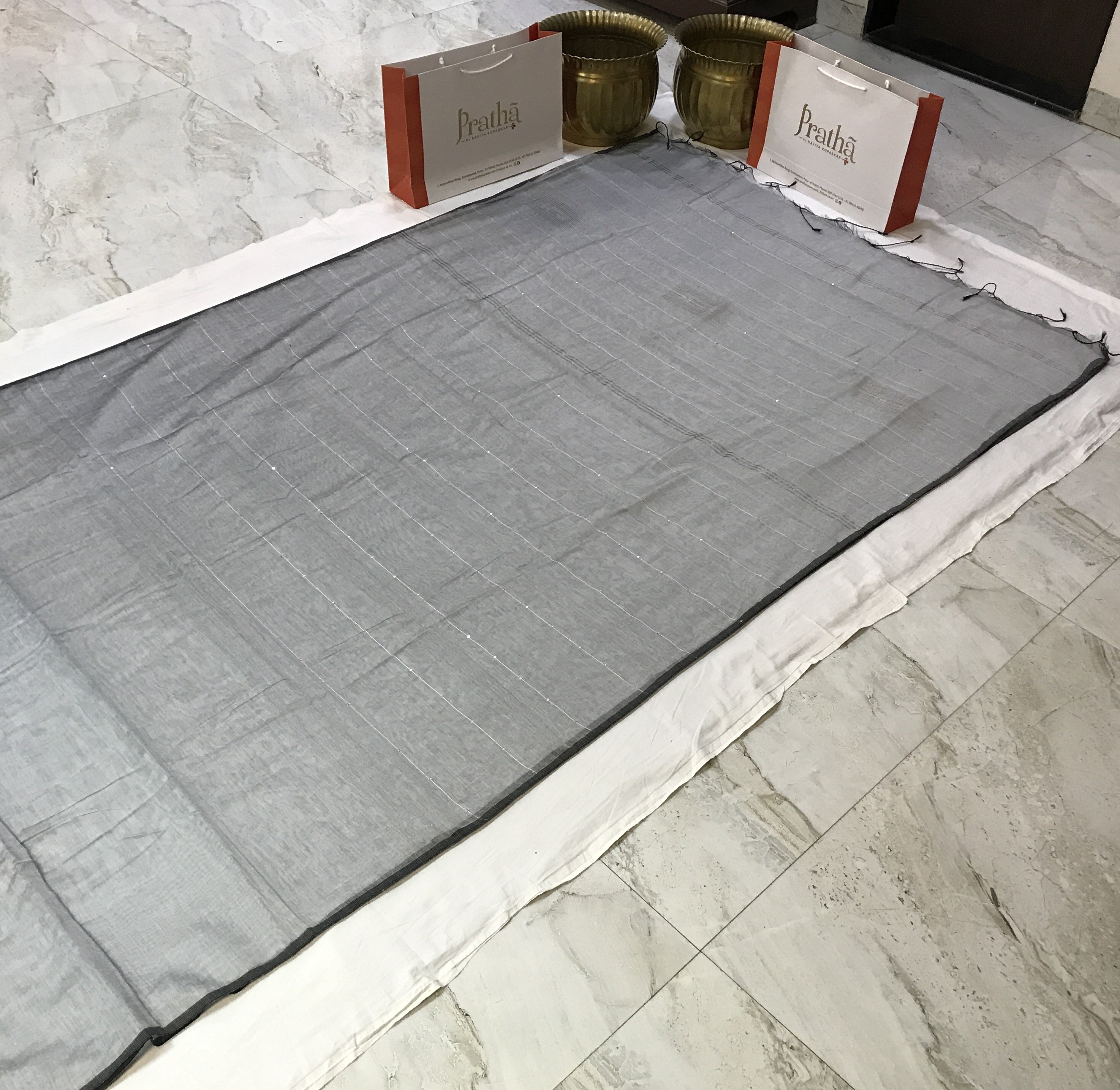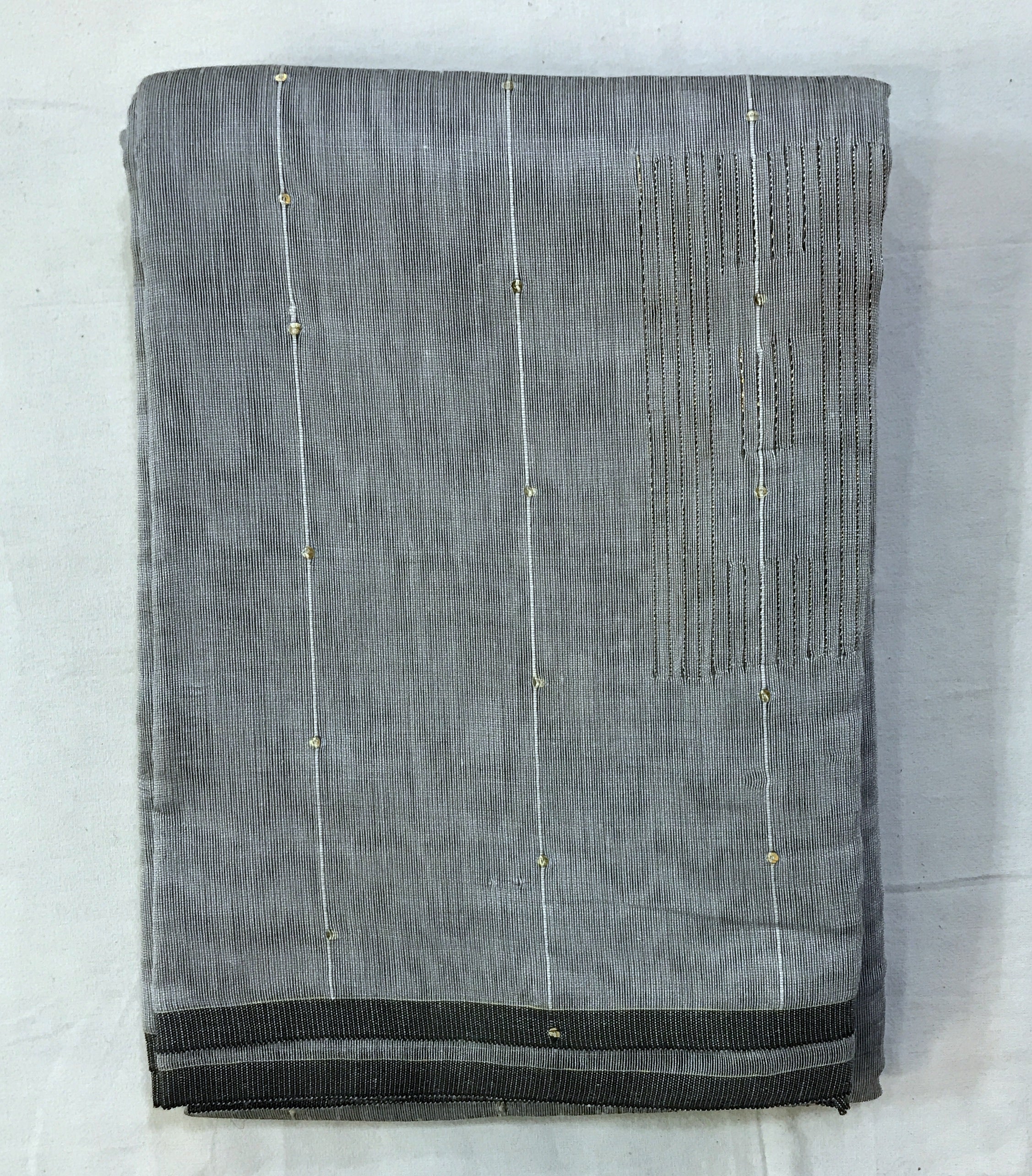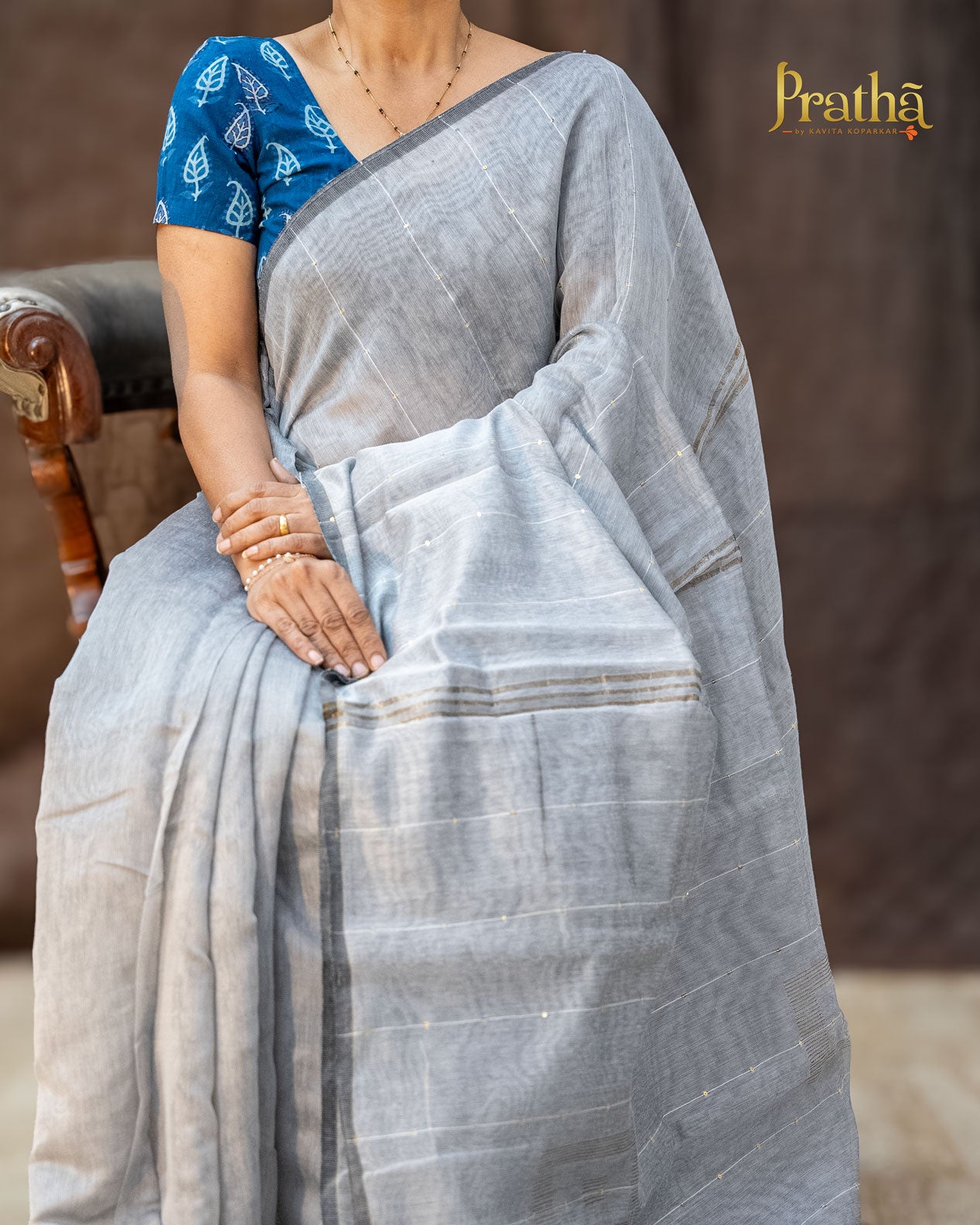 This is a new genre of sarees launched by Pratha. A very pretty plain silver-grey Baha silk sarees , delicately accentuated with dainty sequins all over the saree. The subtle design in zari thread on the pallu adds grace to this party wear saree by Pratha.