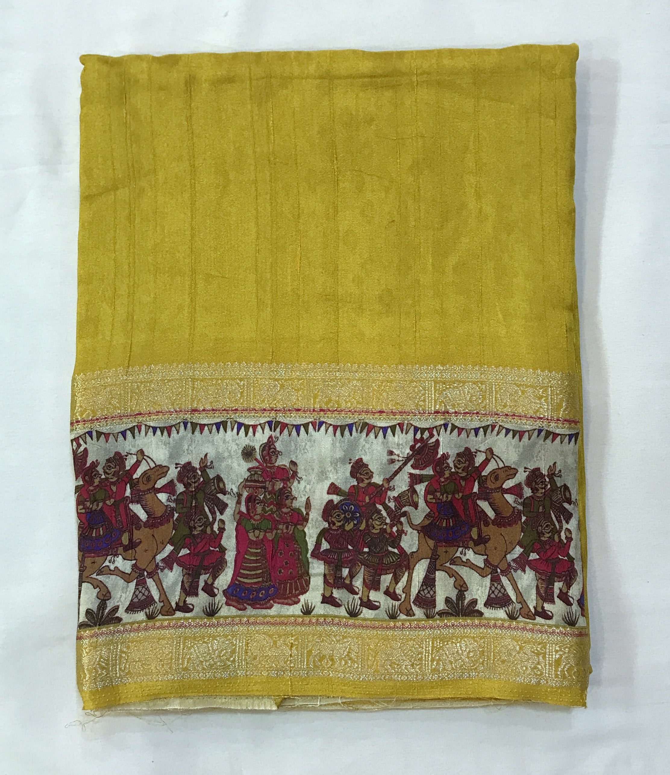 This exquisite yellow saree is crafted in rich silk, with beautiful printed design border. The highlight of the saree is its beautifully printed design border with self coloured pallu adding a touch of sophistication. A perfect blend of elegance and heritage, this saree is ideal for festive occasions, weddings, and special gatherings.