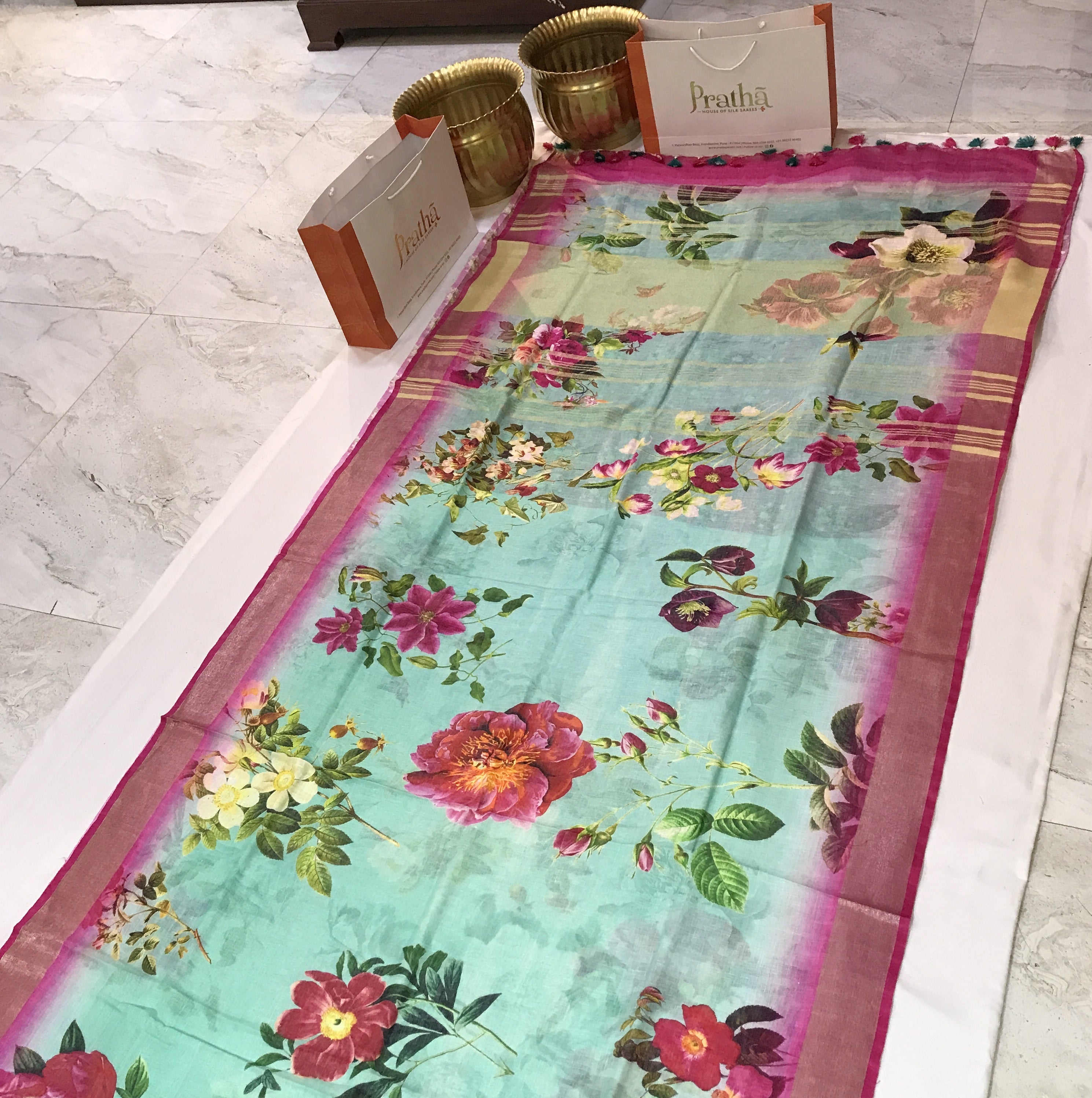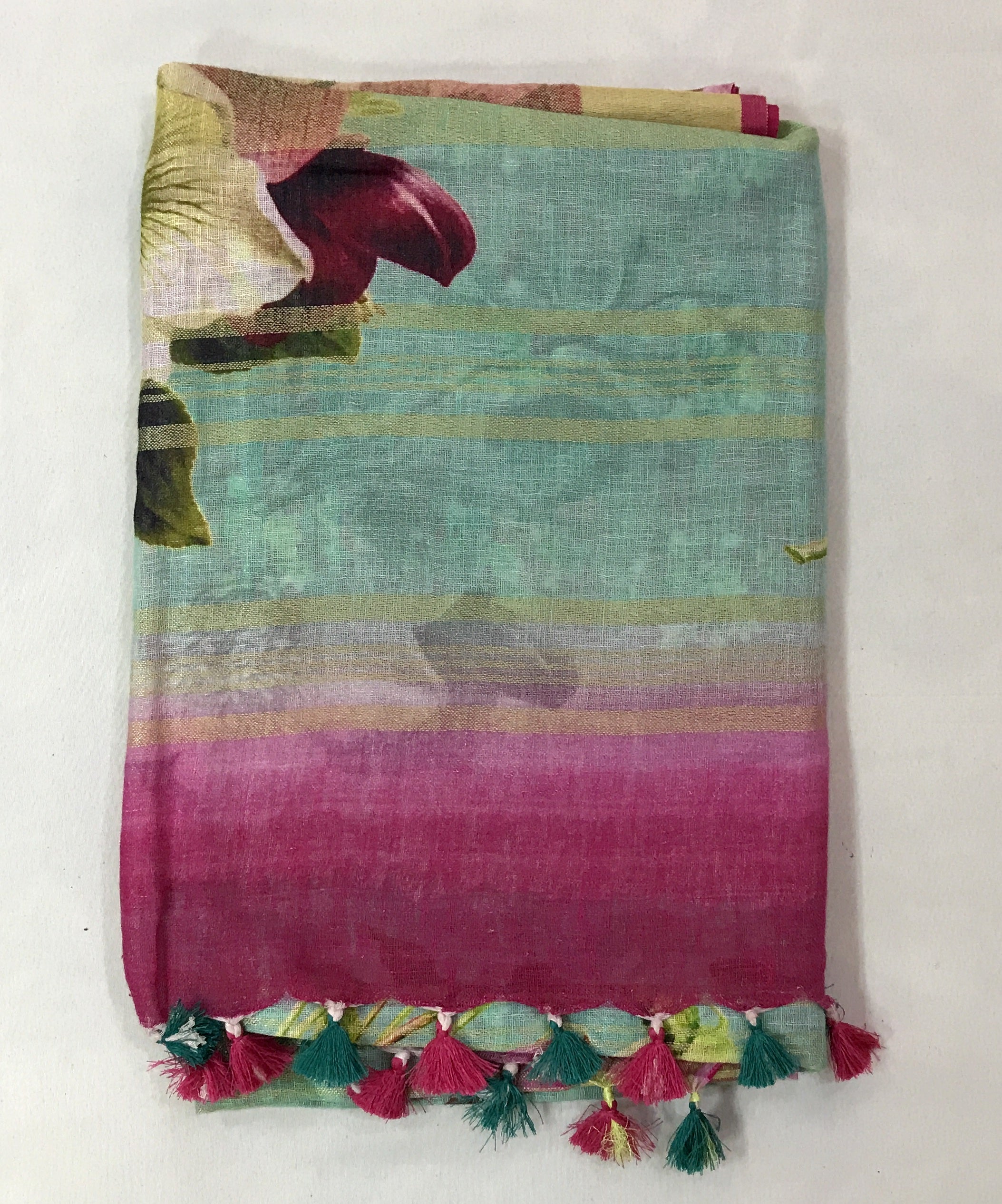 Blouse Colour: Contrast( Pink with big floral design print and saree comes along with tassels)