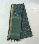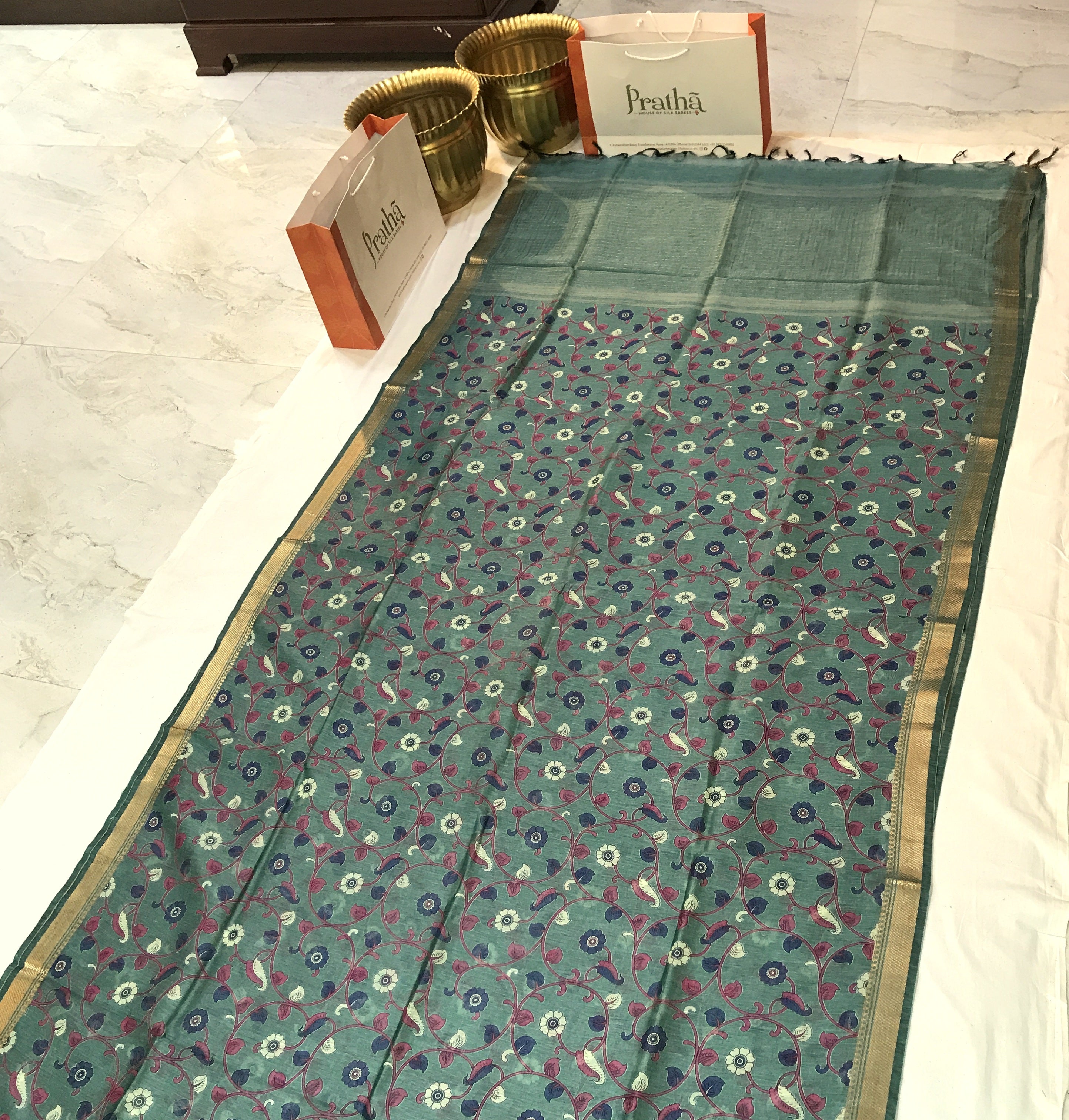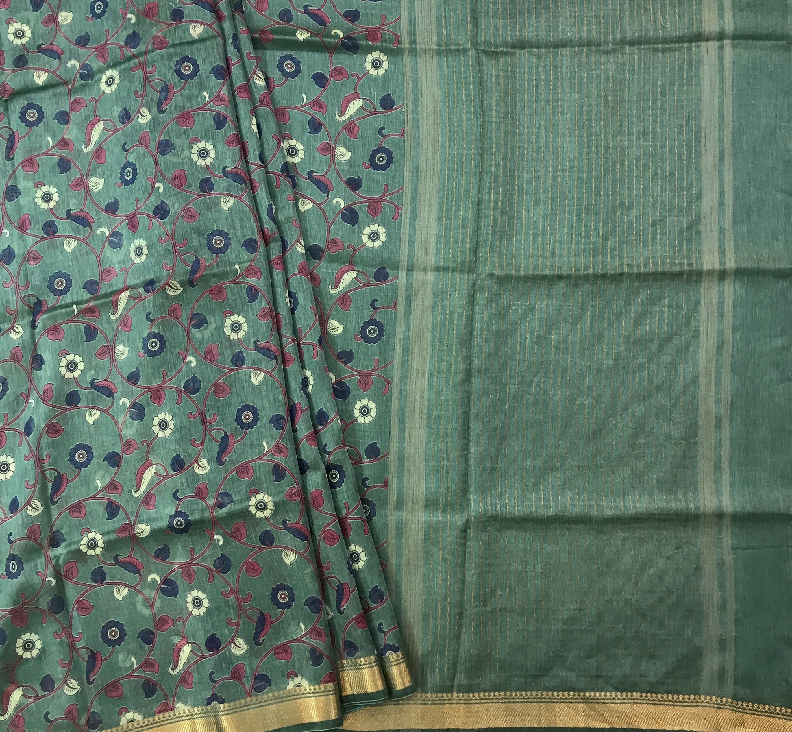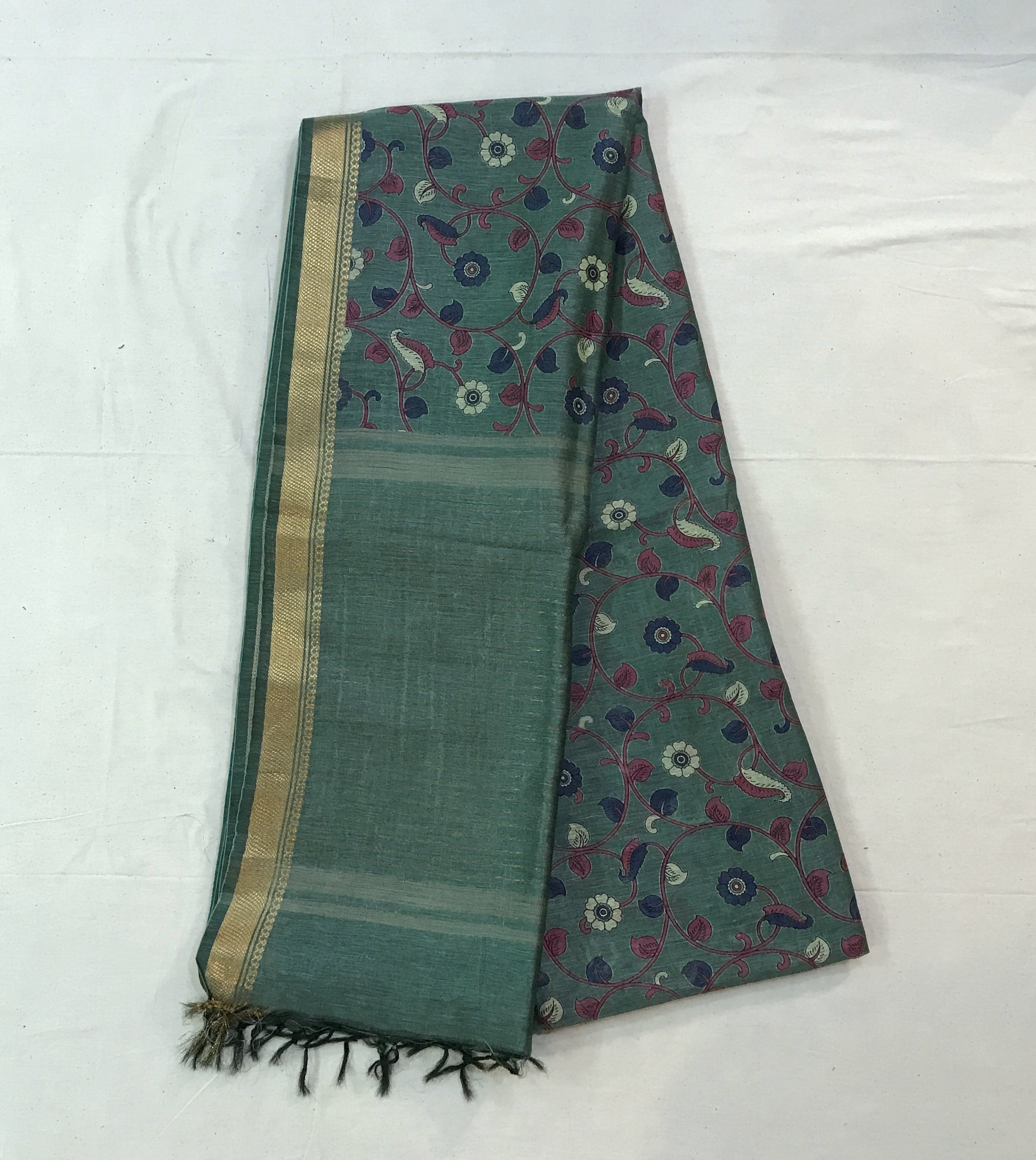 This printed design deep shade of green saree in pure Tussar Silk style saree with self coloured pallu looks fantastic. This saree is light in weight and looks fantastic at corporate events, casual brunches as well as get-togethers.